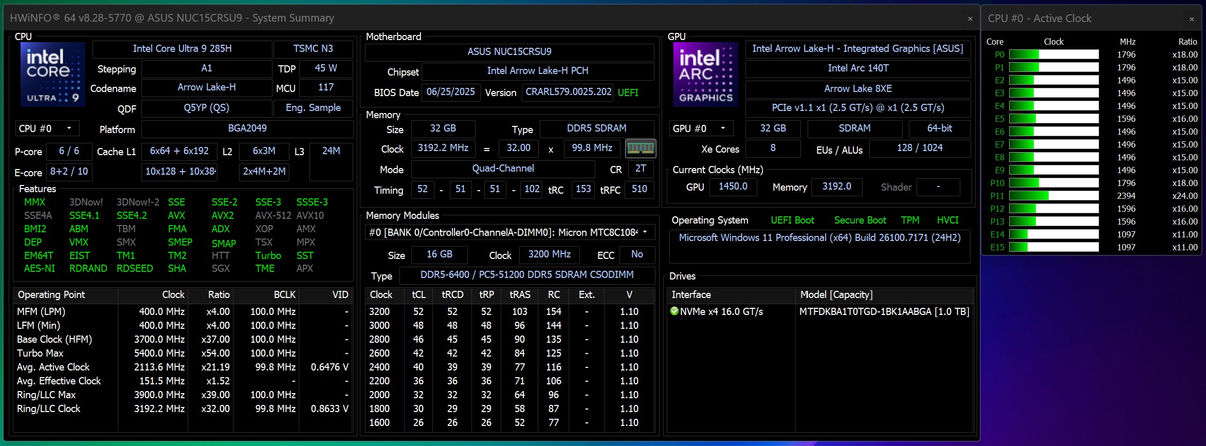 | Asus NUC 15 Pro+ Intel Core Ultra 9 285H ⎘ Intel Arc Graphics 140T ⎘ 32 GB Memória, 1024 GB SSD | Amazon: $1,160.99 Preço de tabela: 991€ | 690 g | 112 x 144 x 42 mm | |