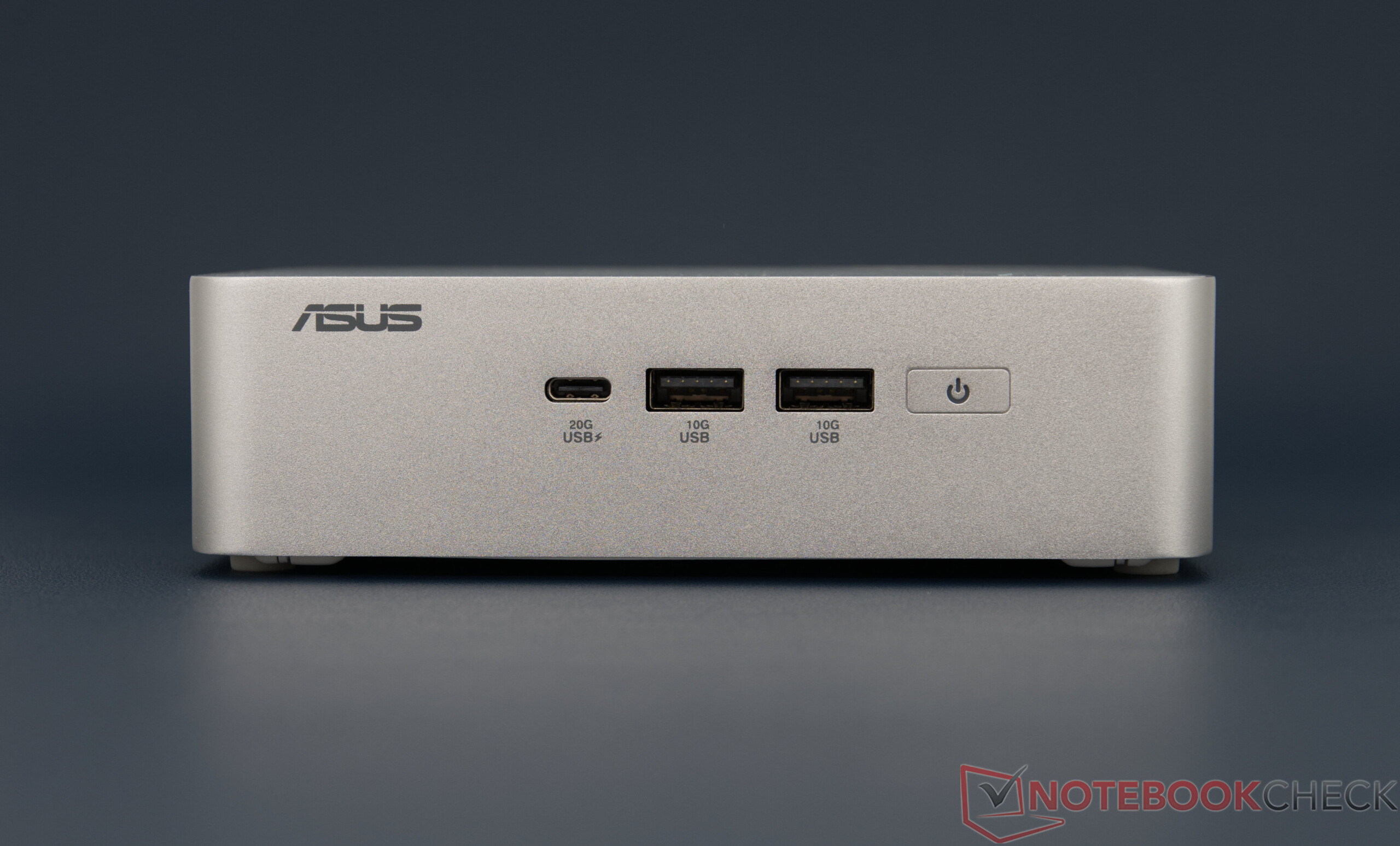 O Asus NUC 15 Pro+ oferece uma boa seleção de portas externas. Há um total de sete portas USB disponíveis - quatro USB-A e três USB-C, sendo que duas portas USB-C suportam Thunderbolt 4 e, portanto, expandem significativamente a gama de funções. A gama é complementada por duas saídas HDMI, uma porta LAN de 2,5 Gbit e Wi-Fi rápido. A distribuição das portas é bem definida e prática.