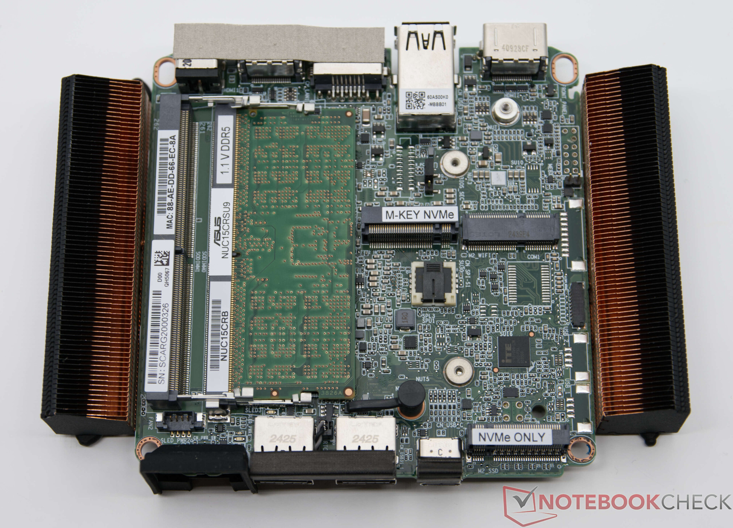 O Asus NUC 15 Pro+ também está disponível como uma versão barebone e pode ser facilmente atualizado pelo usuário. Os componentes podem ser acessados rapidamente pela parte inferior. Em nosso teste, um SSD e dois módulos SO-DIMM já estão instalados. O minicomputador também oferece espaço para um segundo SSD, mas é necessário observar um fator de forma com comprimento máximo de 42 mm.
