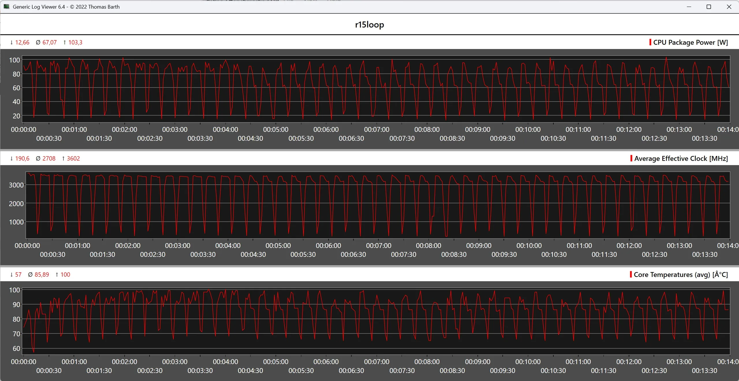 O Asus NUC 15 Pro+ usa o Intel Core Ultra 9 285Hcujas reservas de energia não são artificialmente limitadas pela Asus. Como resultado, o SoC pode ser operado com até 115 watts. Em nosso teste, o sistema alcançou um desempenho muito alto e ficou em primeiro lugar - embora apenas por uma pequena margem - em relação ao GMK EVO-T1. No entanto, o SoC não consegue manter seu desempenho total a longo prazo, como mostram os dados de telemetria do teste de resistência múltipla Cinebench R15. No entanto, o Asus NUC 15 Pro+ oferece um desempenho comparativamente constante sem o declínio significativo no desempenho que ocorre com o Geekom Mini IT15.