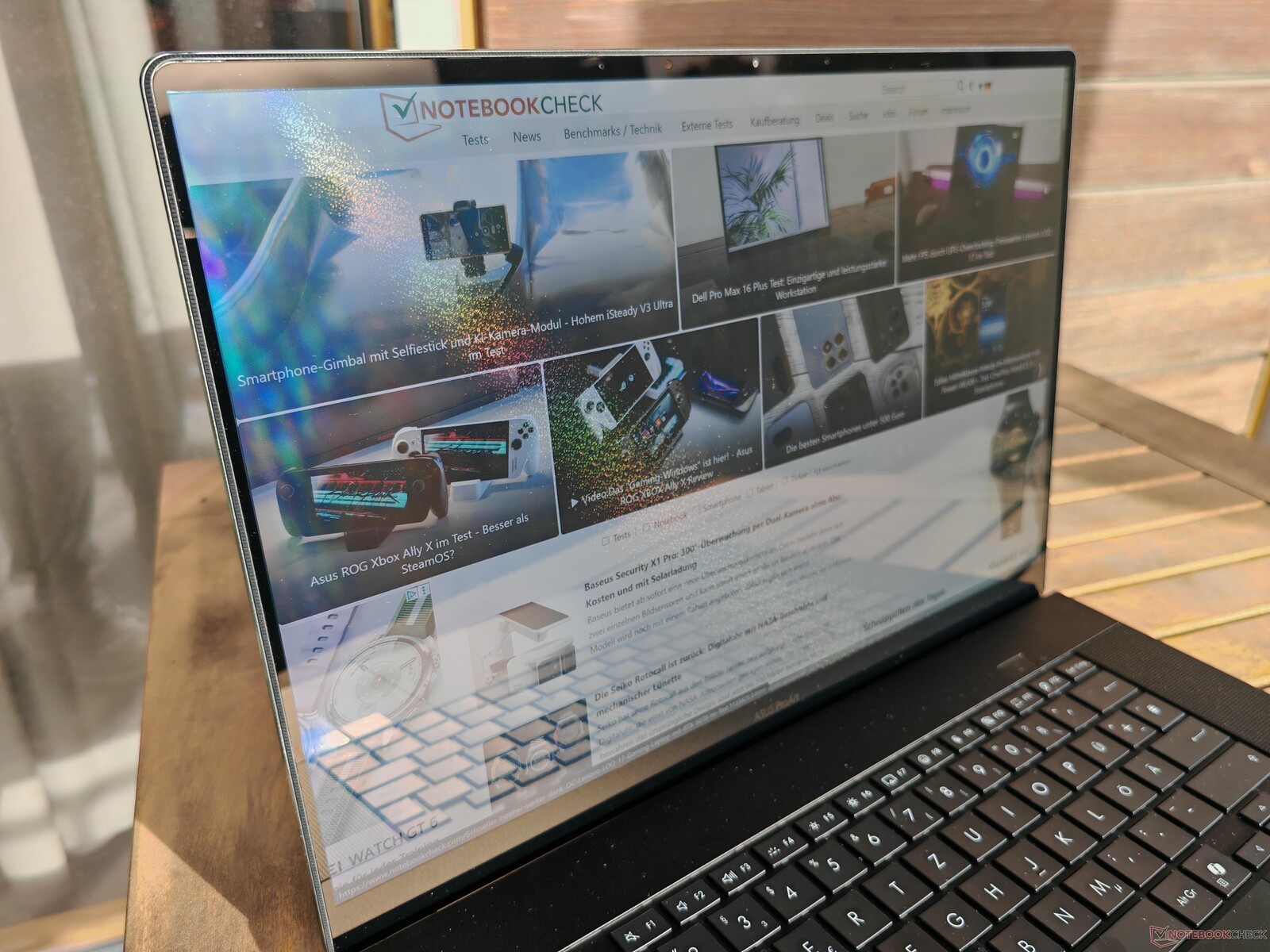 Tanto o ROG Zephyrus G16 quanto o anterior ProArt P16, com seu OLED de 2,8K, não eram particularmente convincentes quando se tratava de brilho. As duas imagens de comparação acima destacam imediatamente a diferença feita pelo aumento do brilho do novo painel Lumina Pro. Em vez de cerca de 360 cd/m², ele agora tem até 660 cd/m² no modo SDR. O MacBook Pro (com o sensor de brilho ativado) e o Yoga Pro 9i 16 conseguem até mesmo cerca de 1.000 cd/m².