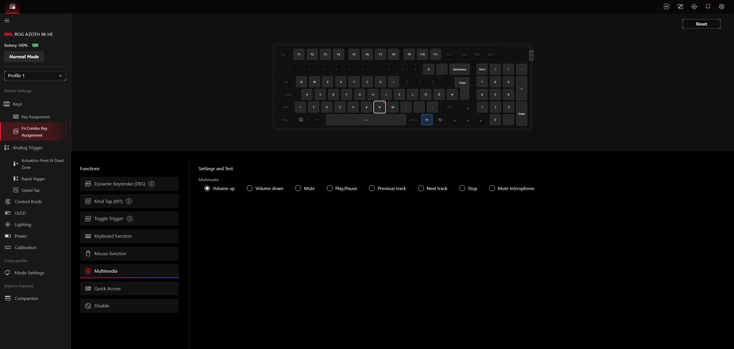 O Asus ROG Azoth 96 HE é gerenciado e configurado por meio do Gear Linkque usa uma interface da Web claramente estruturada. Não é necessário instalar um aplicativo adicional (Gear Link Companion), mas ele habilita algumas funções extras. A gama de opções é extensa - por exemplo, o senhor pode criar vários perfis. Funções diferentes podem ser atribuídas a quase todas as teclas, e ações separadas para tocar e manter pressionadas também são suportadas. Além disso, diferentes funções podem ser acionadas dependendo da distância em que uma tecla é pressionada. As teclas Fn podem ser usadas para atribuir controles multimídia, entre outras coisas. O Gear Link também suporta a definição de um ponto de atuação individual para cada tecla.