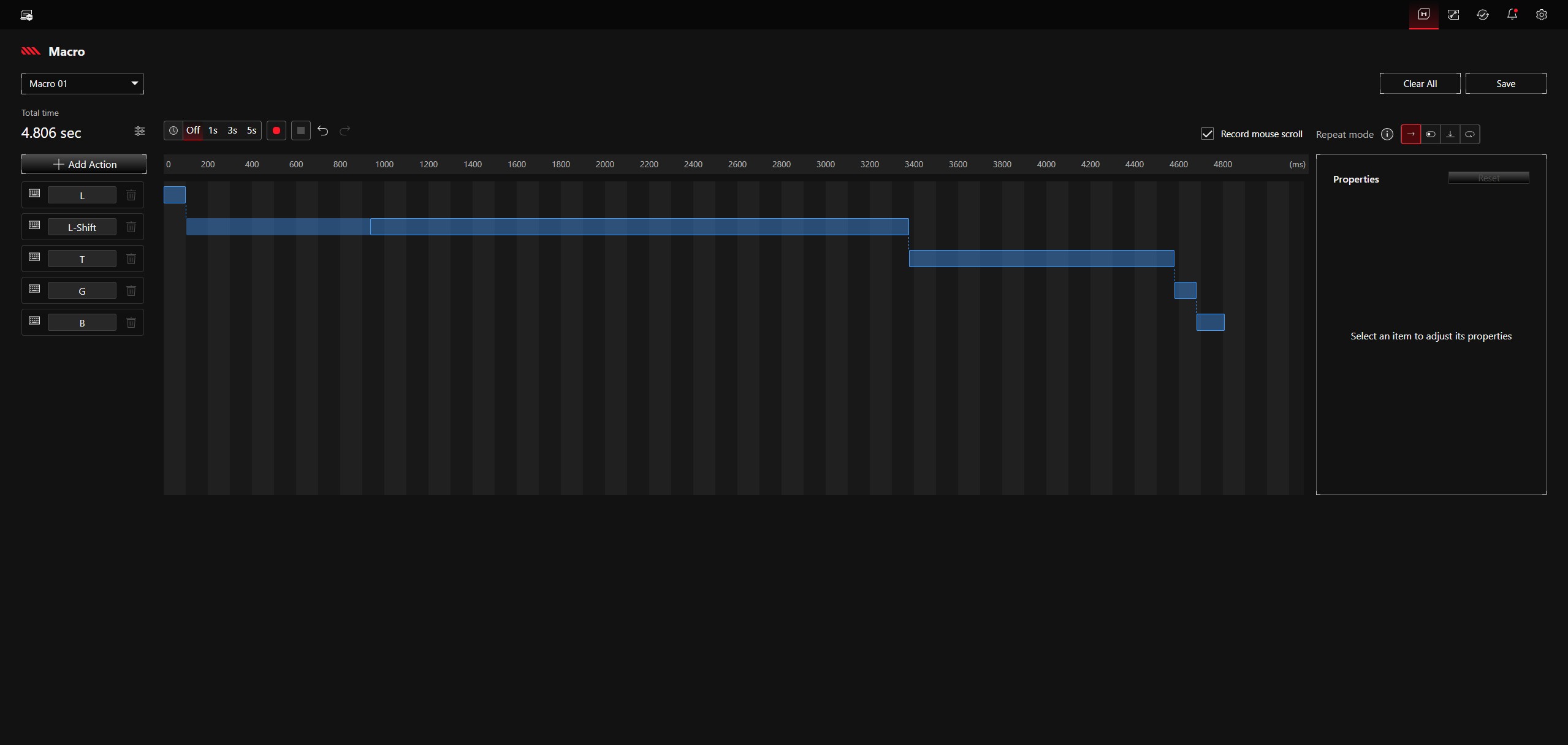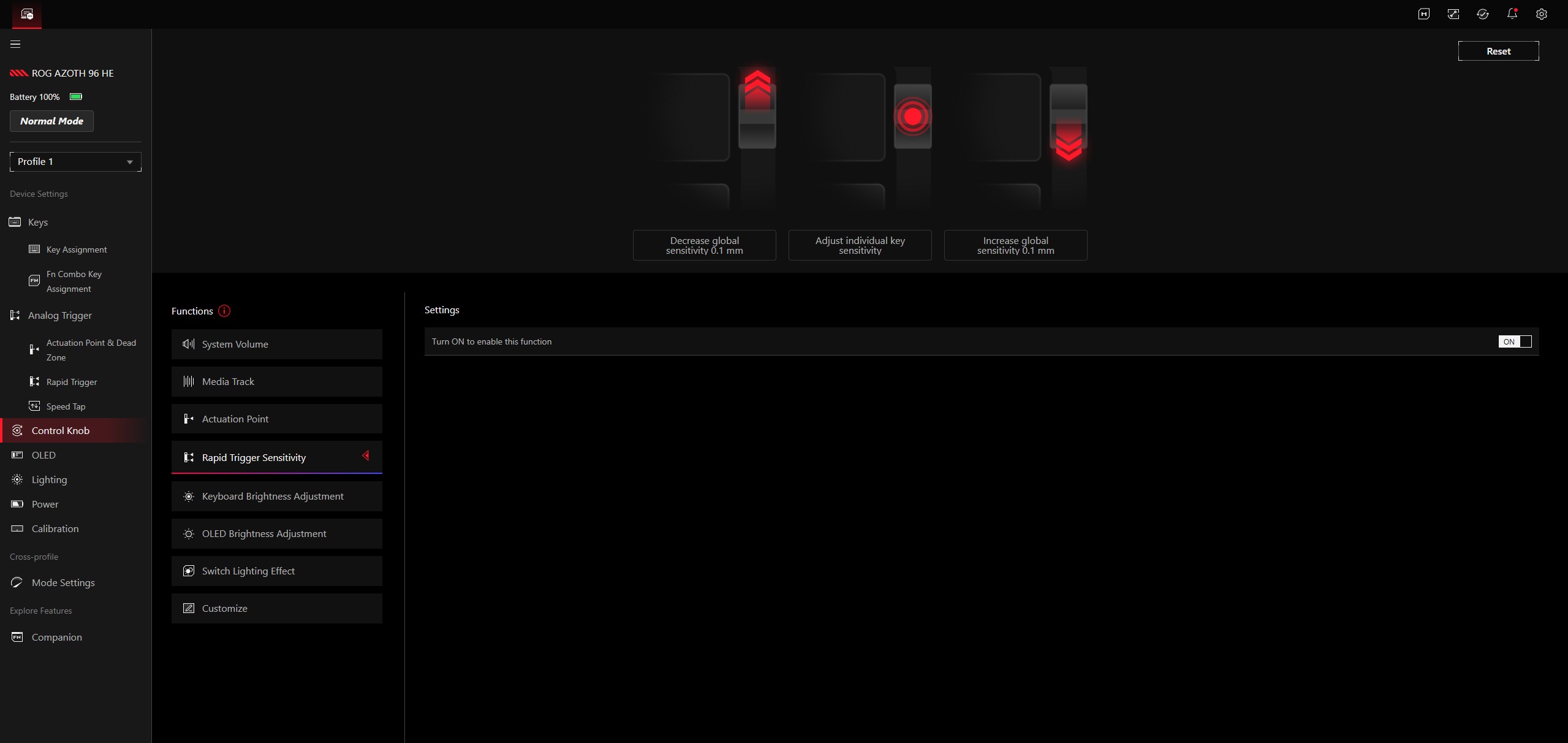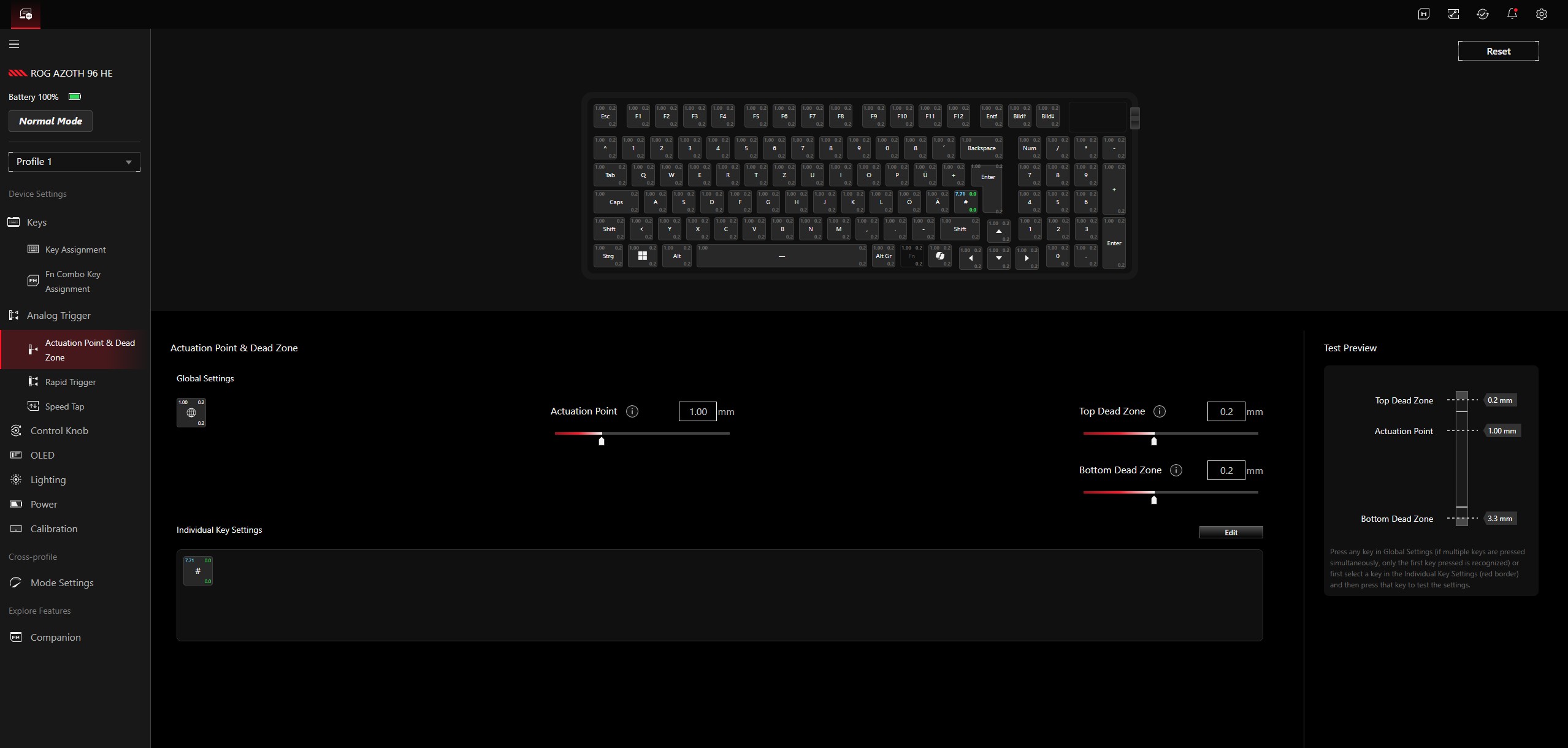 O ROG Azoth 96 HE tem um desempenho excelente no uso diário, em aplicativos produtivos e em jogos. Recomendamos explicitamente que o senhor dedique algum tempo para definir a profundidade de atuação ideal - essa capacidade de ajuste é uma grande vantagem em relação a um teclado convencional e possibilita, na prática, encontrar o melhor equilíbrio entre a atuação rápida e a prevenção de entradas acidentais. O ponto de atuação pode ser ajustado em passos de 0,01 mm em uma faixa de 0,1 a 3,5 mm.