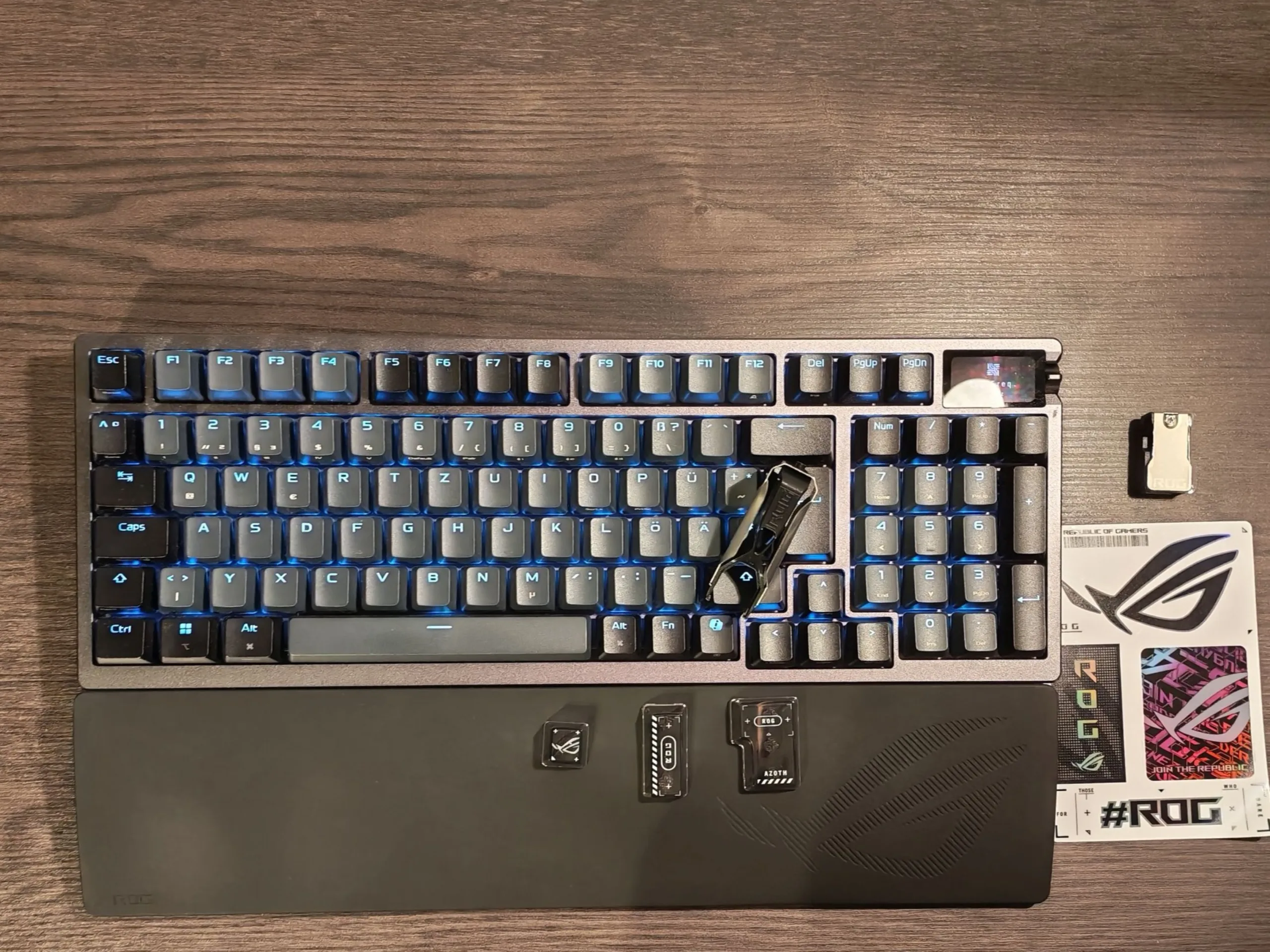 Na caixa, a Asus inclui um descanso para o pulso, um cabo USB Type-C, um adaptador USB, um cabo de extensão para o receptor USB, uma tecla de controle para substituir a tecla Copilot e três teclas adicionais transparentes no layout ROG. Há também ferramentas para remover as capas de teclas e os interruptores - essas duas ferramentas podem ser encaixadas juntas. A configuração é extremamente simples e pode ser feita via USB, Bluetooth ou pelo receptor sem fio incluído, que pode ser armazenado dentro do teclado quando não estiver em uso. Não é necessário instalar nenhum software, nem mesmo para as opções de configuração mais abrangentes - mas falaremos mais sobre isso adiante.