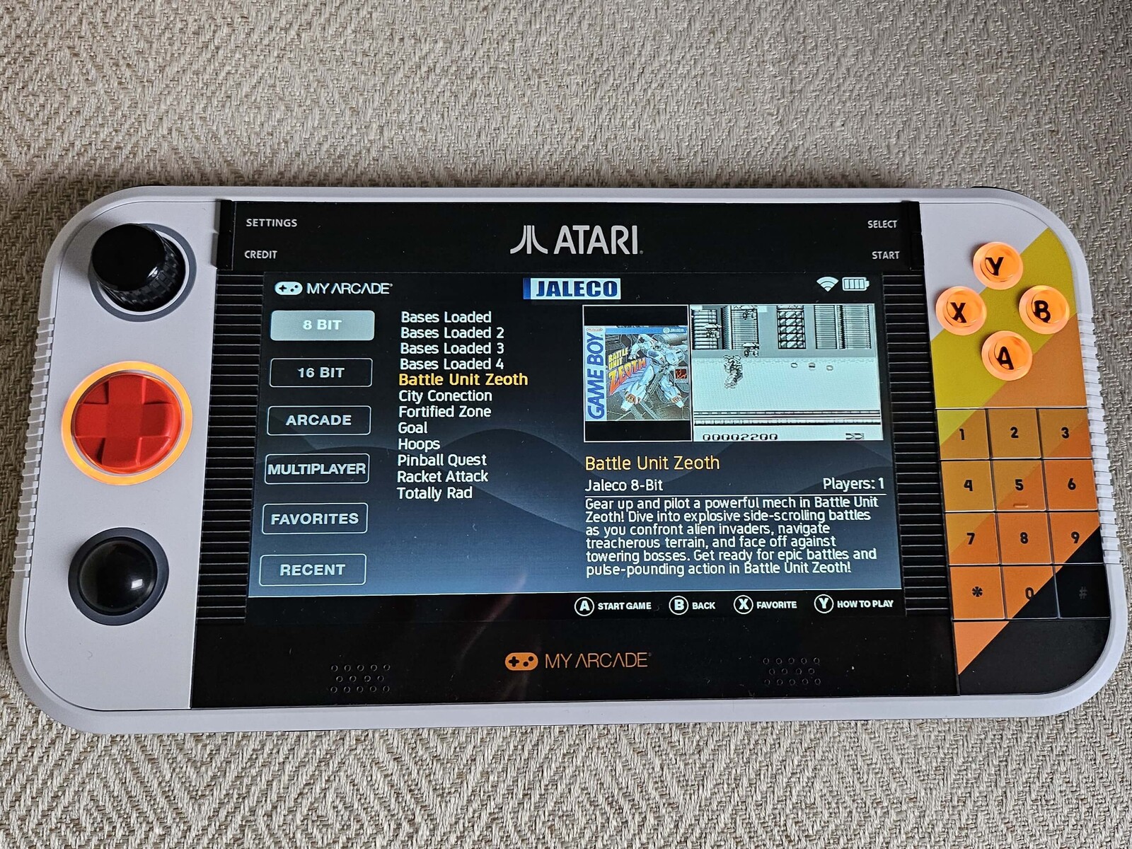 Os 200 jogos integrados atendem a uma ampla gama de jogadores e realmente oferecem algo para todos. Além dos títulos da própria Atari, o sistema inclui vários jogos da Piko e da Jaleco, embora não esteja claro por que essas seleções específicas foram escolhidas. Cada título é exibido no menu com sua arte de capa original - por exemplo, a versão para Game Boy de Battle Unit Zeoth - juntamente com um vídeo curto de reprodução automática e uma descrição em inglês. O menu principal é dividido em categorias, como Atari Recharged, Atari, Balls of Steel, Pac-Man, Jaleco, Piko e Settings. Os submenus organizam ainda mais a biblioteca em 8 bits, 16 bits, Arcade, Multijogador, Favoritos e Jogados recentemente. Qualquer pessoa familiarizada com front-ends como o RetroArch ou o Retro Deck se sentirá em casa: tudo está bem estruturado e é iniciado rapidamente.