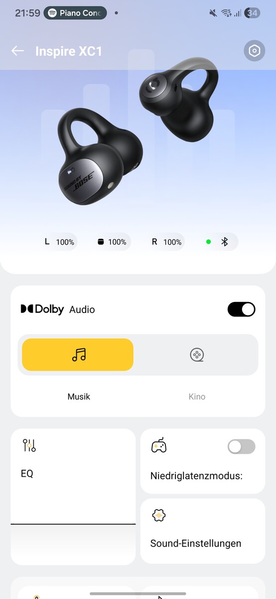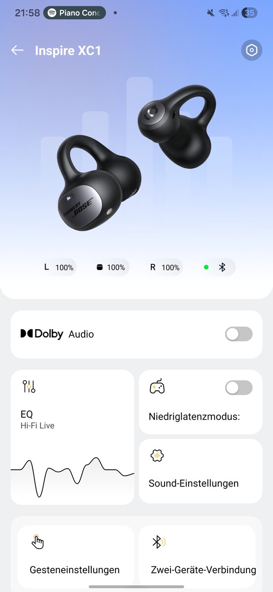 Com o Inspire XC1, a Baseus oferece fones de ouvido de encaixe aberto com uma qualidade de som muito boa. Sua forte capacidade de ajuste em diferentes estilos musicais é especialmente impressionante. o "Bose Sound" é simplesmente uma predefinição do equalizador, mas o XC1 também oferece conectividade multiponto, Dolby Audio e LDAC. Infelizmente, essas opções de som não podem ser usadas ao mesmo tempo.