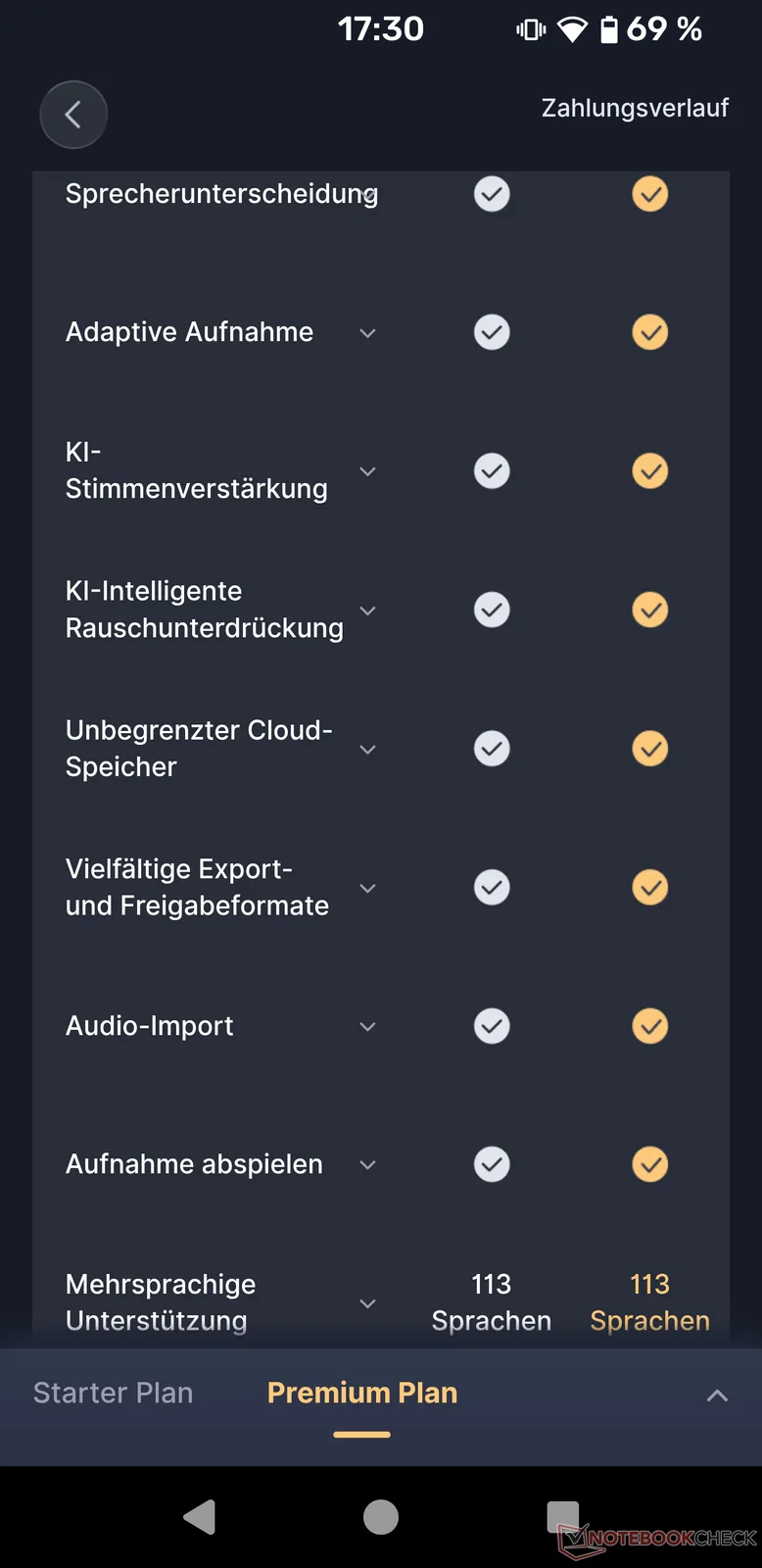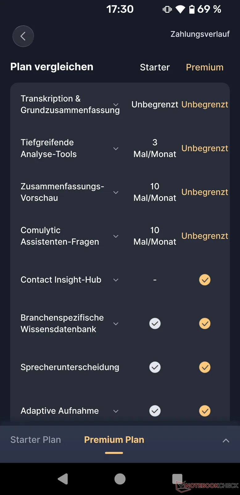 Os dois gravadores de IA, Comulytic Note Pro e Plaud Note, são muito semelhantes em termos de design: tamanho, capacidade da bateria e muito mais são idênticos. Enquanto o Plaud tem um botão físico que deve ser pressionado para iniciar a gravação, o Comulytic tem um botão de toque. A diferença mais significativa está no modelo de pagamento: enquanto os usuários do Plaud Note precisam pagar por minuto após 300 minutos por mês para receber transcrições, os usuários do Comulytic Note Pro podem fazer quantas transcrições quiserem. No entanto, há também um modelo de assinatura chamado "Premium" Isso permite adicionar pontos importantes a uma conversa: quando o usuário insere termos, eles são destacados em amarelo no resumo, o que facilita ainda mais o uso, mas provavelmente não é um recurso obrigatório para muitos usuários.
