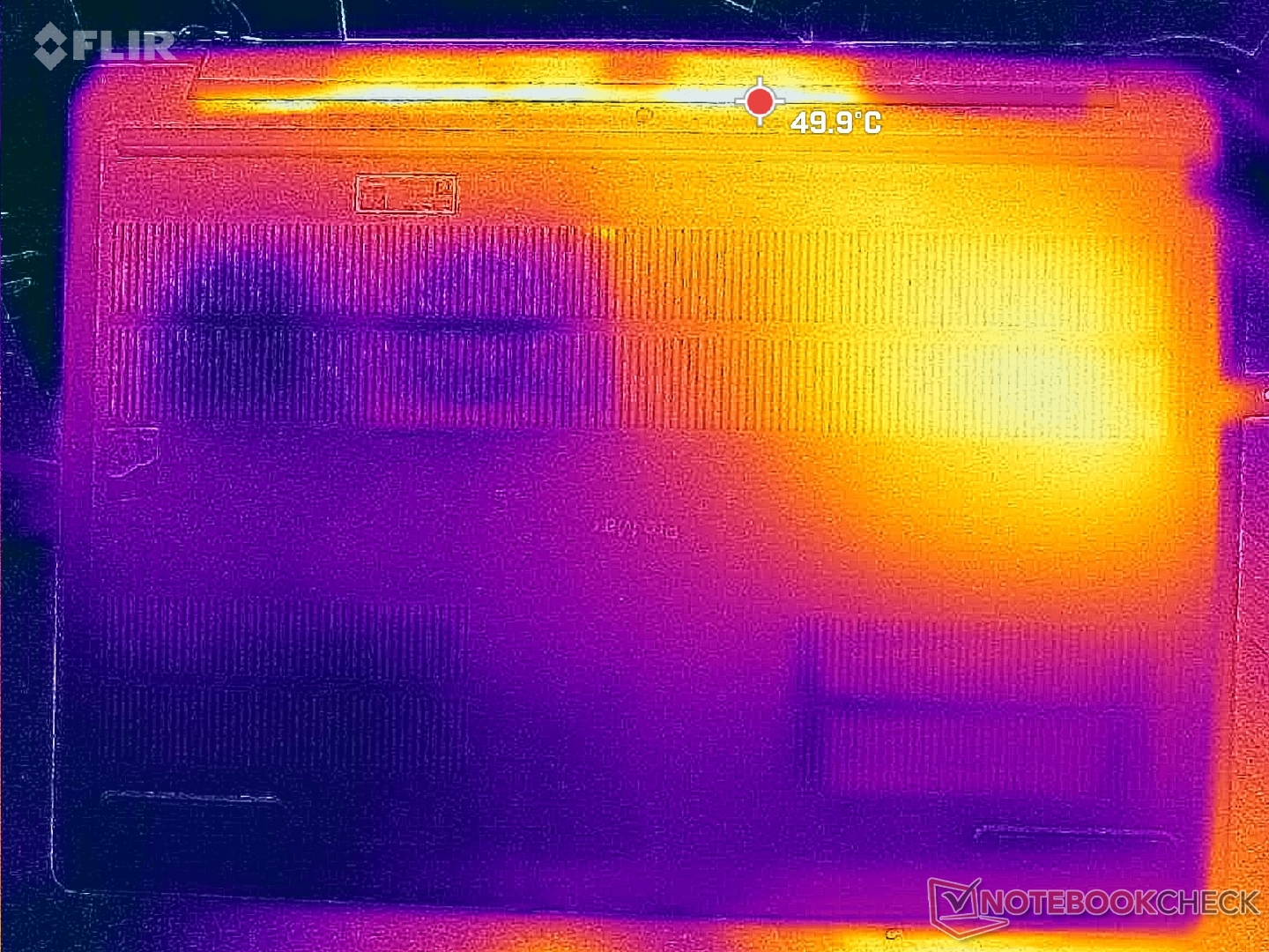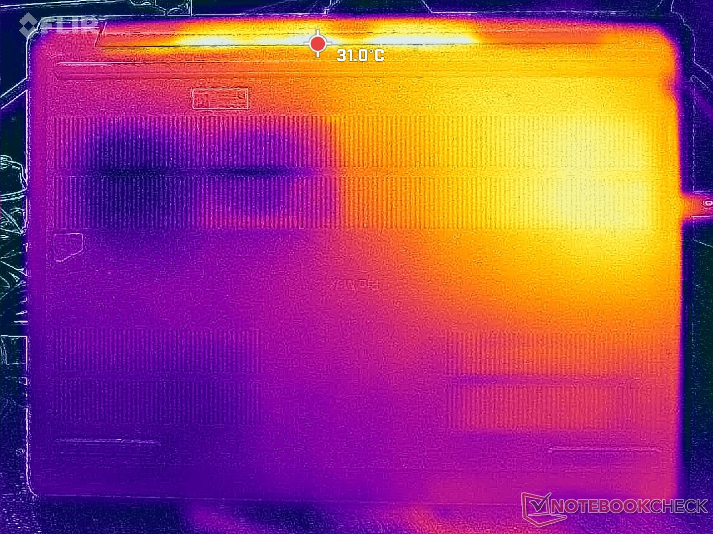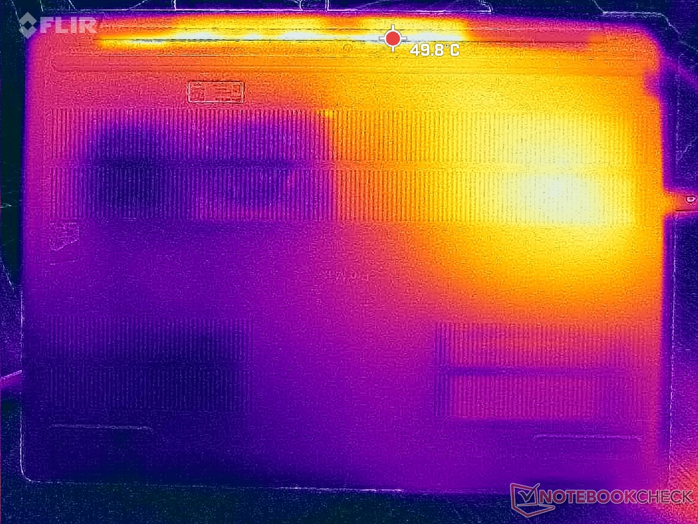 As temperaturas da superfície são quase sempre quentes, independentemente da carga na tela, provavelmente devido aos ventiladores letárgicos e às peças de alto desempenho. A metade esquerda do chassi fica visivelmente mais quente do que a direita devido à solução de resfriamento assimétrica.