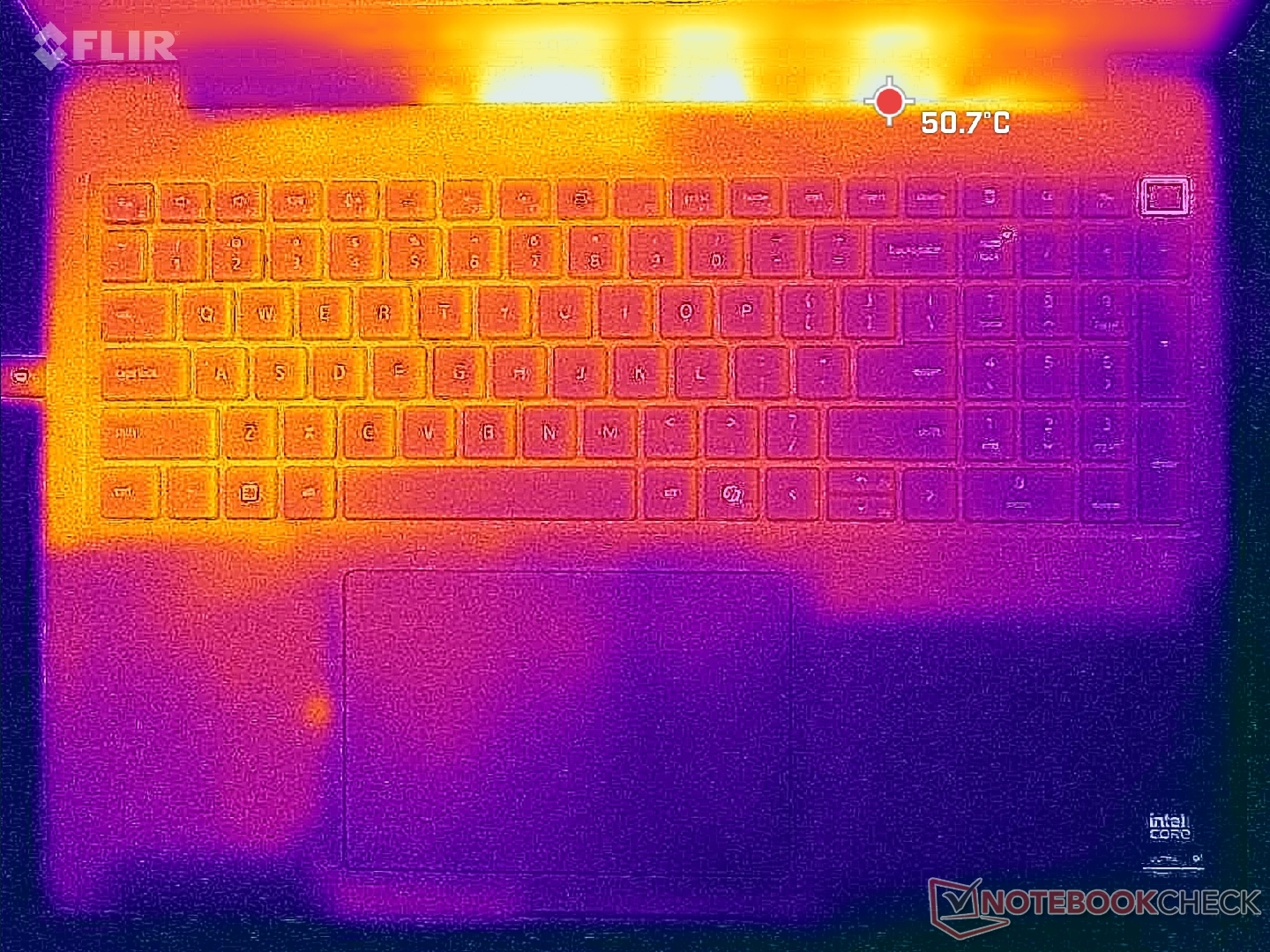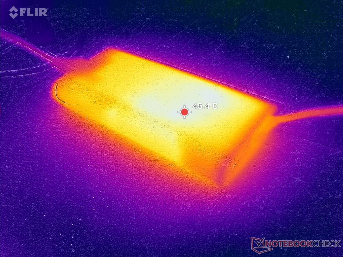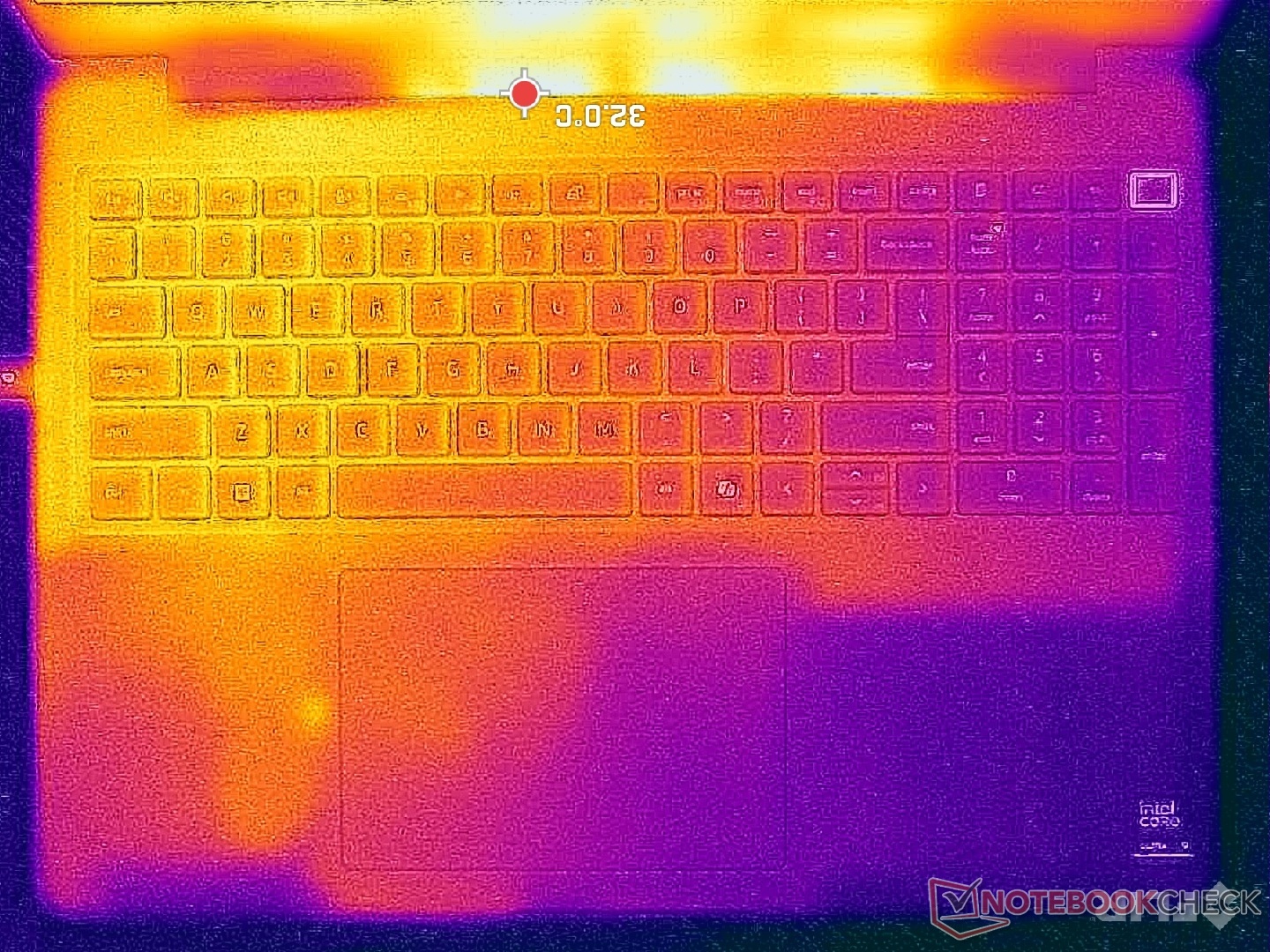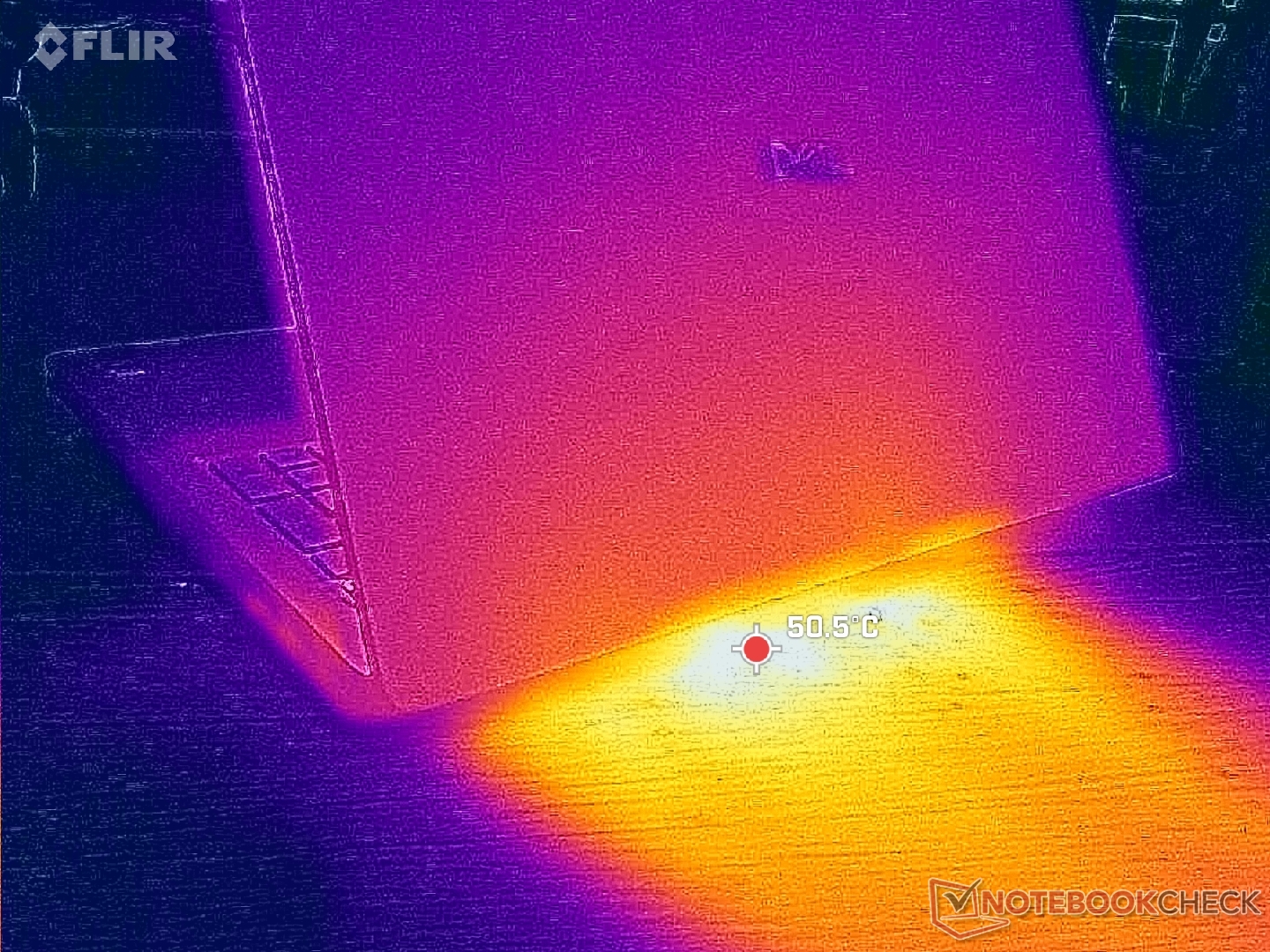 As temperaturas da superfície são quase sempre quentes, independentemente da carga na tela, provavelmente devido aos ventiladores letárgicos e às peças de alto desempenho. A metade esquerda do chassi fica visivelmente mais quente do que a direita devido à solução de resfriamento assimétrica.