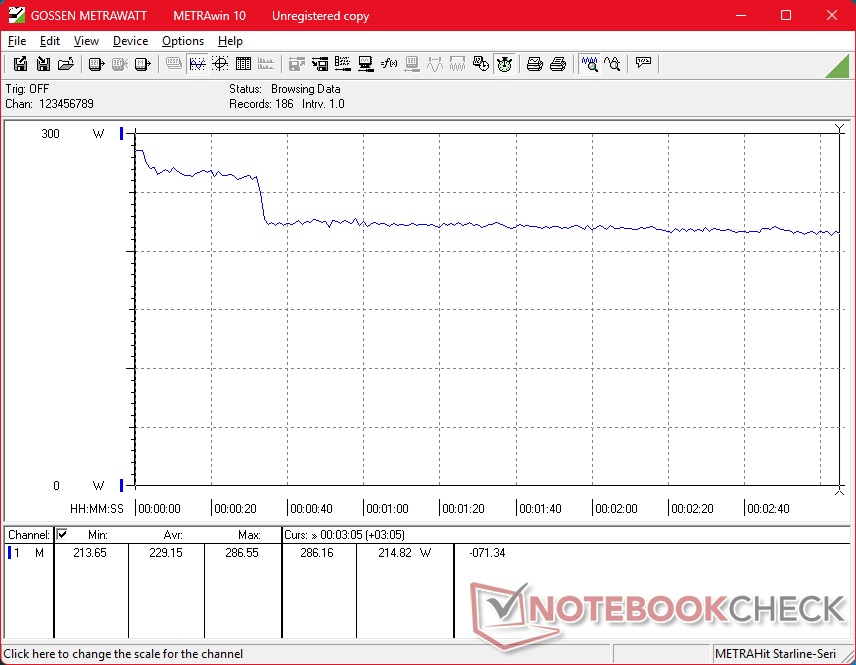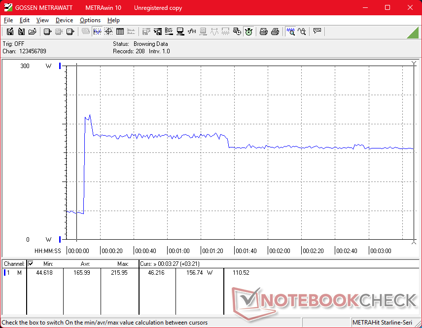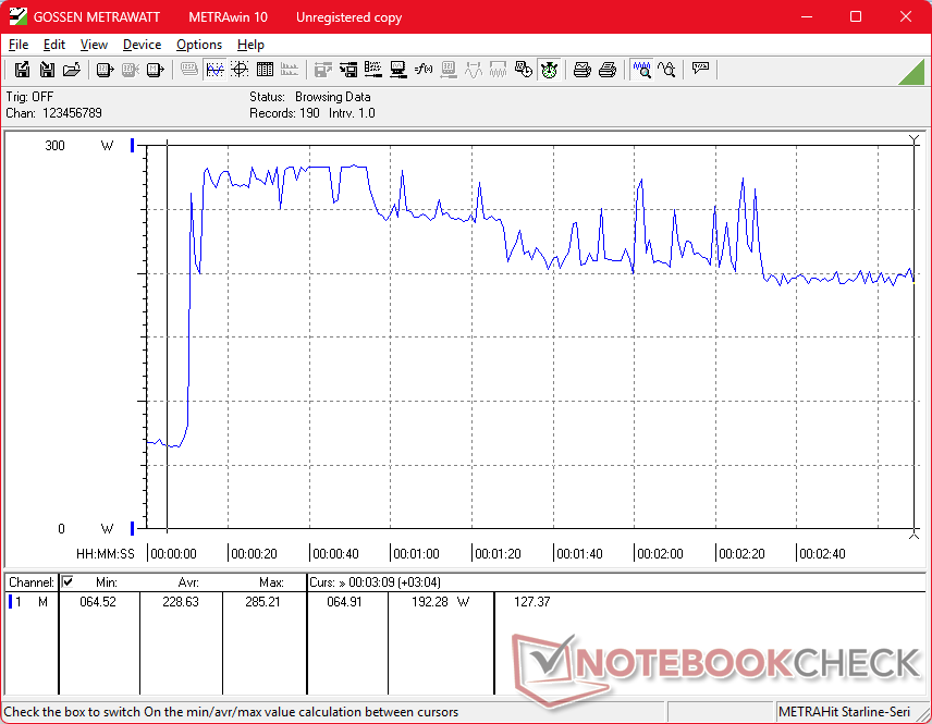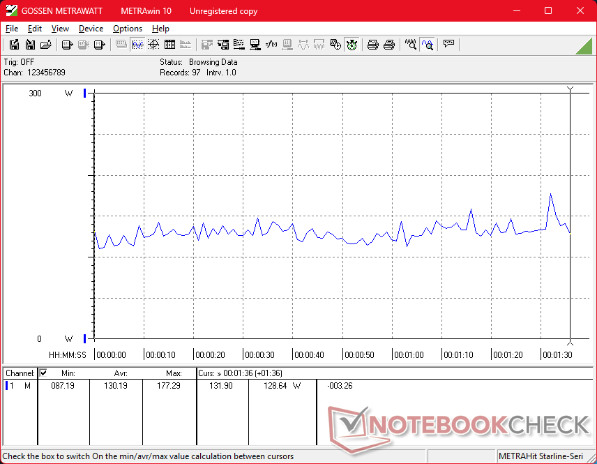 As desvantagens são geralmente pequenas. O consumo de energia agora é maior do que antes, com até 280 W, em comparação com 240 W ou menos no Precision 7680. Portanto, embora o Pro Max 16 Plus seja certamente mais potente, ele também exige mais da solução de resfriamento e, em geral, a duração da bateria é menor. A temperatura da CPU, em particular, pode atingir a faixa de 95 C a 105 C quando estressada, o que afeta o desempenho do Turbo Boost do sistema. Enquanto isso, a GPU tende a se estabilizar em 125 W, apesar de ser classificada para até 175 W. Portanto, é provável que a mesma CPU e GPU funcionem mais rapidamente em formatos mais espessos ou maiores, como o Pro Max 18 Plus de 18 polegadas. No entanto, o sistema Pro Max 16 Plus é uma das estações de trabalho mais rápidas e práticas disponíveis, apesar das restrições da solução de resfriamento.