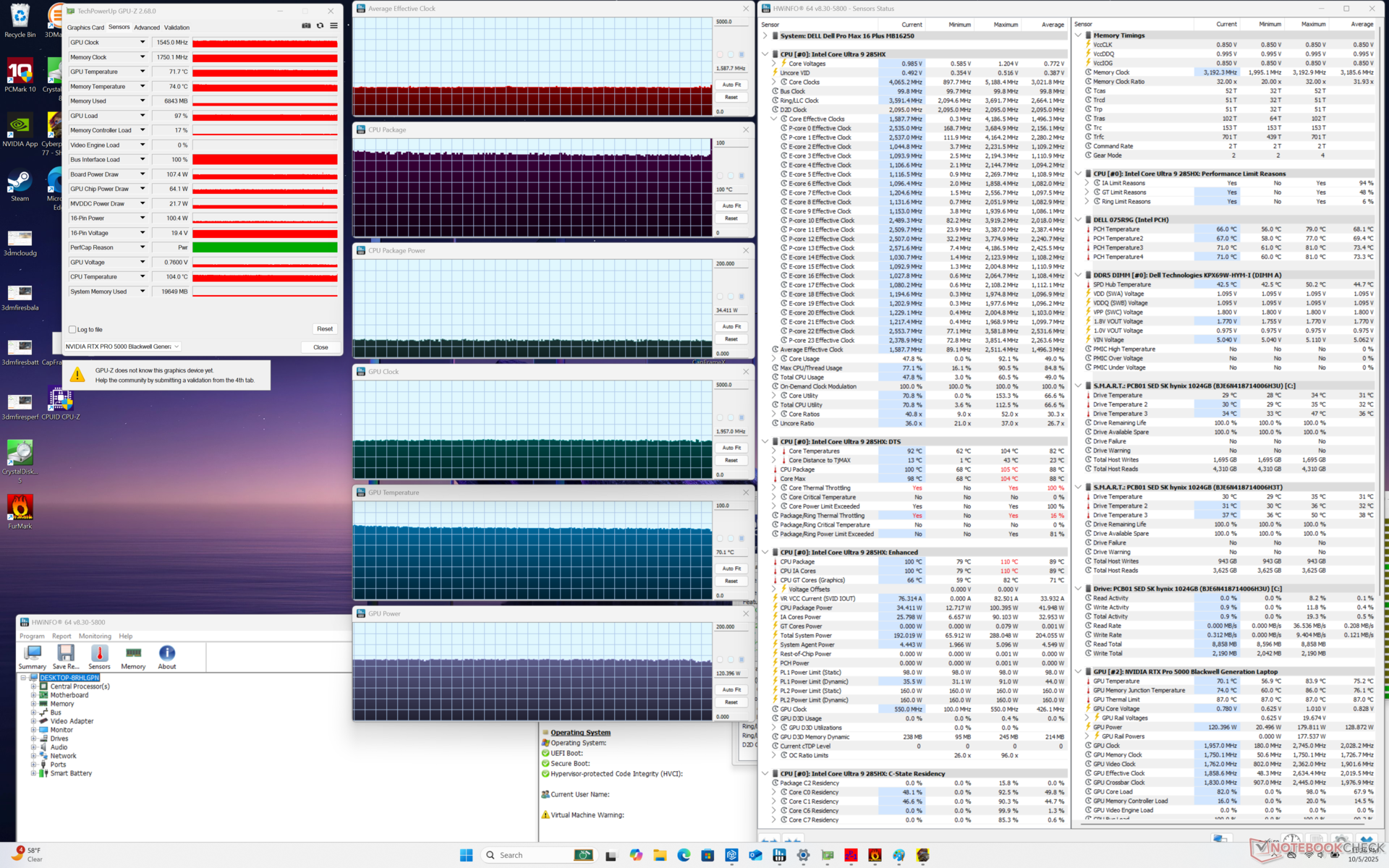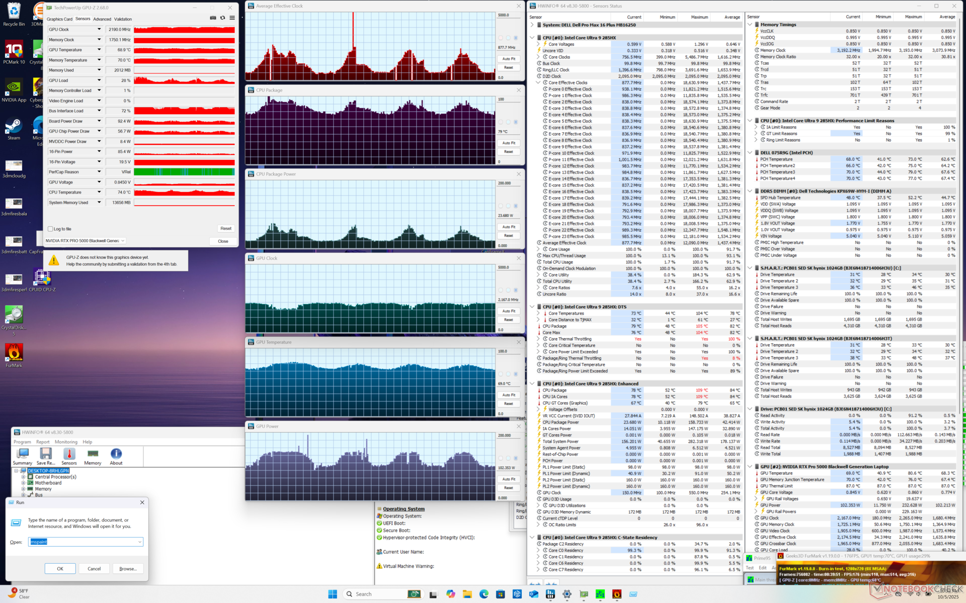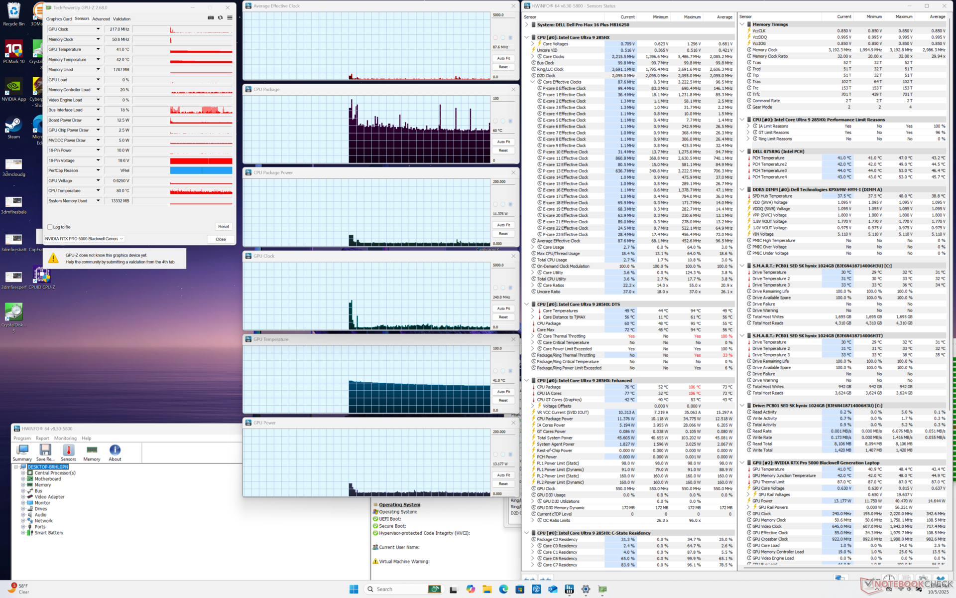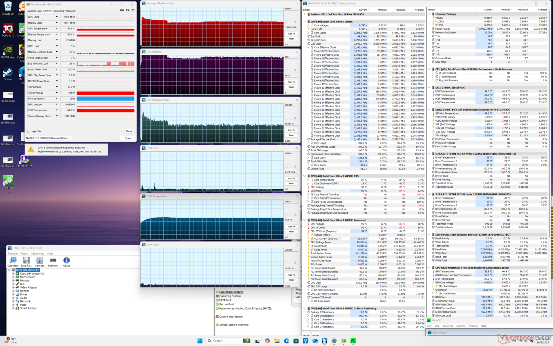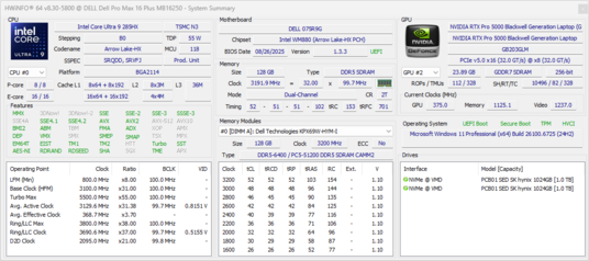 | Dell Pro Max 16 Plus Ultra 9 285HX, RTX PRO 5000 Blackwell Generation Laptop, SK hynix PCB01 HFS001TFM9X186N, OLED, 3840x2400, 16" | Dell Precision 5690 Ultra 9 185H, RTX 5000 Ada Generation Laptop, 2x Samsung PM9A1 1TB (RAID 0), OLED, 3840x2400, 16" | Dell Precision 5000 5680 i9-13900H, RTX 5000 Ada Generation Laptop, 2x SK hynix PC801 HFS512GEJ9X101N RAID 0, OLED, 3840x2400, 16" | Lenovo ThinkPad P16 Gen 2 i7-14700HX, RTX 4000 Ada Generation Laptop, SK hynix PC801 HFS001TEJ9X162N, IPS, 2560x1600, 16" | Lenovo ThinkPad P1 Gen 7 21KV001SGE Ultra 7 155H, GeForce RTX 4060 Laptop GPU, Kioxia XG8 KXG8AZNV1T02, IPS LED, 2560x1600, 16" | HP ZBook Studio 16 G11 Ultra 9 185H, RTX 3000 Ada Generation Laptop, Kioxia XG8 KXG80ZNV1T02, IPS, 3840x2400, 16" | MSI CreatorPro Z16P B12UKST i7-12700H, RTX A3000 Laptop GPU, Samsung PM9A1 MZVL21T0HCLR, IPS, 2560x1600, 16" | |
