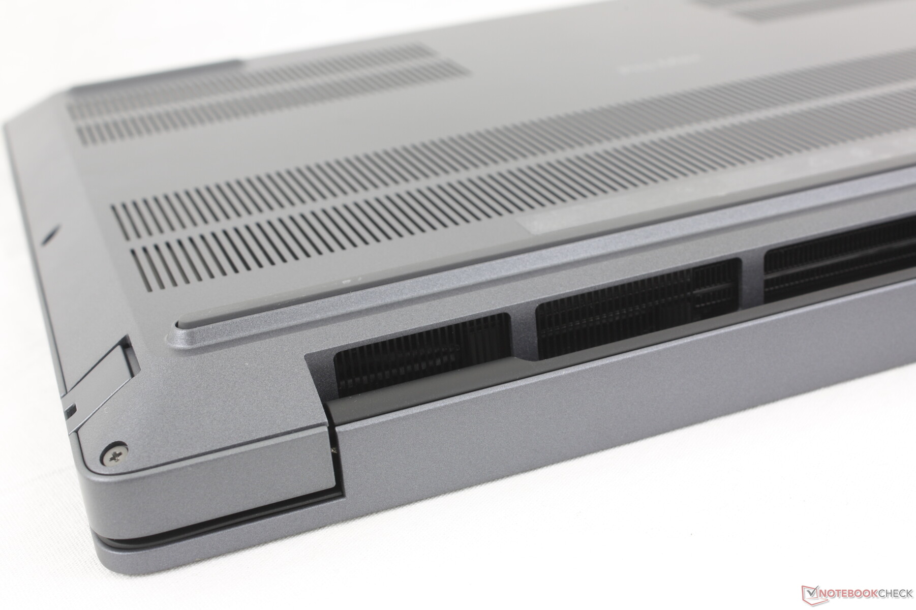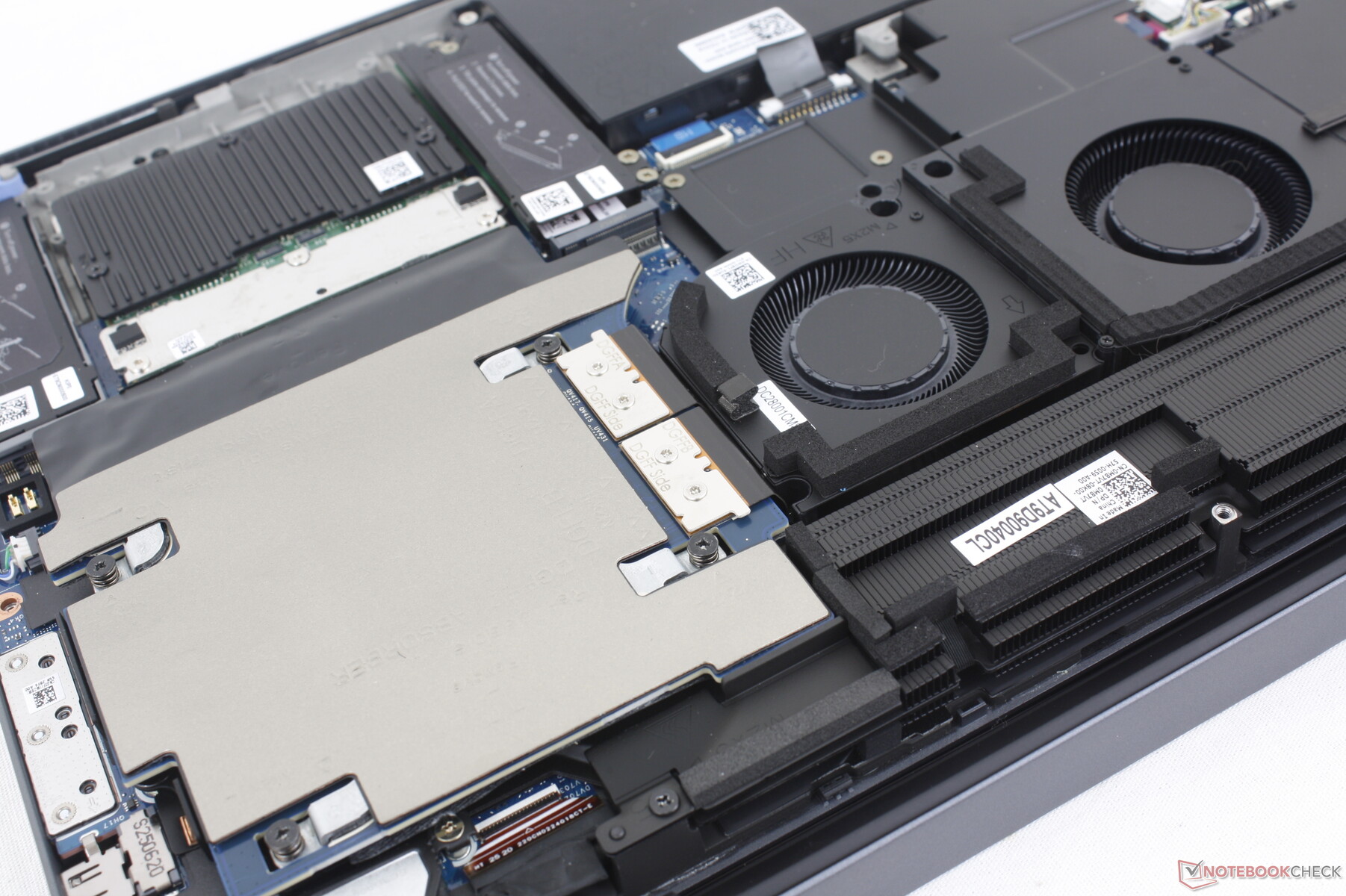 O painel inferior requer apenas uma chave de fenda Phillips para ser removido, facilitando o acesso aos componentes internos. O módulo CAMM2, os dois slots de SSD M.2 2280, o módulo WLAN e a placa gráfica (DGFF) são todos removíveis.