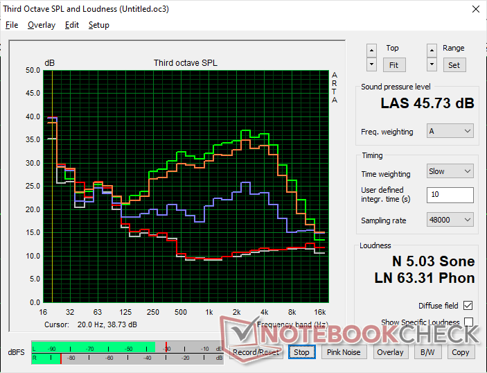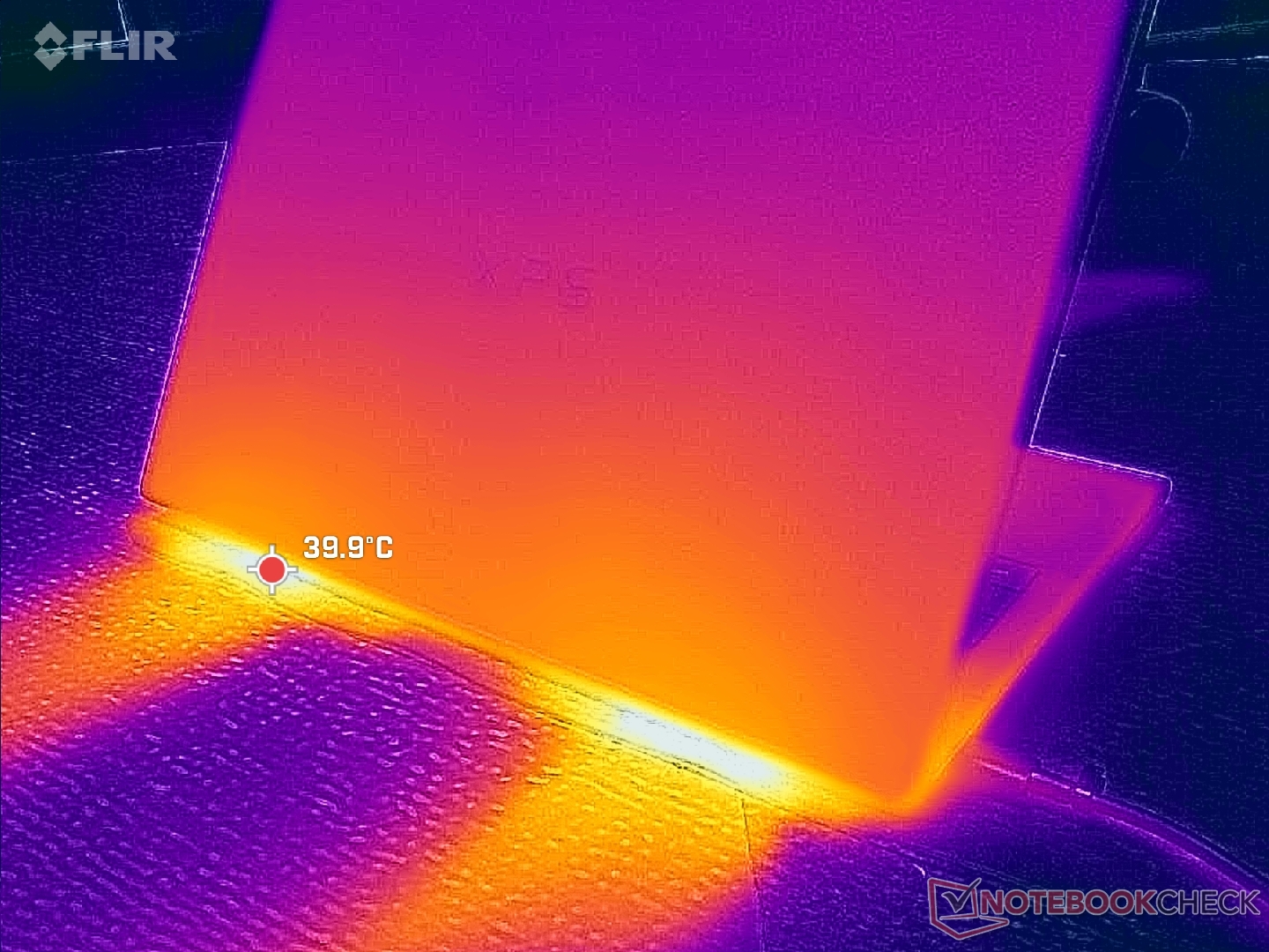 As temperaturas da superfície são um pouco mais quentes do que as registradas no Dell 14 Premium 2025, especialmente na parte inferior (tampa D) ao executar cargas mais exigentes. O ponto quente atingiria 36 C a 39 C em comparação com 34 C no design do ano passado. As diferenças são mínimas e não são quentes o suficiente para distrair o usuário durante o uso.