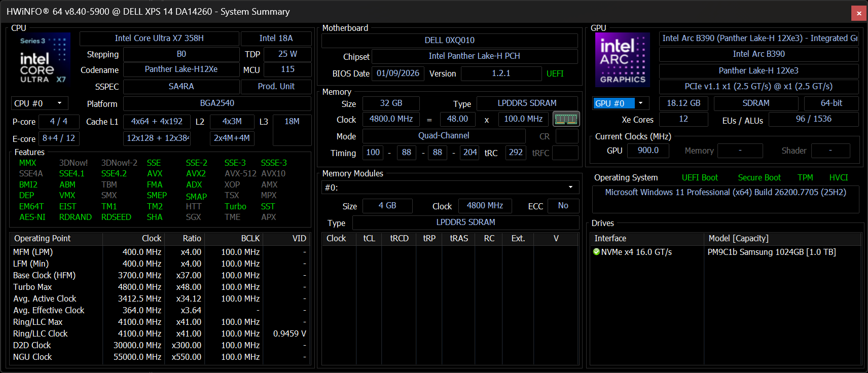 | Dell XPS 14 Core Ultra X7 358H Ultra X7 358H, Arc B390 Panther Lake iGPU, Samsung PM9C1b MZVL81T0HFLB-00BH1, OLED, 2880x1800, 14" | Dell 14 Premium Ultra 7 255H, Arc 140T, Kioxia BG6 KBG6AZNV1T02, OLED, 3200x2000, 14.5" | Dell XPS 14 2024 OLED Ultra 7 155H, GeForce RTX 4050 Laptop GPU, Samsung PM9A1 MZVL21T0HCLR, OLED, 3200x2000, 14.5" | Asus ExpertBook Ultra B9406CAA Ultra X7 358H, Arc B390 Panther Lake iGPU, Samsung PM9E1 MZVLC2T0HBLD, OLED, 2880x1800, 14" | Lenovo Yoga Pro 7 14IAH10 Ultra 9 285H, Arc 140T, WD PC SN7100S SDFPMSL-1T00-1101, OLED, 3000x1876, 14.5" | HP EliteBook X G1i 14 AI Core Ultra 7 268V, Arc 140V, Kioxia XG8 KXG80ZNV512G, IPS, 1920x1200, 14" | |