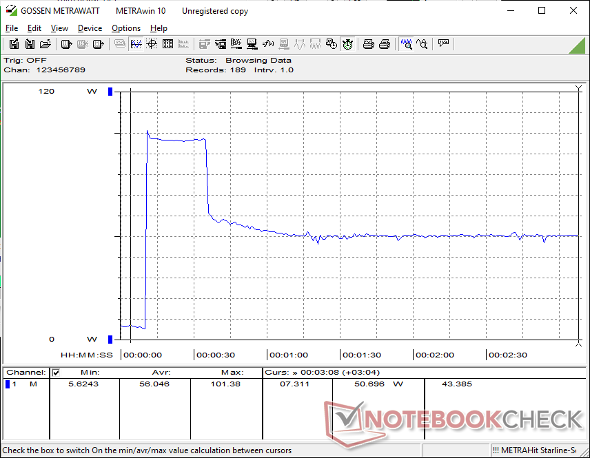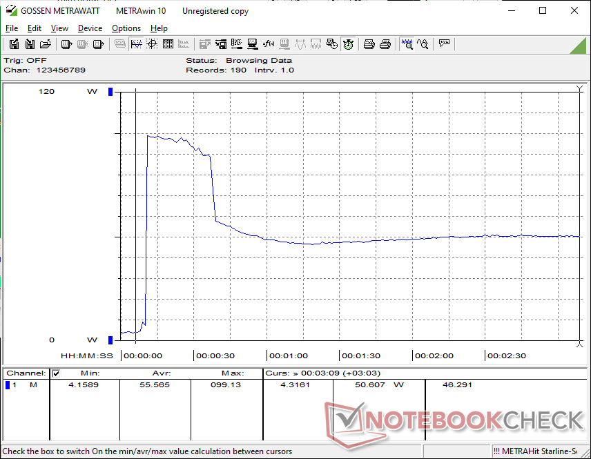 Conseguimos registrar um consumo máximo temporário de 102 W do pequeno adaptador CA USB-C de 100 W (~10,2 x 5,5 x 2,2 cm) quando a CPU está totalmente estressada, o que é muito mais alto do que no XPS 14 de 2025 em condições semelhantes. O limite máximo de energia mais alto exemplifica o limite máximo do Turbo Boost do Panther Lake-H quando comparado ao Arrow Lake-H.