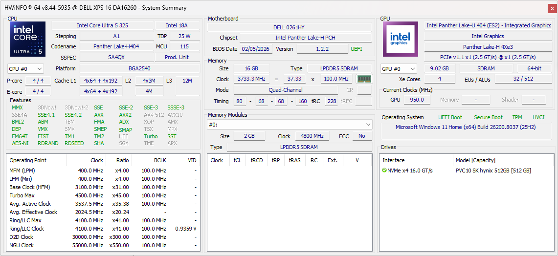 | Dell XPS 16 Core Ultra 5 325 Intel Core Ultra 5 325 ⎘ Intel Graphics 4 Xe3 Panther Lake iGPU ⎘ 16 GB Memória, 512 GB SSD | Amazon: 1. $2,229.99 Dell XPS 16 9640 Laptop | In... 2. $1,389.98 Dell 16 Plus Touchscreen Lap... 3. $1,899.00 Dell XPS 16 9640 16.3" Touch... Preço de tabela: 1600 USD | 1.7 kg | 15.4 mm | 16.00" 1920x1200 142 PPI IPS | |