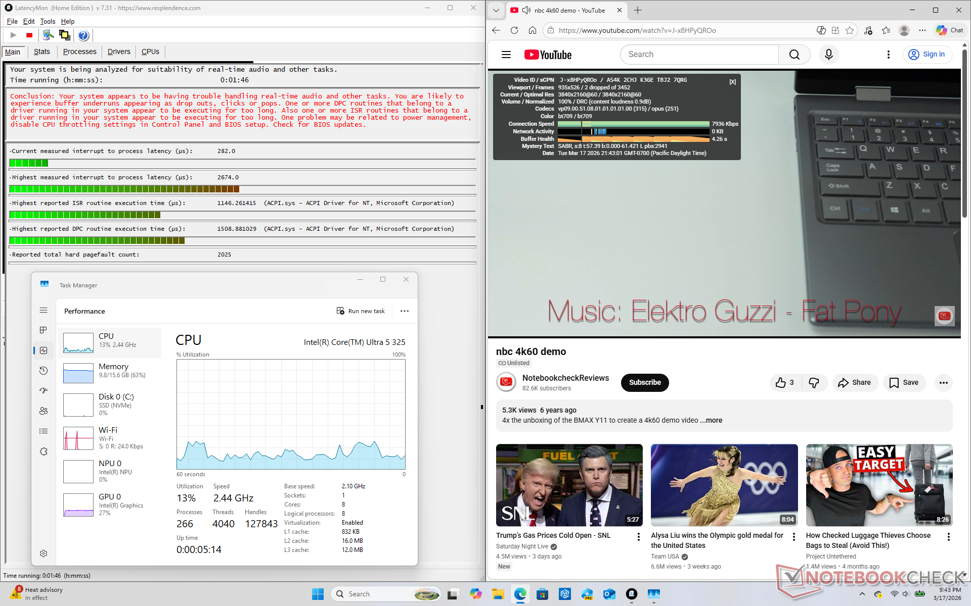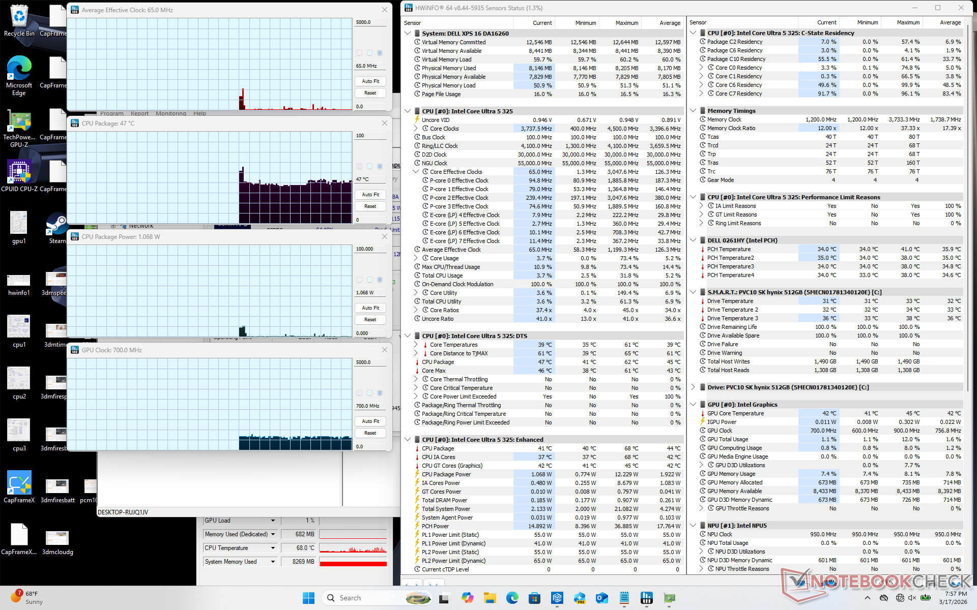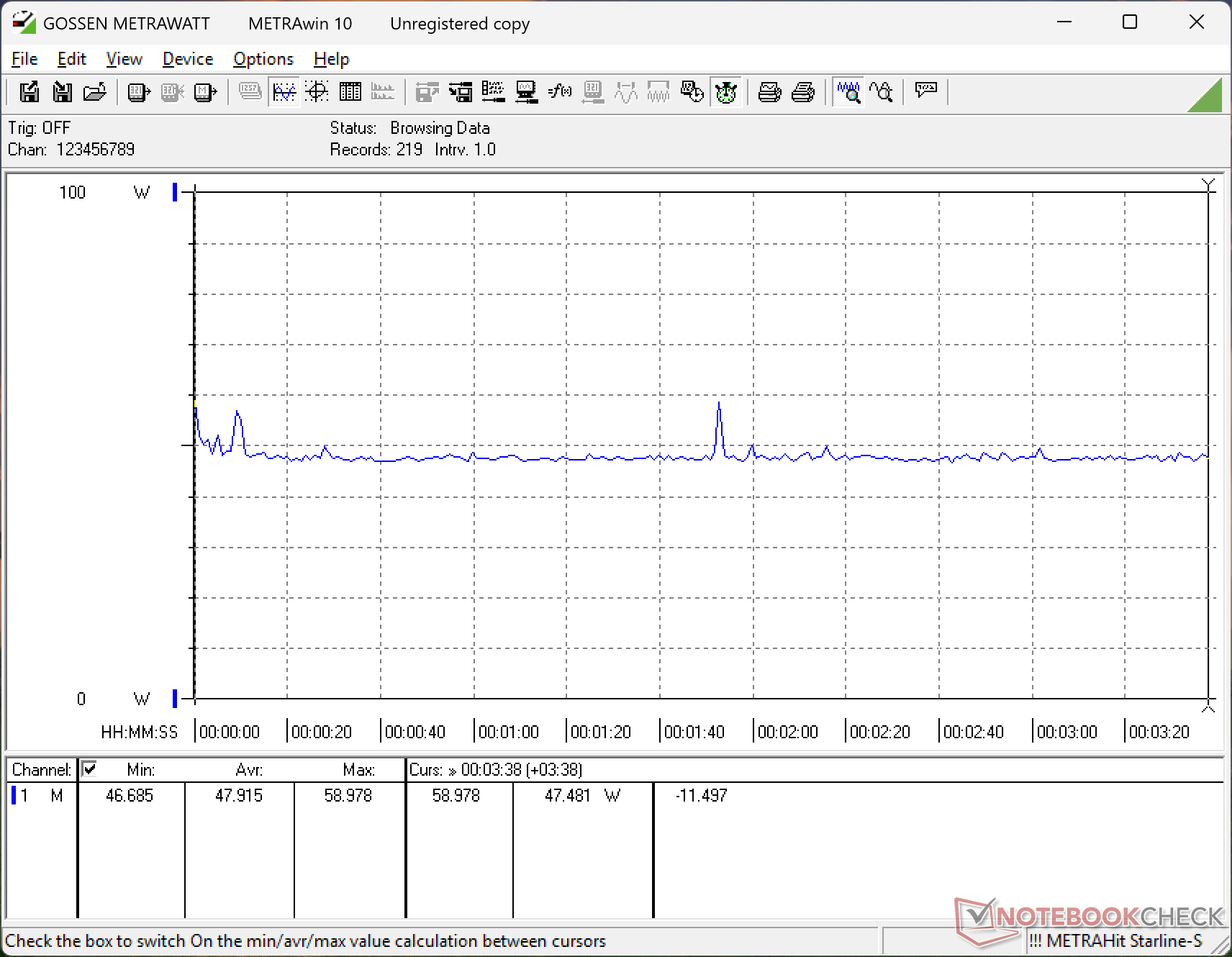 O Panther Lake adota a eficiência do Lunar Lake-V com o desempenho bruto do Arrow Lake-H para obter o melhor dos dois mundos. Ocioso no desktop com a configuração de brilho mais baixa consumiria apenas 1,3 W, o que é extremamente baixo, especialmente para um formato de 16 polegadas. O consumo permaneceria muito baixo, com pouco menos de 50 W, ao executar jogos, devido à falta de uma GPU discreta. Se, em vez disso, fosse configurado com o Core Ultra X7, o consumo para jogos seria de apenas alguns watts a mais, com base em nosso tempo com o XPS 14 para obter alguns dos números mais altos de desempenho por watt de qualquer laptop com iGPU.