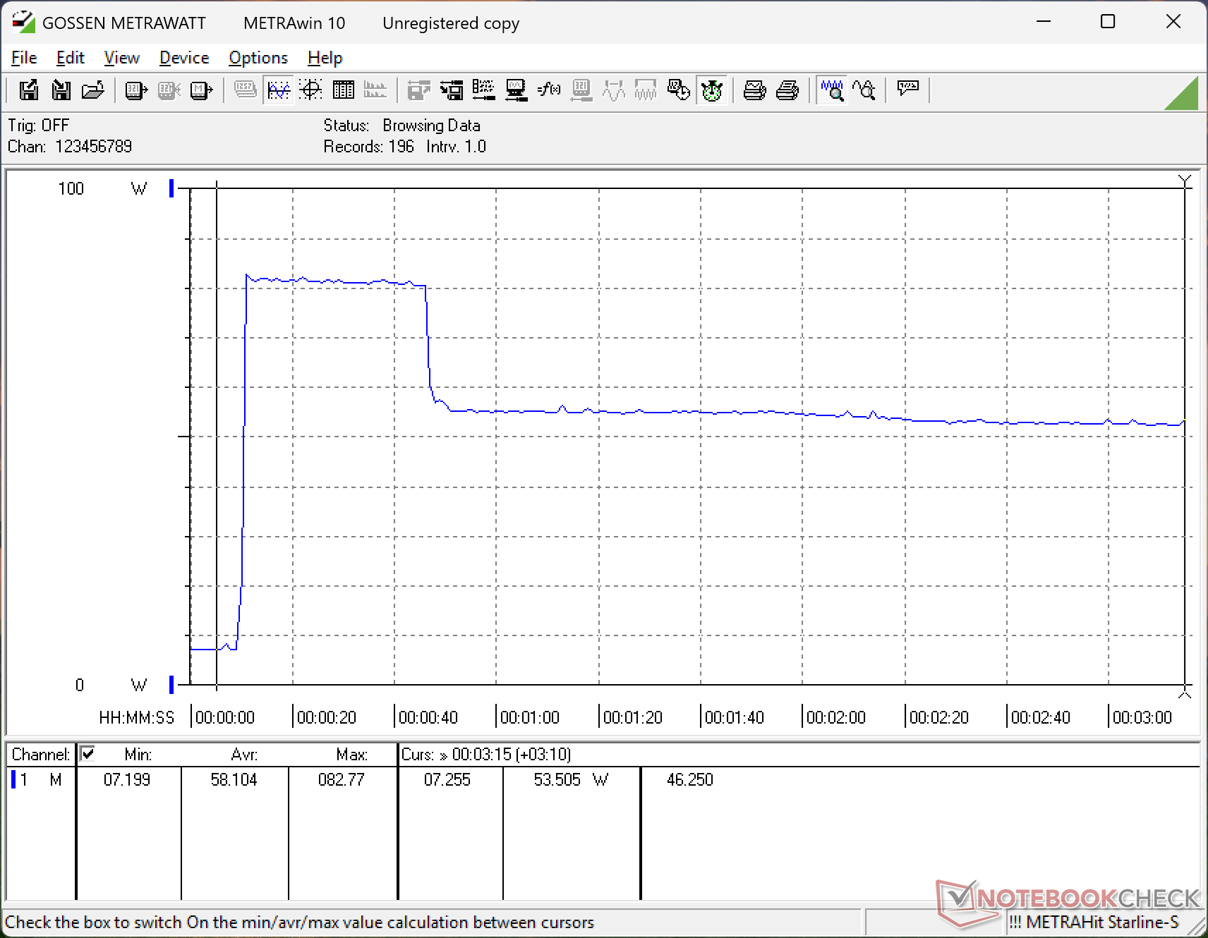 Conseguimos registrar um consumo máximo temporário de 83 W do pequeno adaptador CA universal USB-C de 100 W (~10,2 x 5,5 x 2,2 cm) quando a CPU está totalmente estressada.