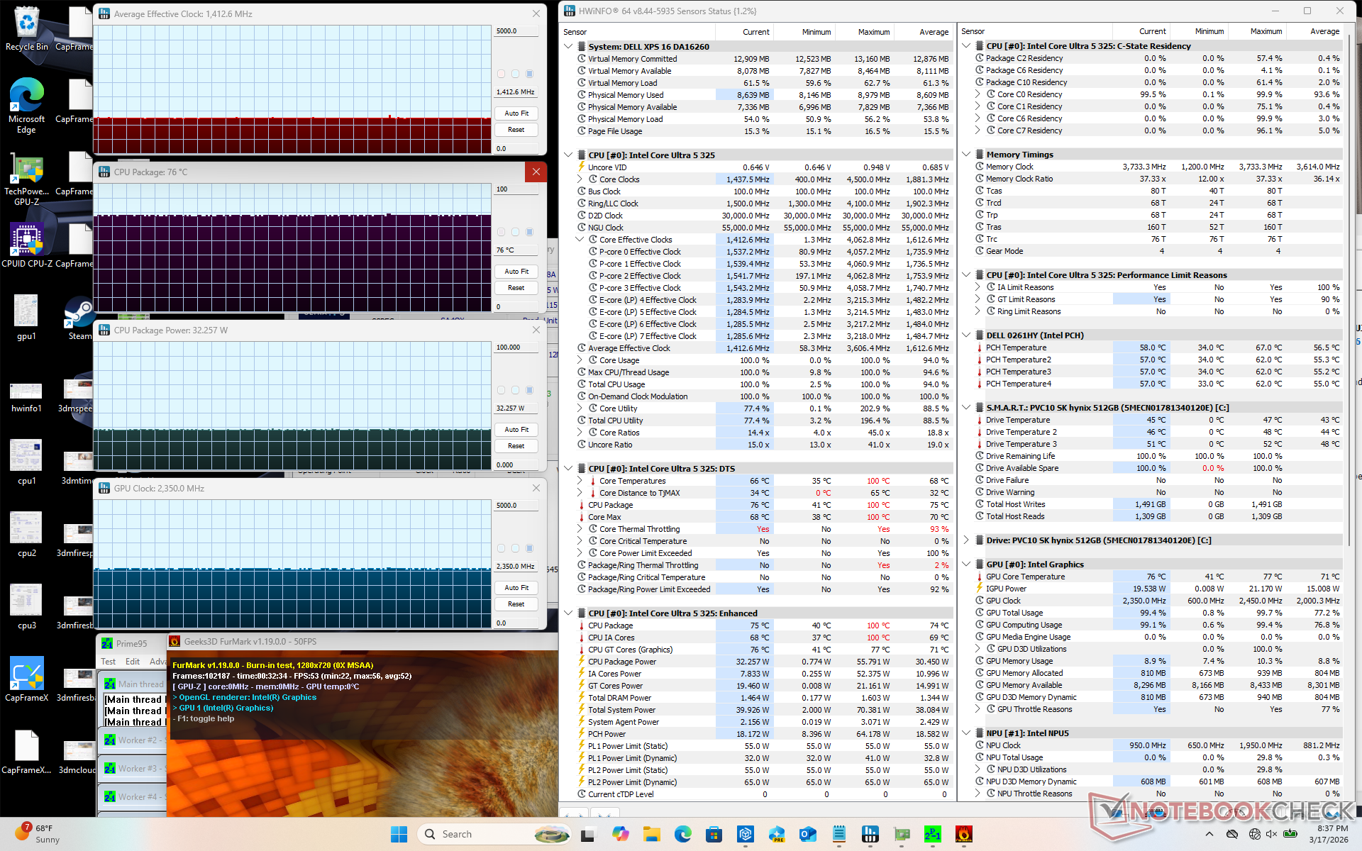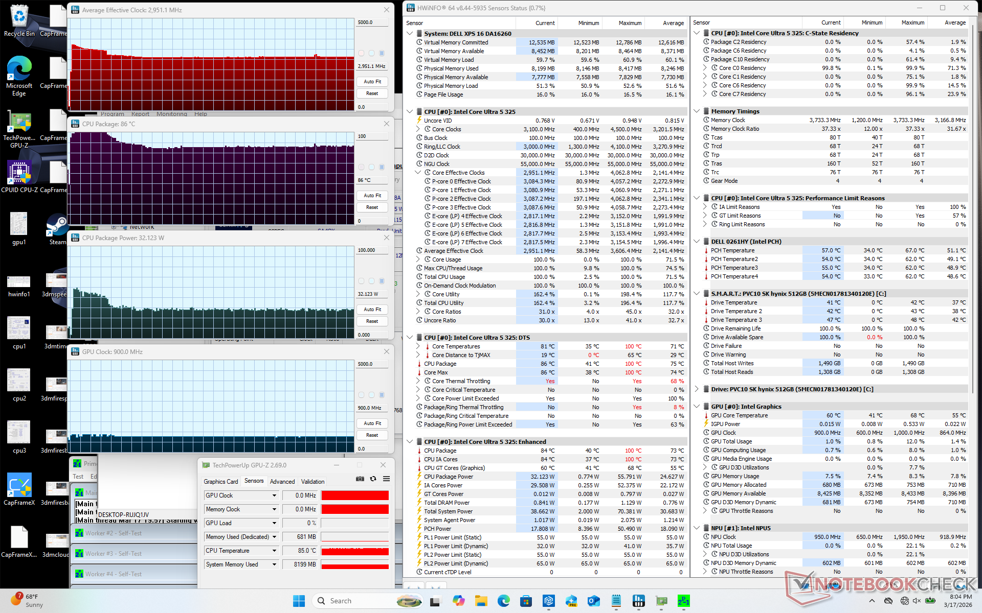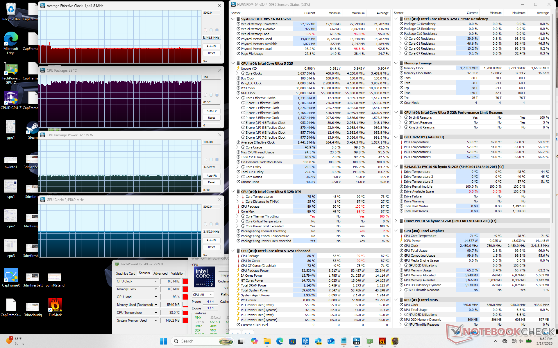 Ao executar o Cyberpunk 2077 para representar uma carga CPU-GPU mais equilibrada, a temperatura do núcleo se estabilizaria em 89 °C, em comparação com 75 °C no XPS 16 2025 com gráficos GeForce RTX mais rápidos. As temperaturas do núcleo geralmente mais quentes são provavelmente responsáveis pelas temperaturas mais quentes da superfície mencionadas acima.