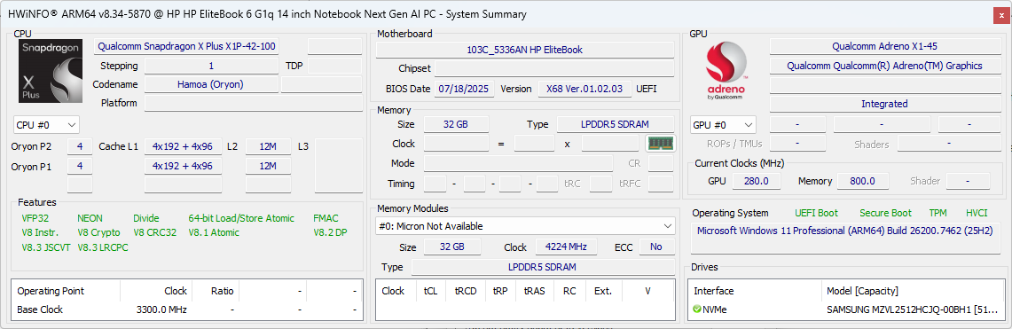 | HP EliteBook 6 G1q 14 Qualcomm Snapdragon X Plus X1P-42-100 ⎘ Qualcomm SD X Adreno X1-45 1.7 TFLOPS ⎘ 32 GB Memória, 512 GB SSD | Amazon: $1,382.03 Preço de tabela: 1300 USD | 1.5 kg | 17 mm | 14.00" 1920x1200 162 PPI IPS | |