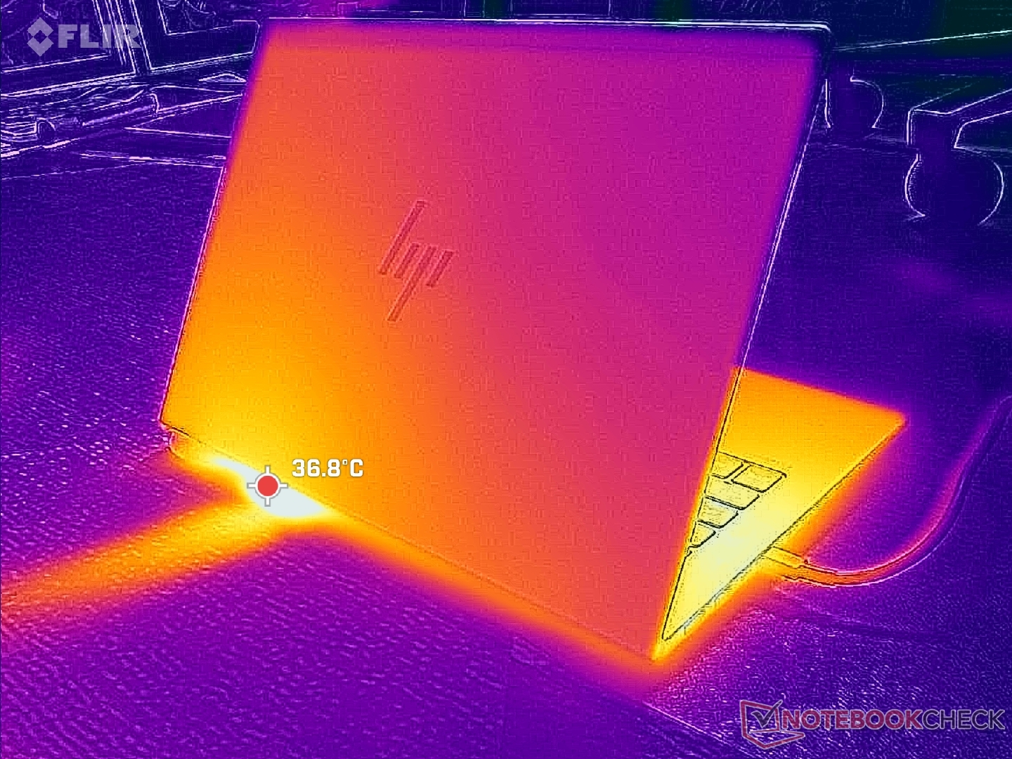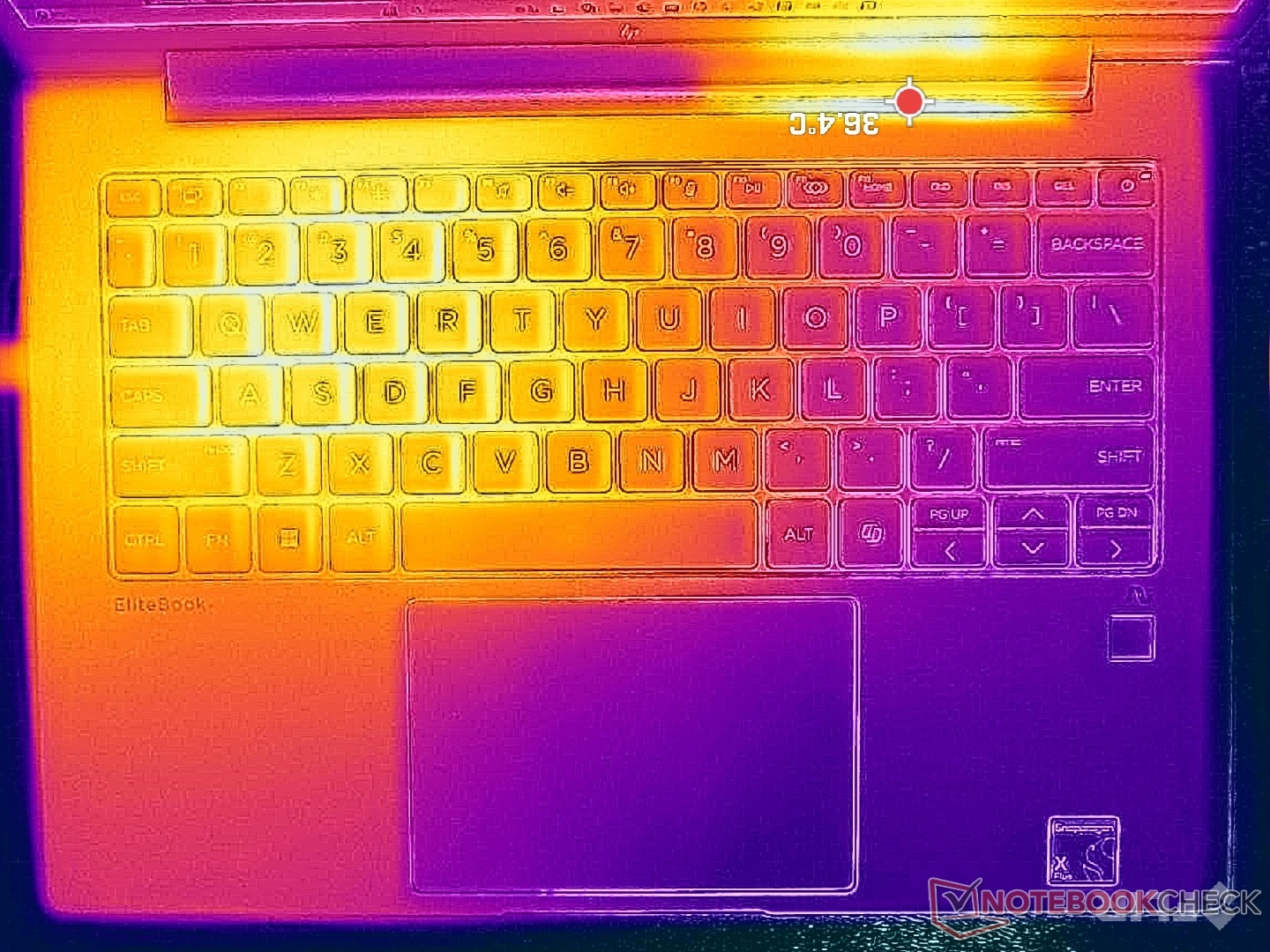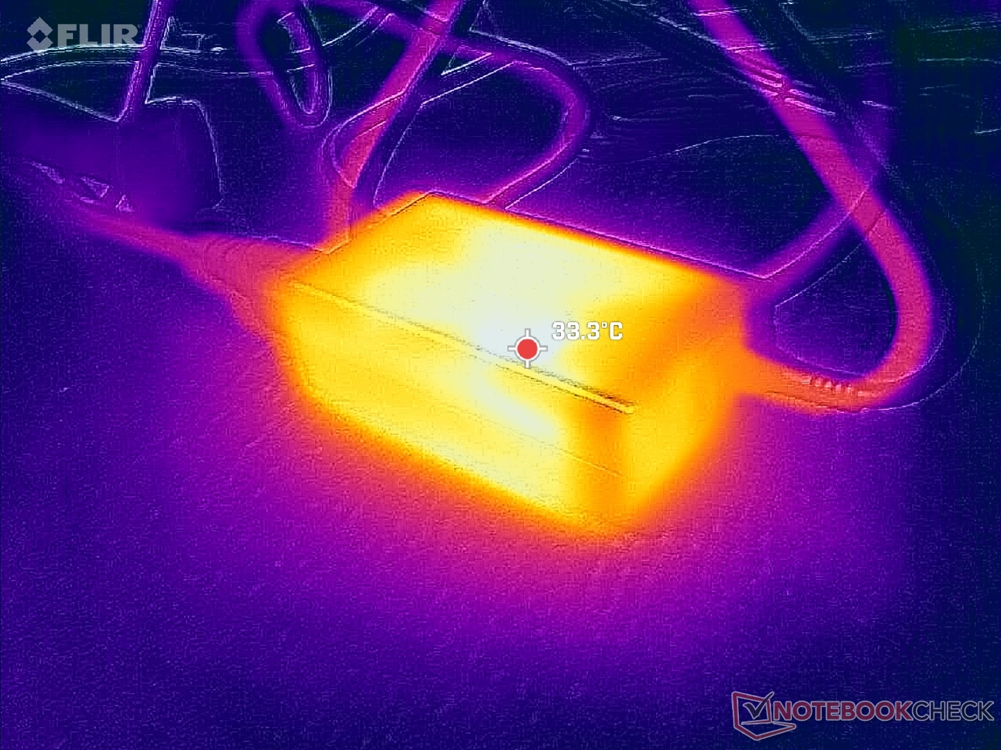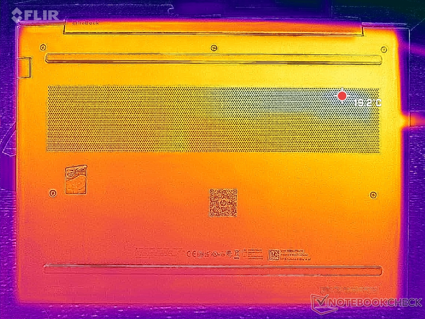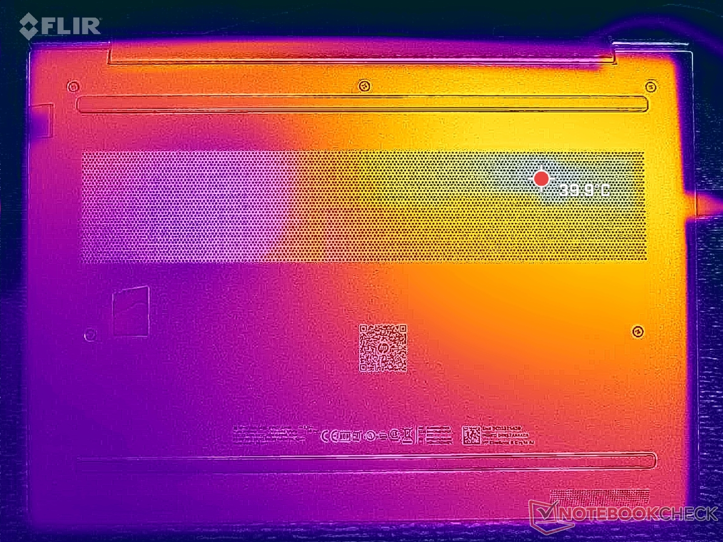 (±) A parte inferior aquece até um máximo de 42.4 °C / 108 F, em comparação com a média de 36.8 °C / 98 F