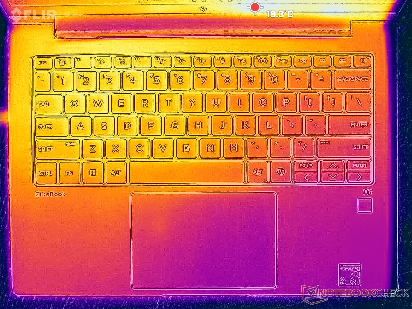 (+) Os apoios para as mãos e o touchpad são mais frios que a temperatura da pele, com um máximo de 26.4 °C / 79.5 F e, portanto, são frios ao toque.