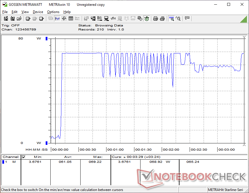 A CPU aumentaria para 3,2 GHz e 25 W ao iniciar o estresse do Prime95. No entanto, após atingir uma temperatura de núcleo de 89 °C alguns segundos depois, a CPU cairia para 2,7 GHz e 15 W para uma temperatura de núcleo mais fria de 76 °C.
