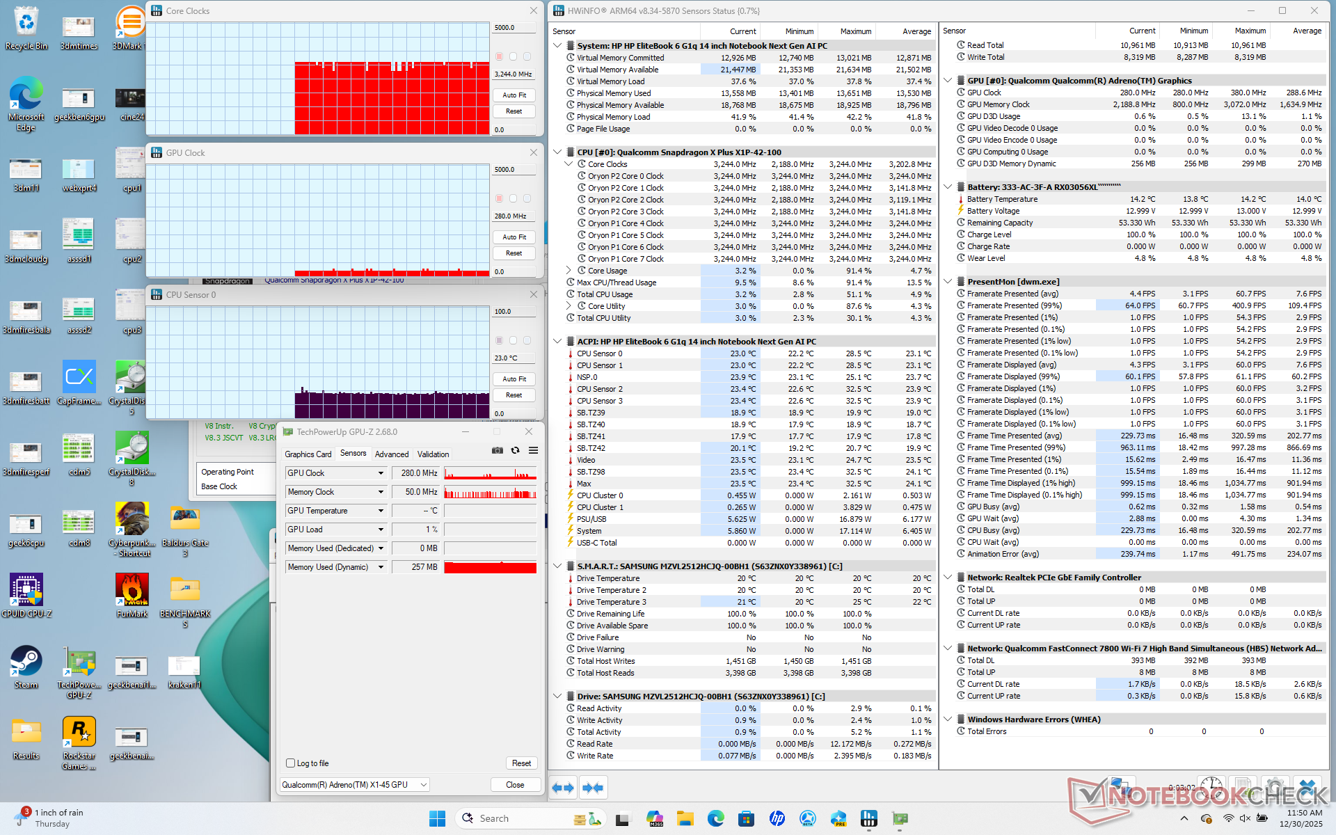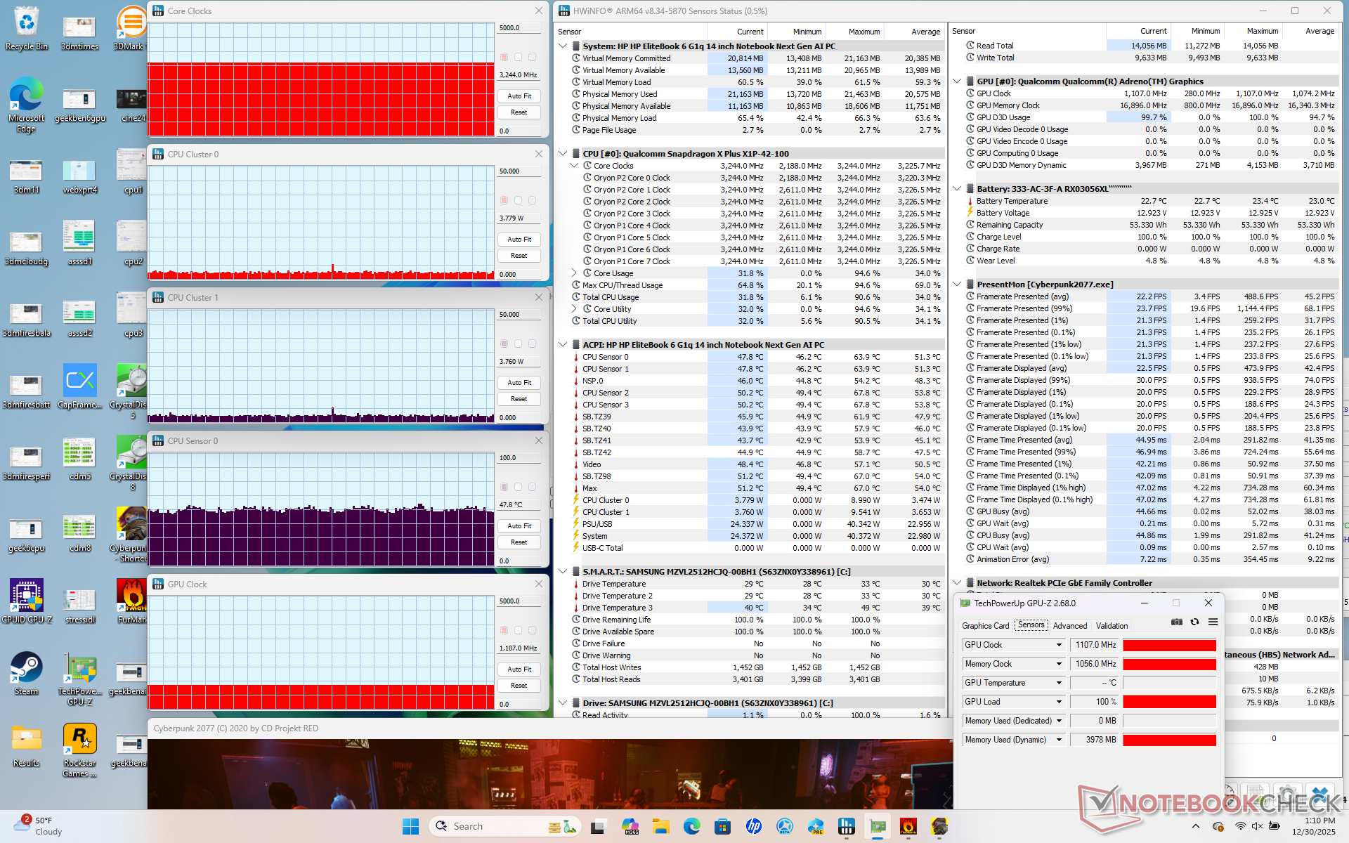 | Clock médio da CPU (GHz) | Clock da GPU (MHz) | Temperatura média da CPU (°C) | |