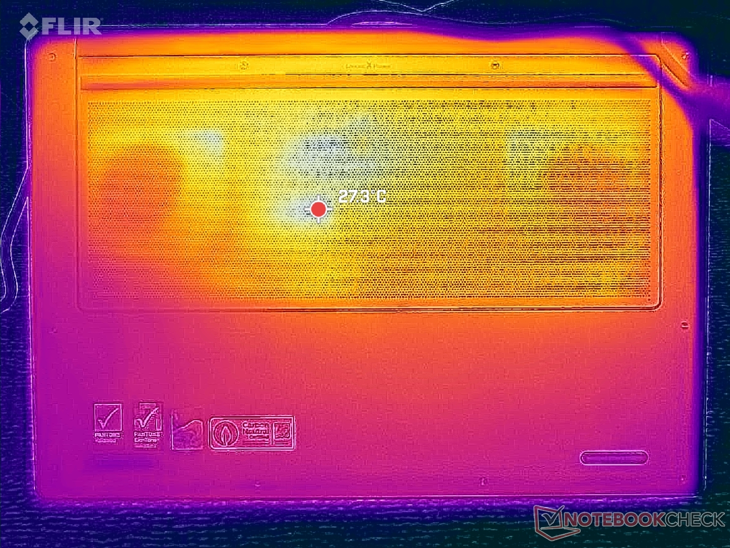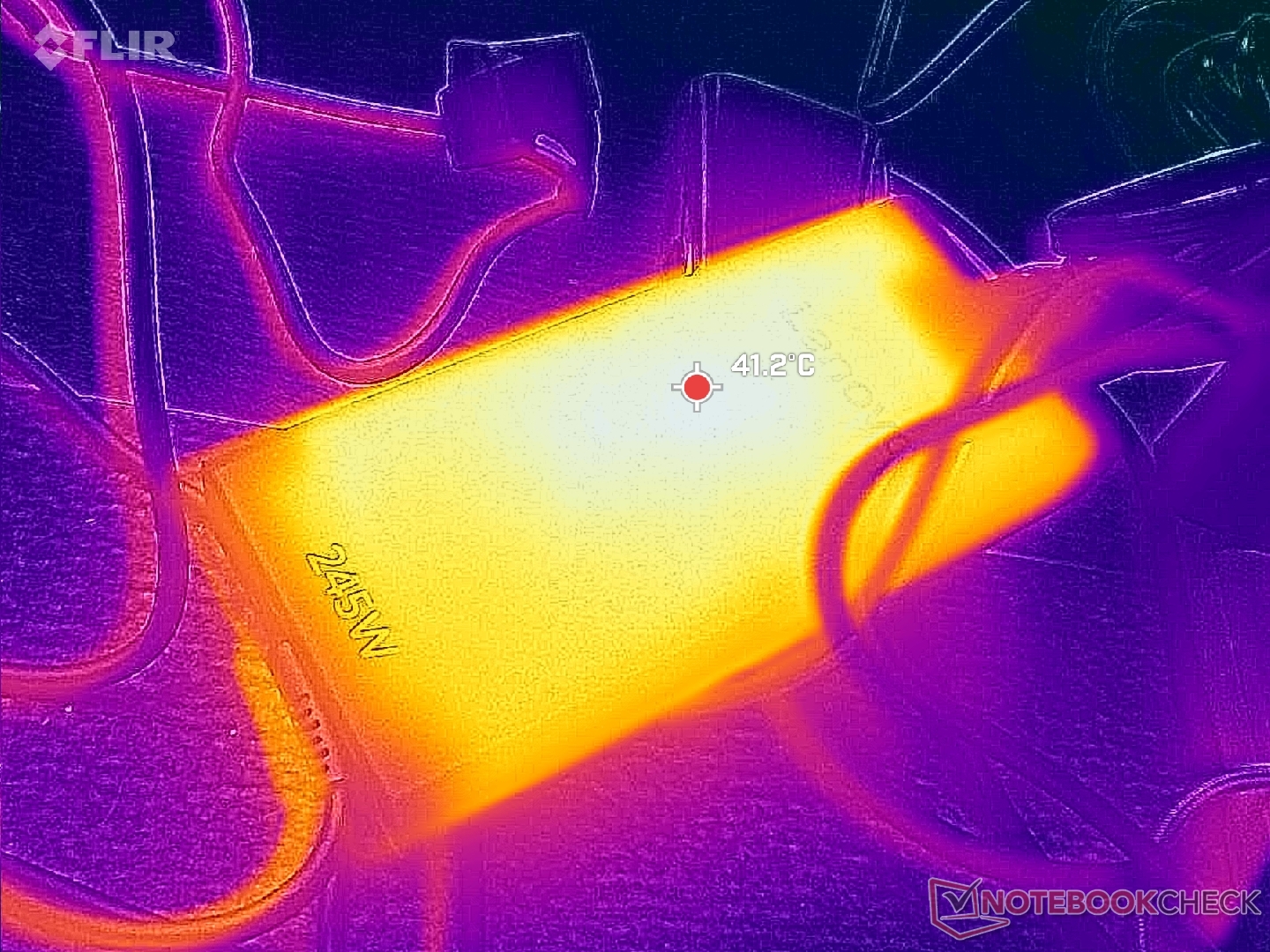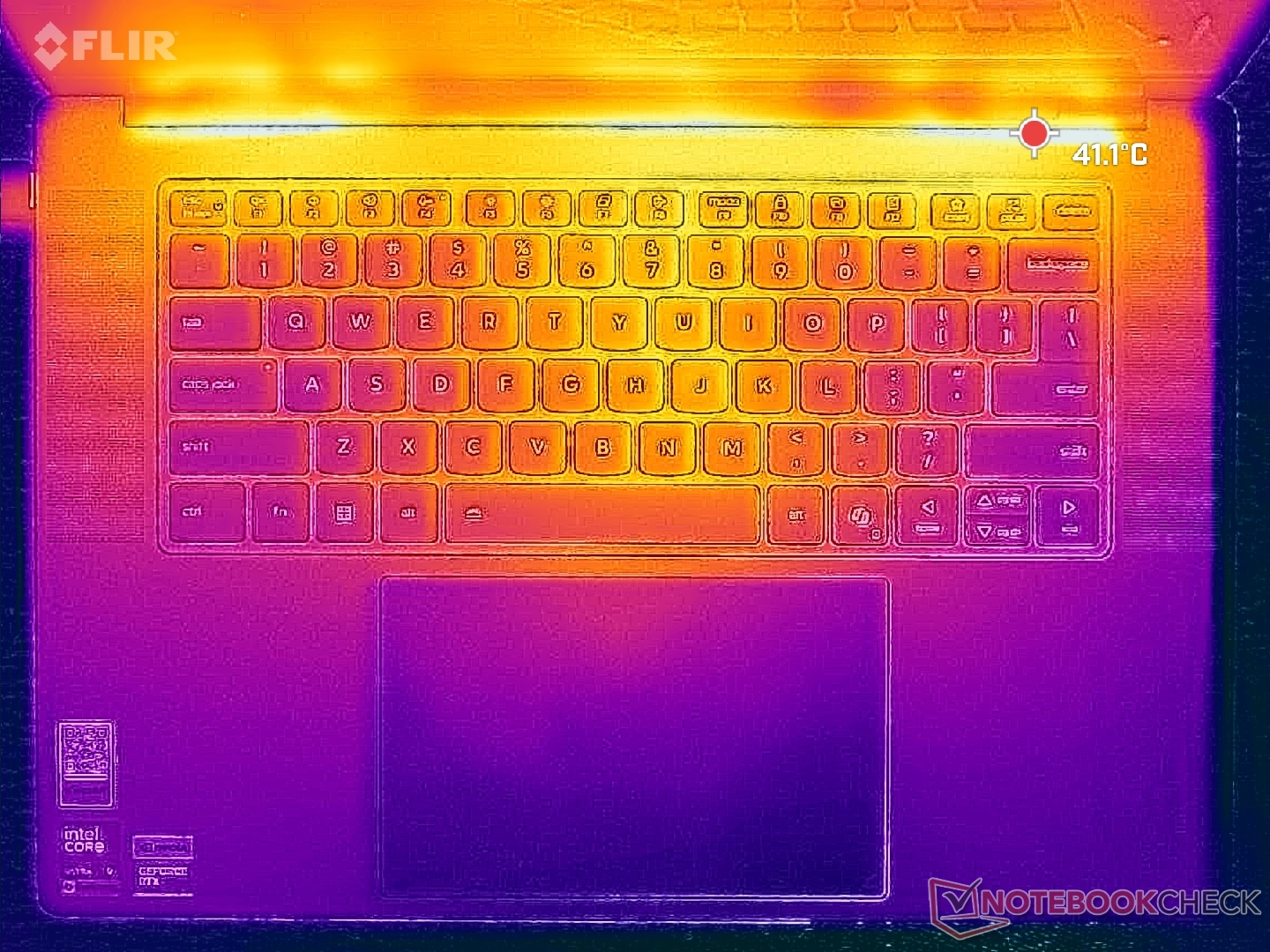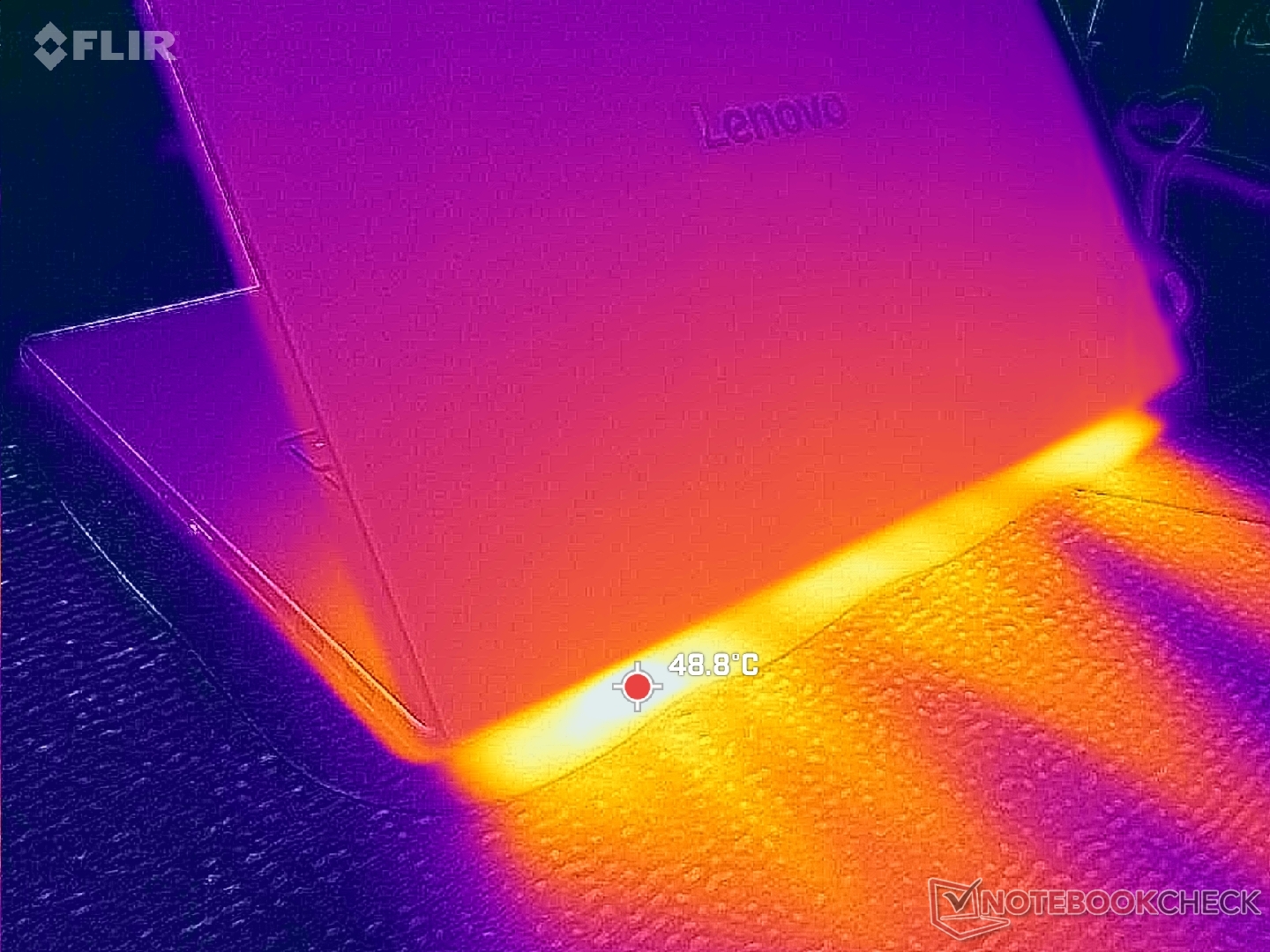 As temperaturas da superfície são visivelmente mais baixas, apesar das dimensões menores do que as do modelo anterior. Ao executar o Cyberpunk 2077, por exemplo, os pontos quentes em nossa unidade atingiram apenas 38 C e 41 C, em comparação com 42 C e 49 C no Yoga Pro 9i 16IAH G10 Aura com a mesma GPU Nvidia.