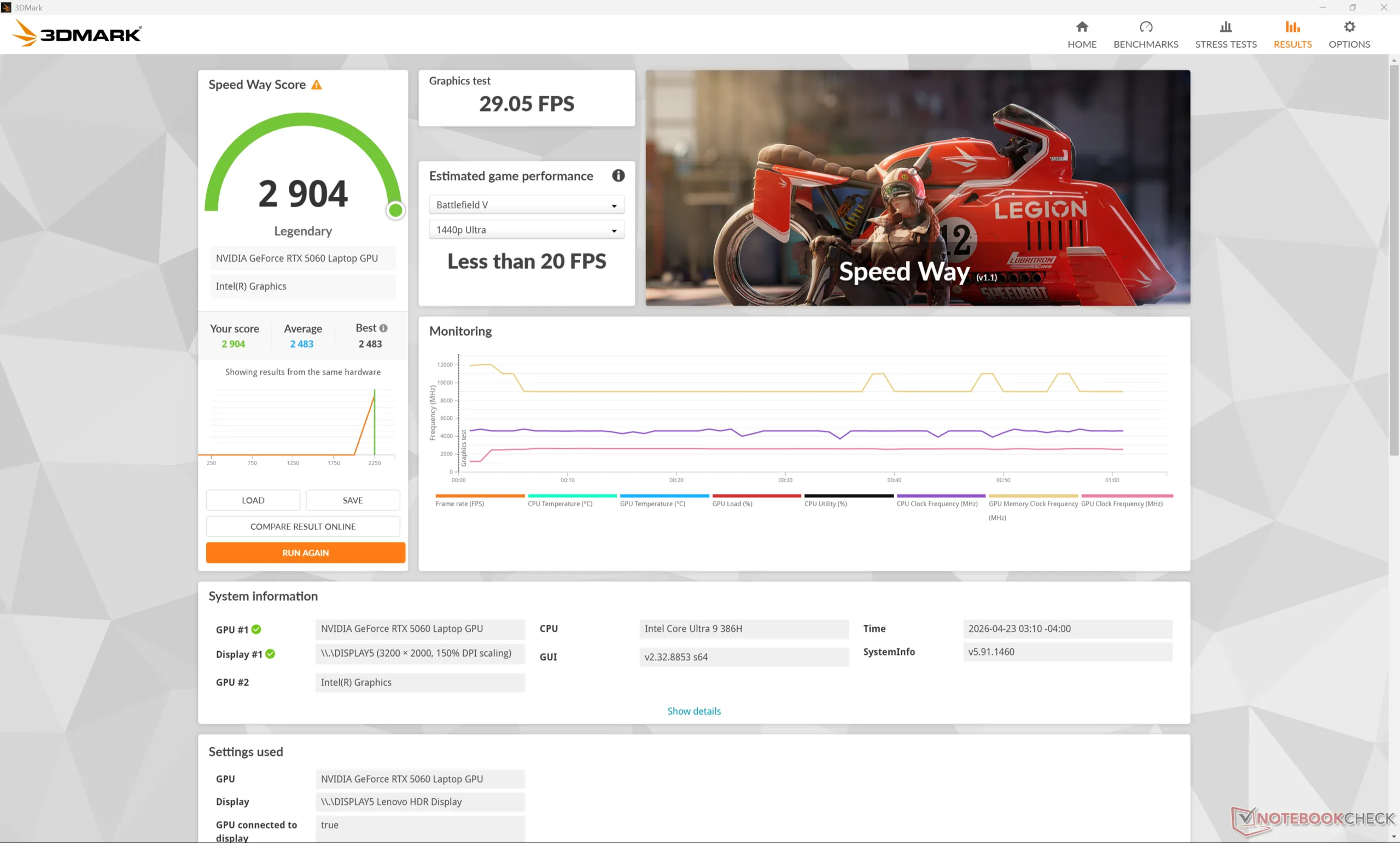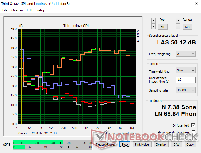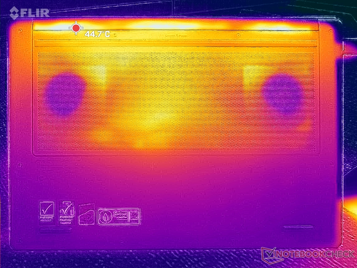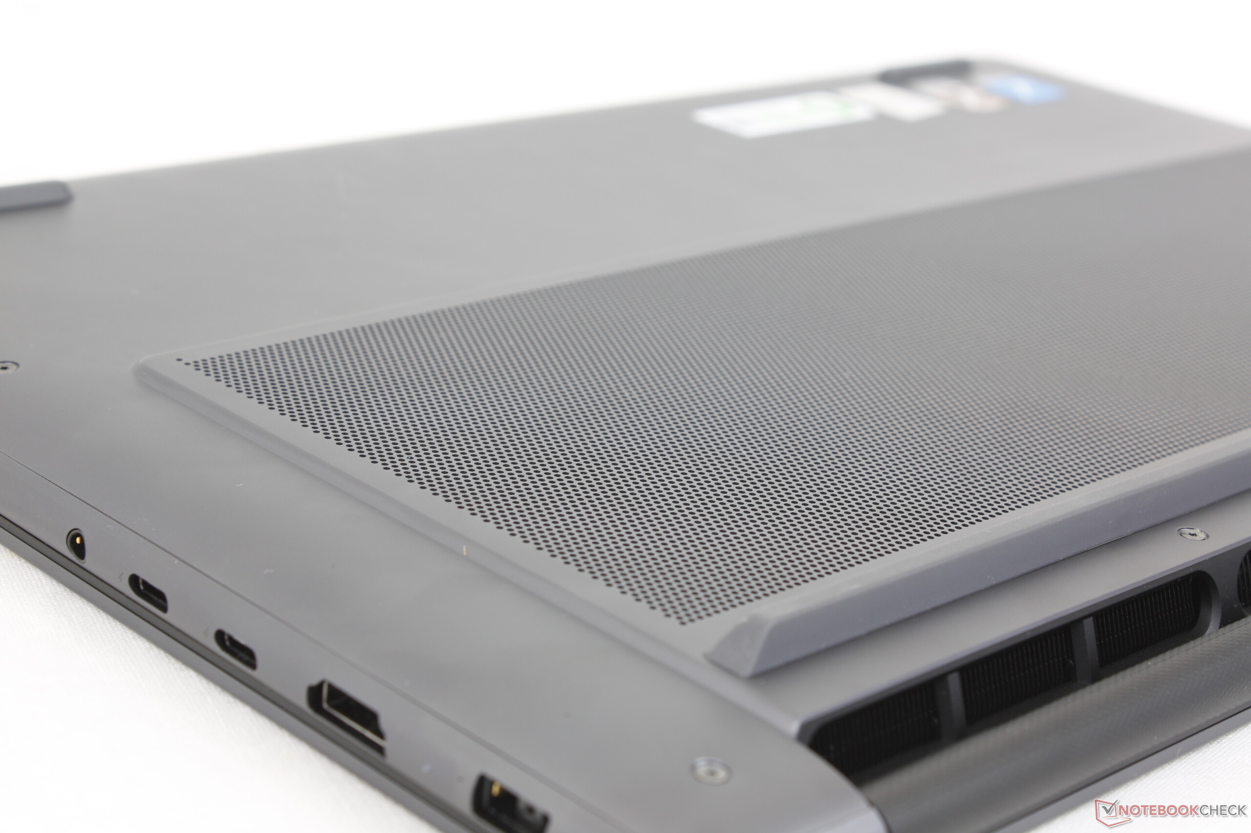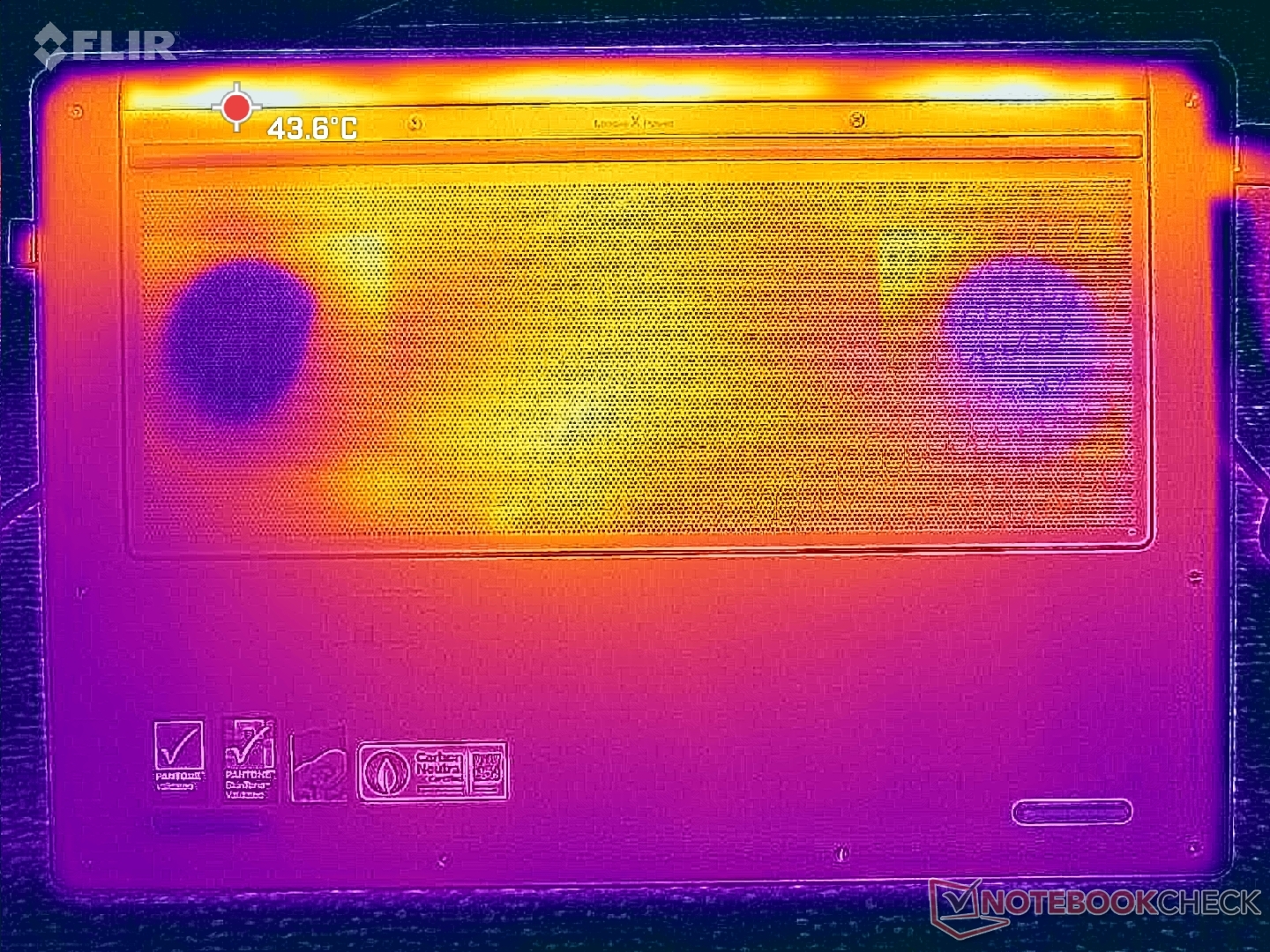 As temperaturas da superfície são visivelmente mais baixas, apesar das dimensões menores do que as do modelo anterior. Ao executar o Cyberpunk 2077, por exemplo, os pontos quentes em nossa unidade atingiram apenas 38 C e 41 C, em comparação com 42 C e 49 C no Yoga Pro 9i 16IAH G10 Aura com a mesma GPU Nvidia.