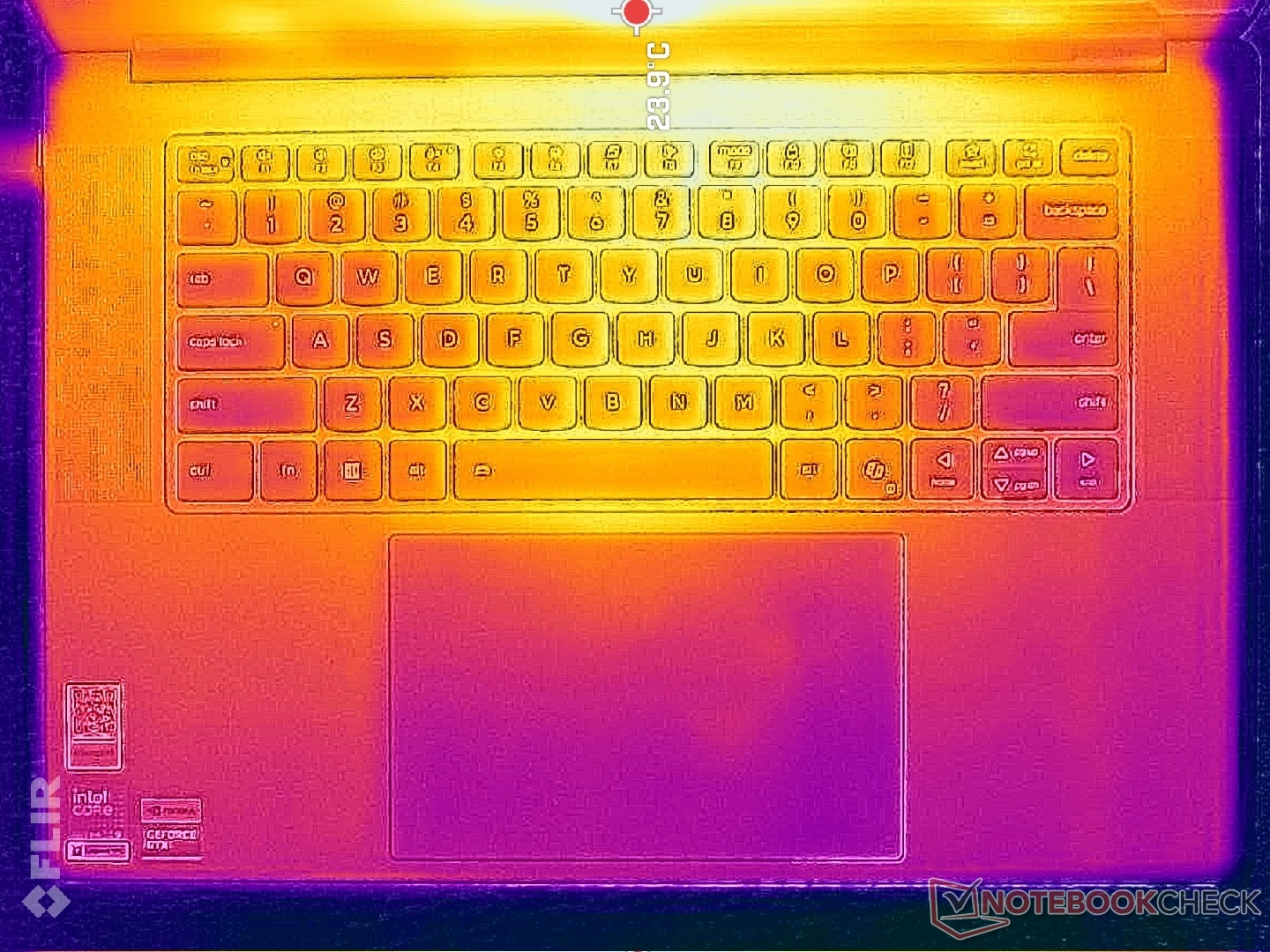 (+) Os apoios para as mãos e o touchpad são mais frios que a temperatura da pele, com um máximo de 29.4 °C / 84.9 F e, portanto, são frios ao toque.