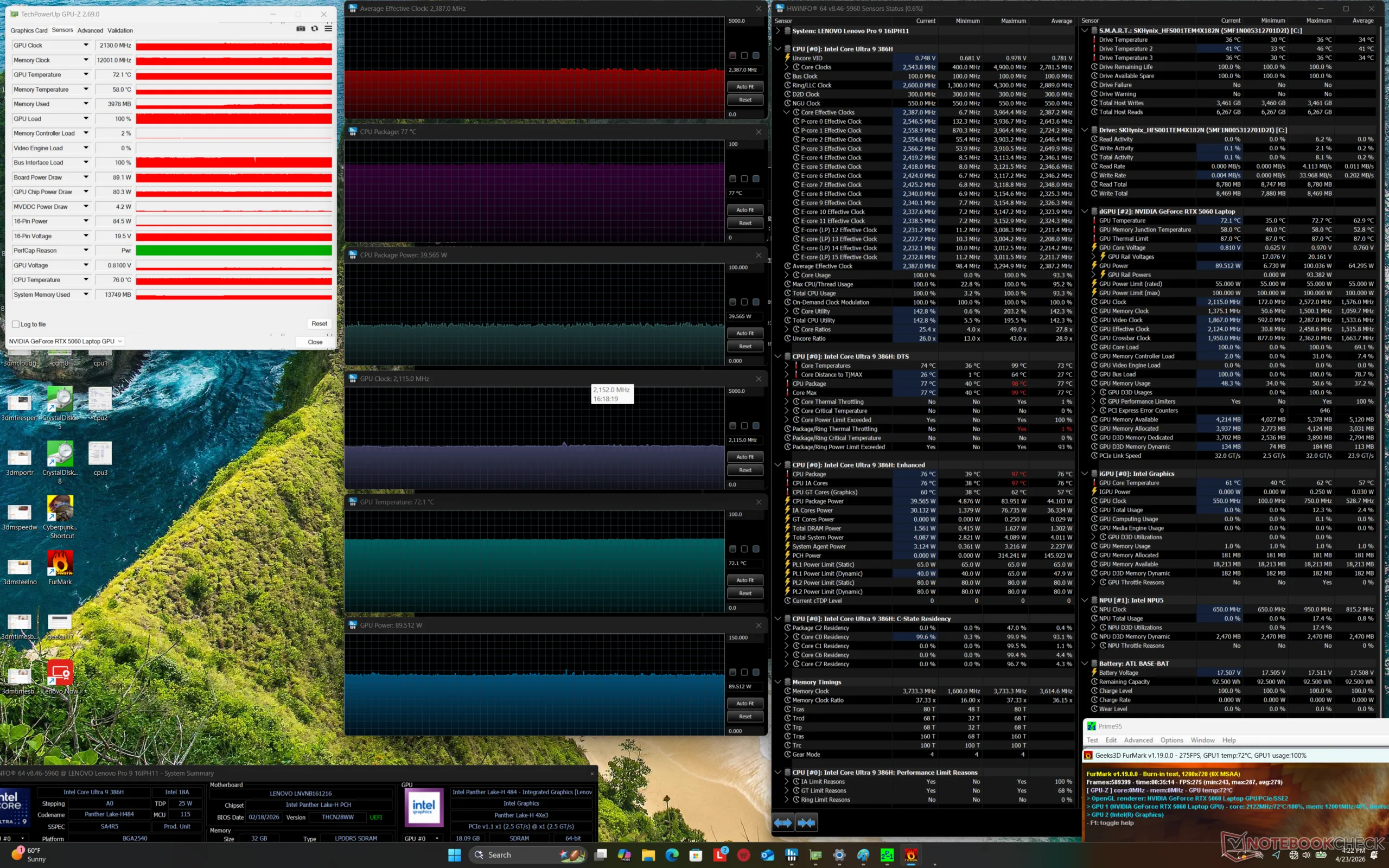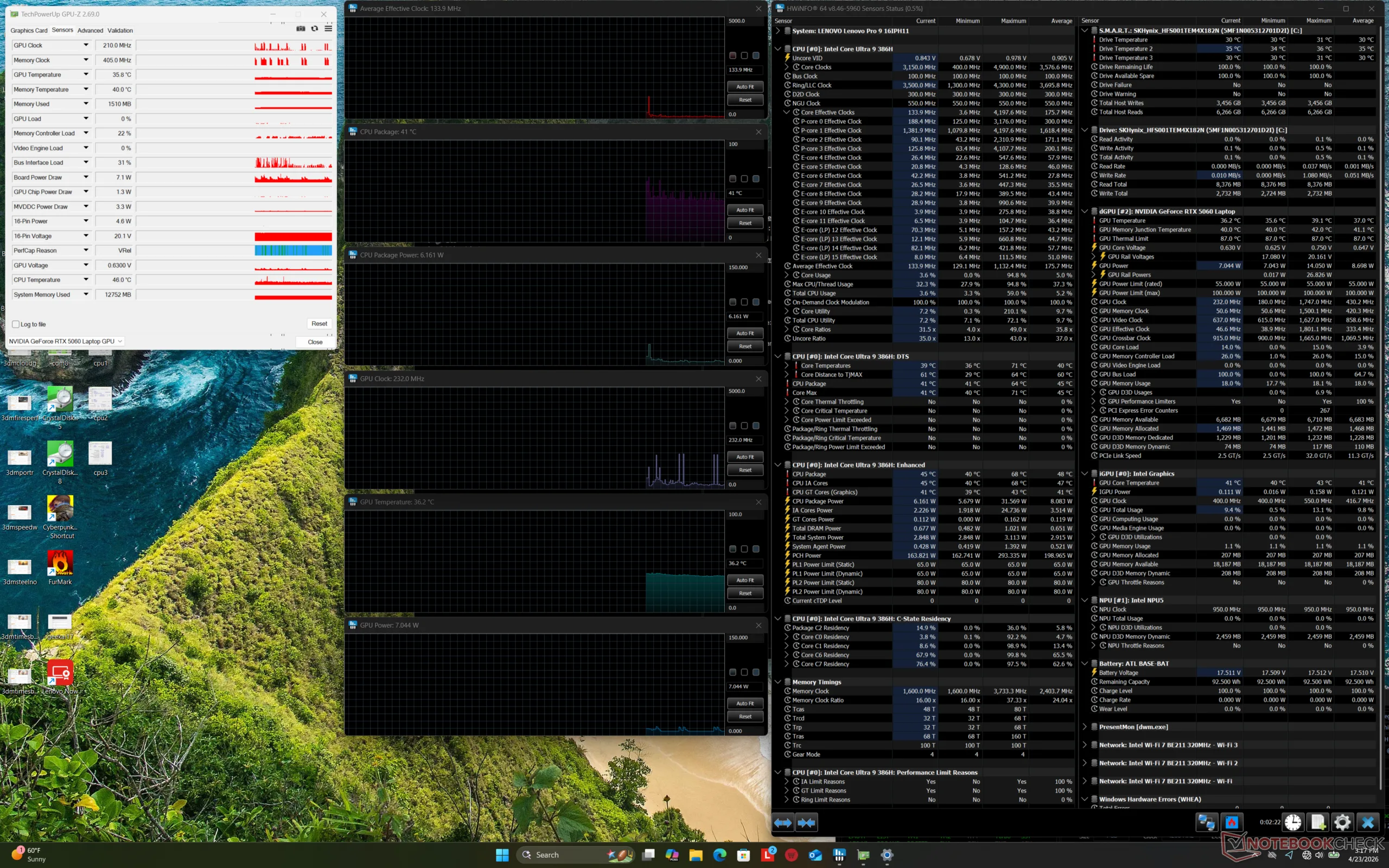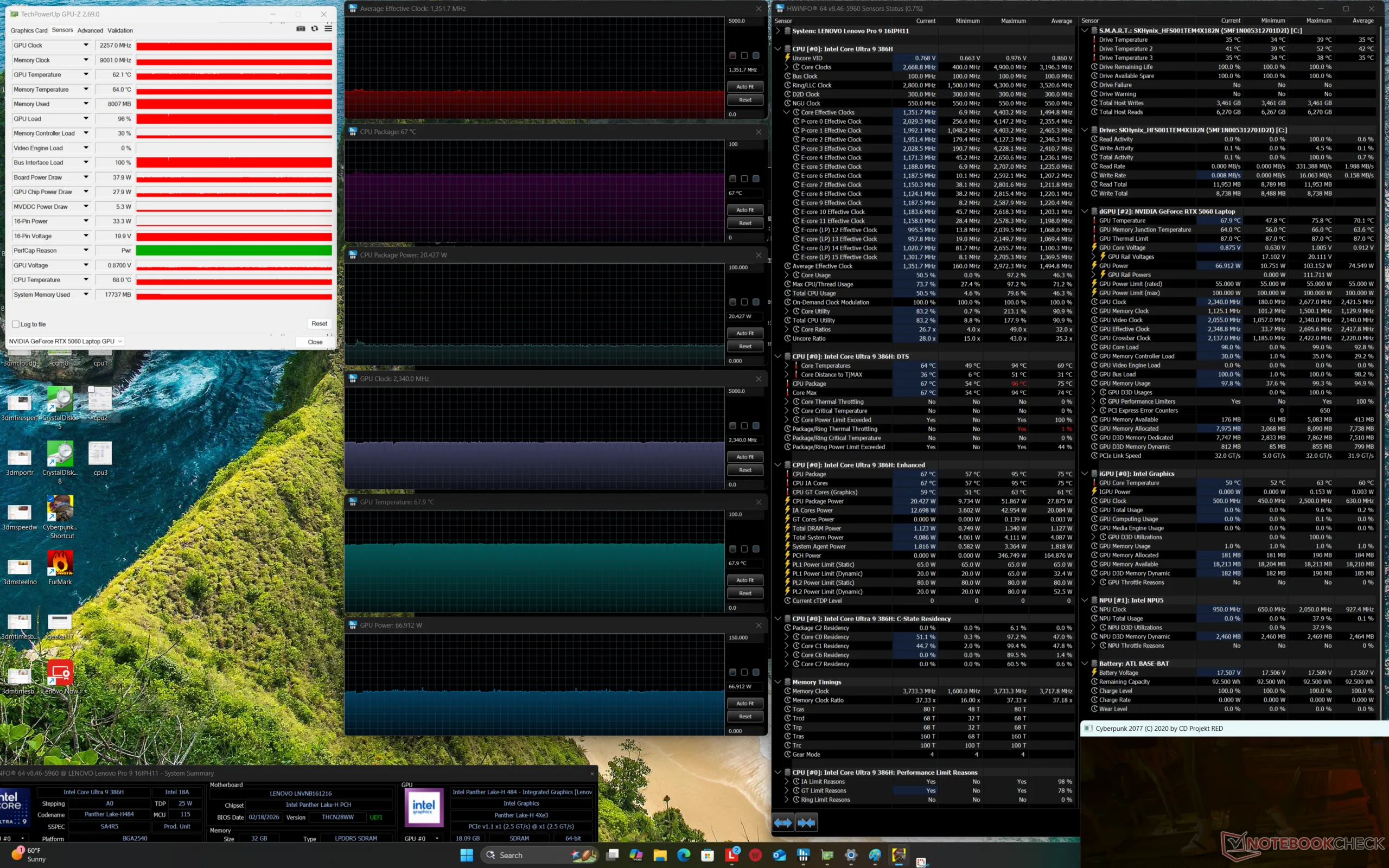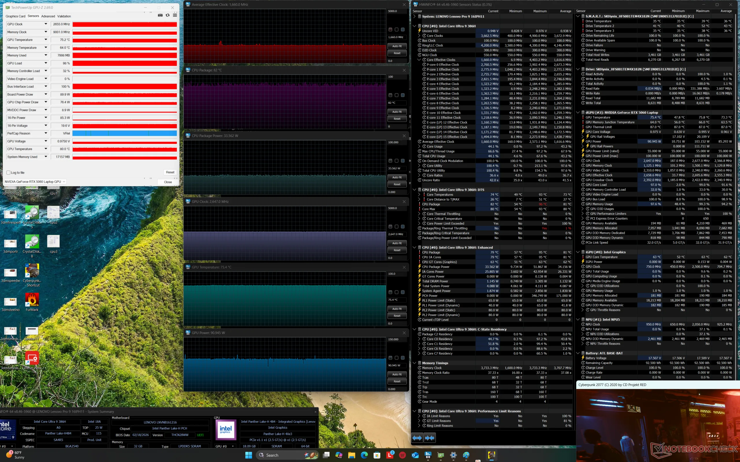 A temperatura do núcleo e as taxas de clock mudavam drasticamente entre os modos Balanced e Performance, como mostram as capturas de tela abaixo. Ao executar o Cyberpunk 2077, por exemplo, a GPU teria uma média de 2647 MHz, 75 °C e 91 W se configurada no modo Performance ou 2340 MHz, 68 °C e 67 W se configurada no modo Balanced. O desempenho geral mais lento no modo Balanced está alinhado com nossas observações do Time SPy na seção GPU acima.