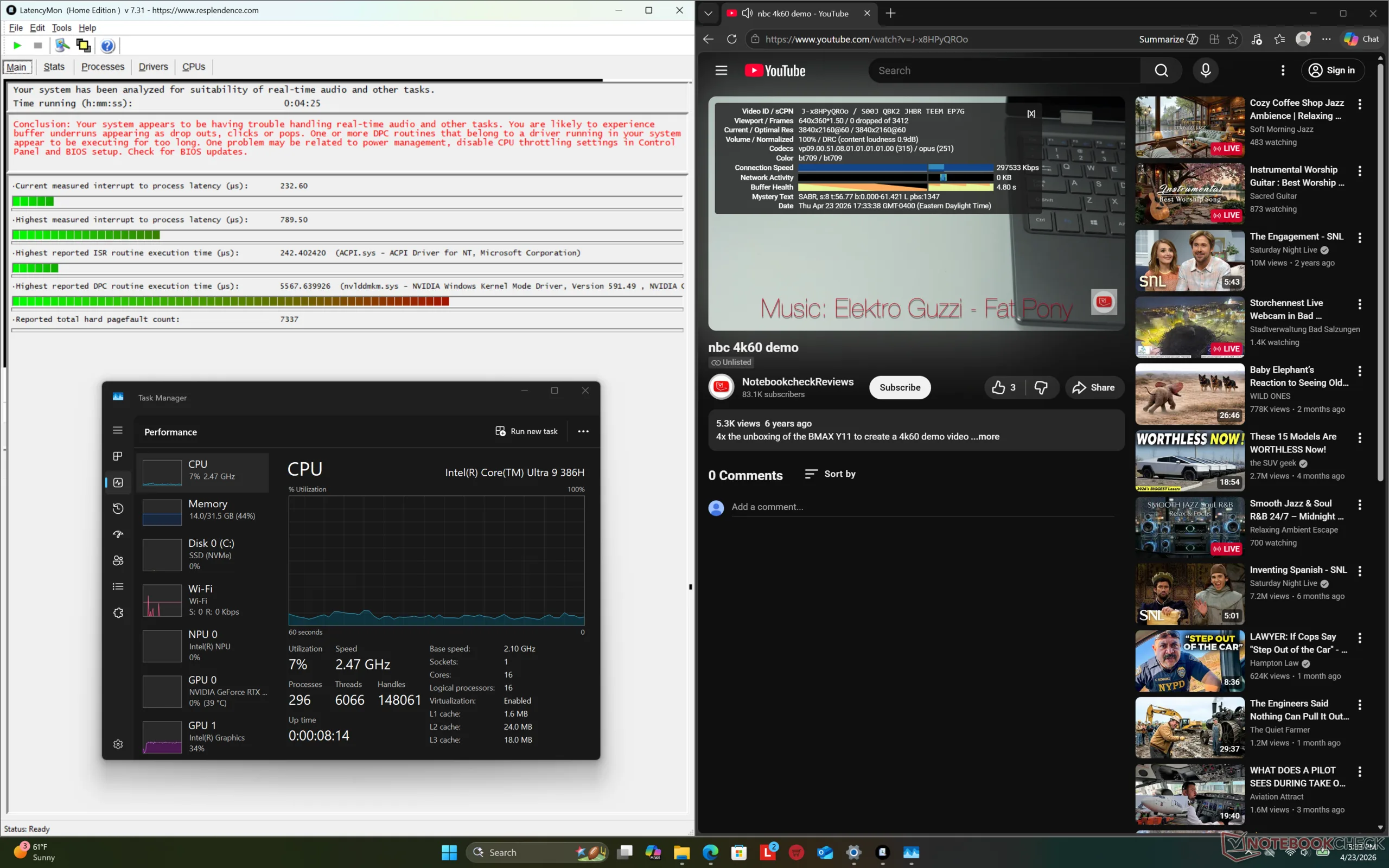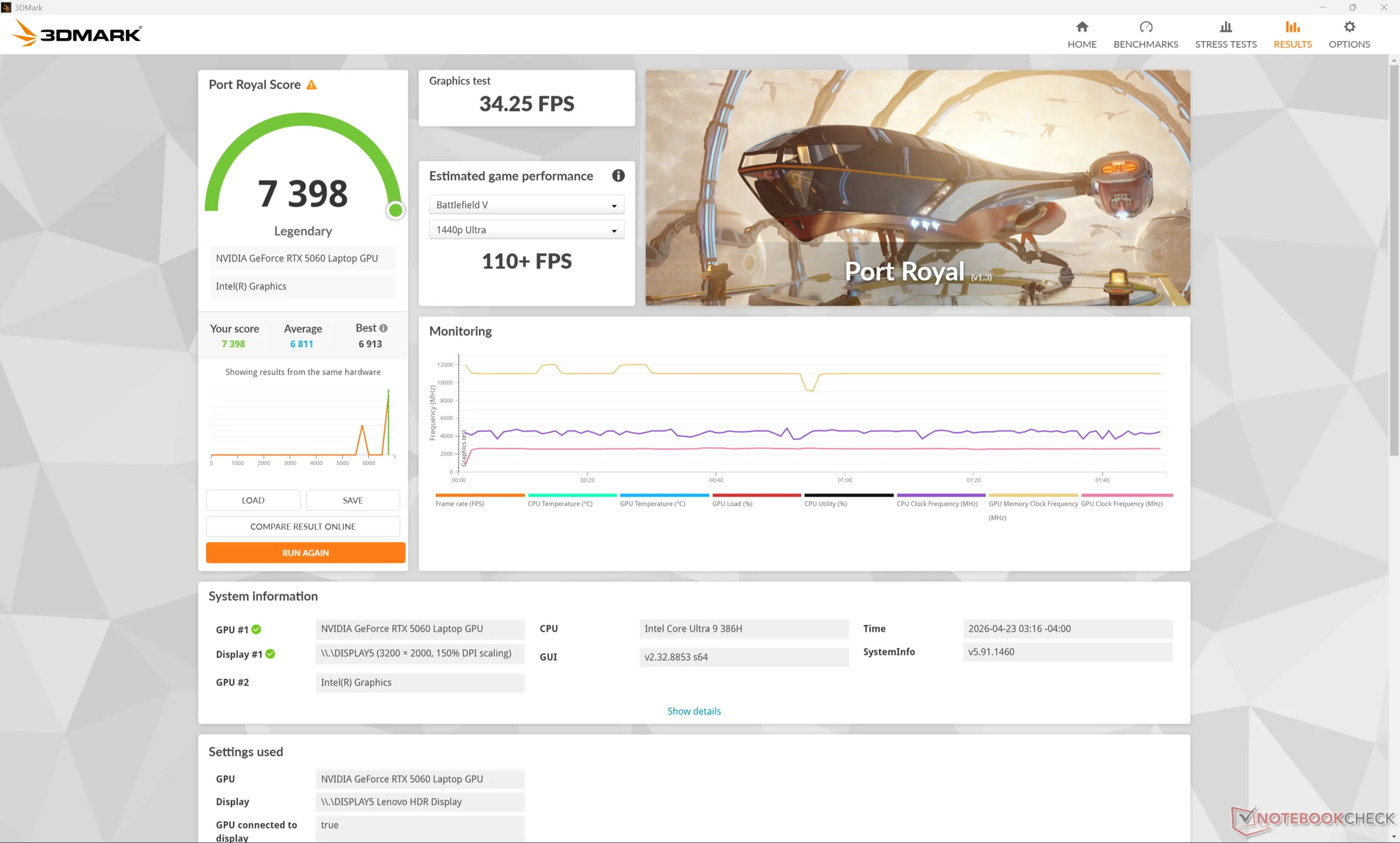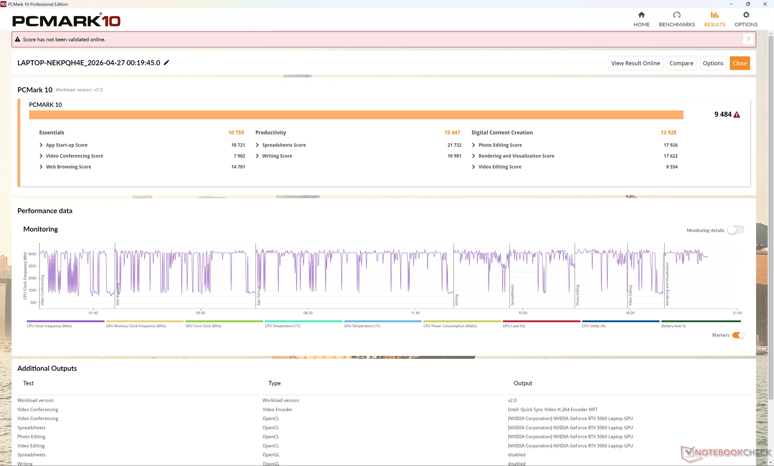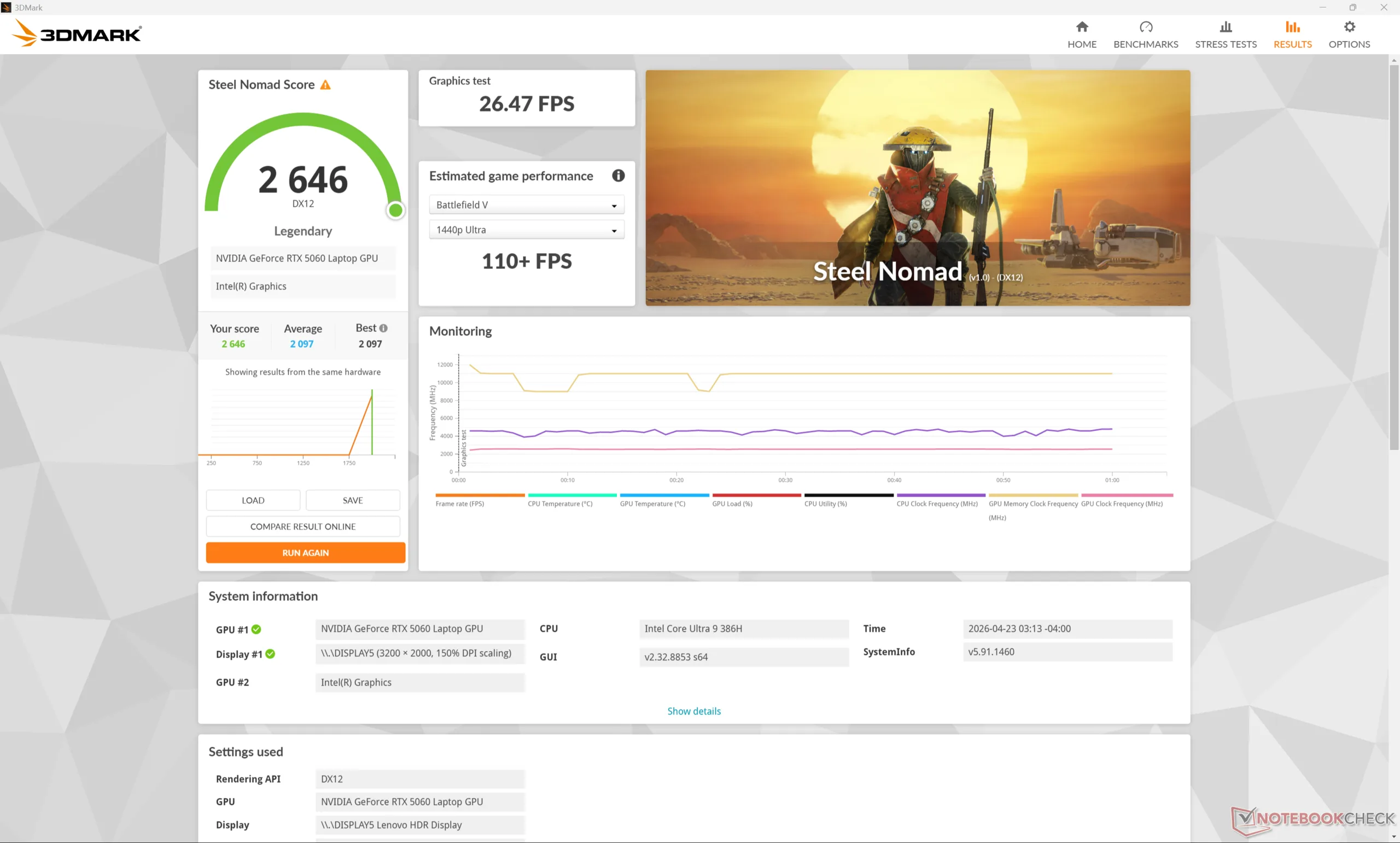 A temperatura do núcleo e as taxas de clock mudavam drasticamente entre os modos Balanced e Performance, como mostram as capturas de tela abaixo. Ao executar o Cyberpunk 2077, por exemplo, a GPU teria uma média de 2647 MHz, 75 °C e 91 W se configurada no modo Performance ou 2340 MHz, 68 °C e 67 W se configurada no modo Balanced. O desempenho geral mais lento no modo Balanced está alinhado com nossas observações do Time SPy na seção GPU acima.