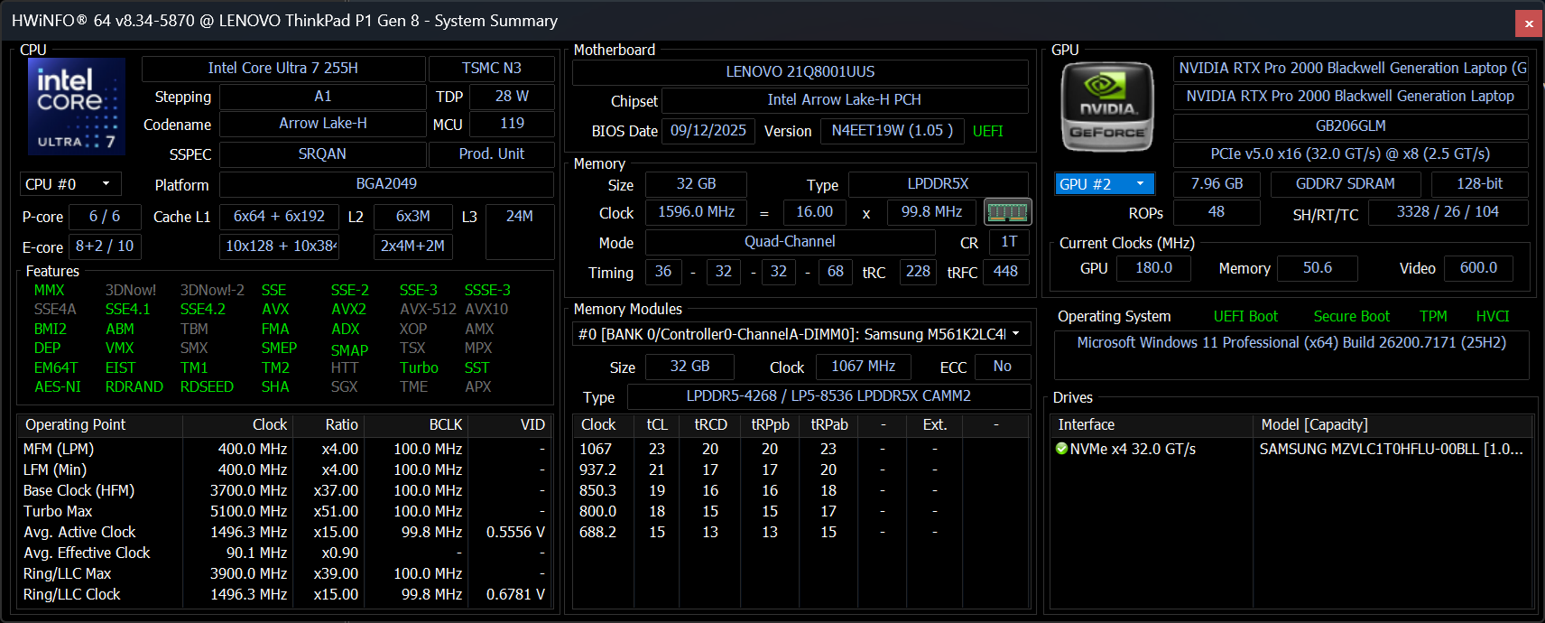 | Lenovo ThinkPad P1 Gen 8 Ultra 7 255H, RTX PRO 2000 Blackwell Generation Laptop, 90 Wh | Lenovo ThinkPad P1 Gen 7 21KV001SGE Ultra 7 155H, GeForce RTX 4060 Laptop GPU, 90 Wh | HP ZBook X G1i 16 Ultra 7 265H, RTX PRO 2000 Blackwell Generation Laptop, 83 Wh | Dell Pro Max 16 Plus Ultra 9 285HX, RTX PRO 5000 Blackwell Generation Laptop, 96 Wh | Asus ExpertBook B6 Flip B6602FC2 i9-12950HX, RTX A2000 Laptop GPU, 90 Wh | |