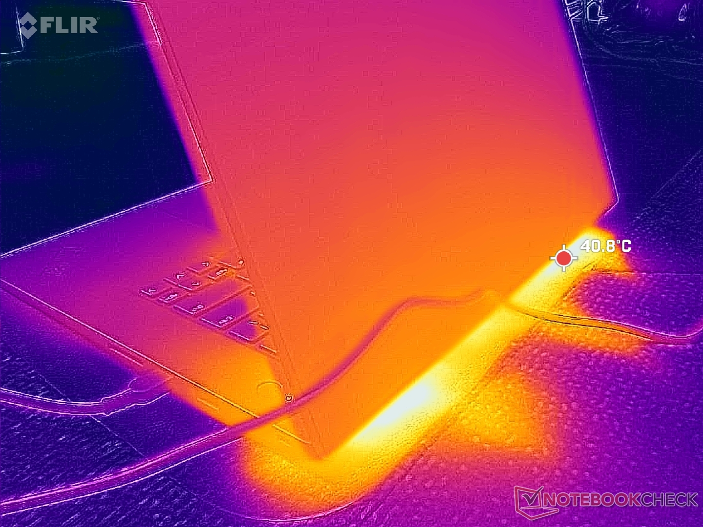 O desenvolvimento da temperatura da superfície é simétrico, com pontos quentes próximos ao centro do teclado, atingindo de 40 a 45 °C ao executar cargas muito exigentes, como Prime95 ou FurMark. Os resultados são mais frios do que o esperado, considerando o design fino do chassi. No ano passado, o ThinkPad P1 Gen 7 do ano passado do ano passado atingiria temperaturas de superfície mais altas em comparação, provavelmente devido ao seu envelope de energia de 170 W mais alto.