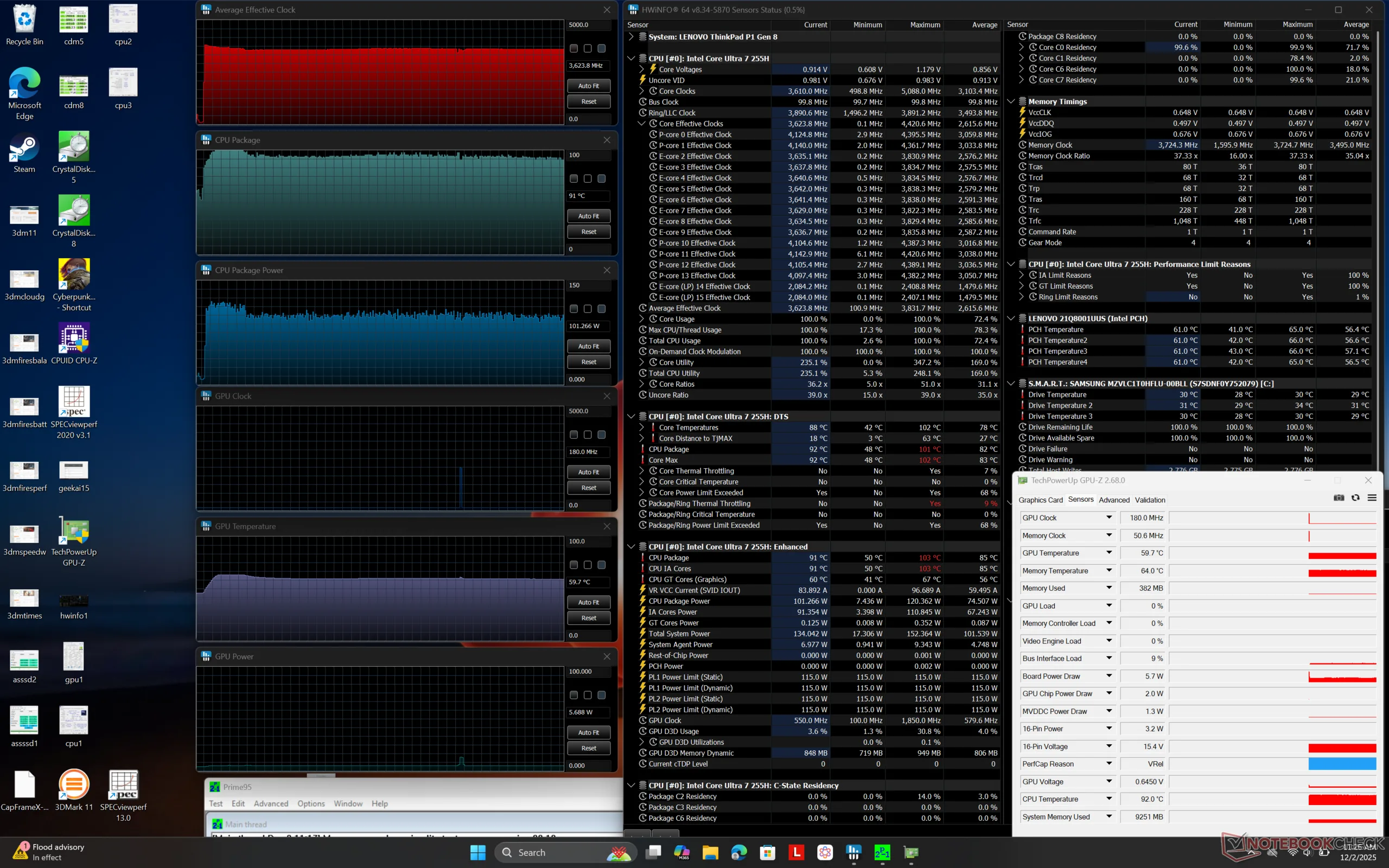 A CPU aumentaria para 3,8 GHz, 120 W e 100 C ao iniciar o estresse do Prime95, antes de cair um pouco e se estabilizar em 3,6 GHz e 101 W para manter uma temperatura de núcleo mais gerenciável de 91 C. O consumo de energia da placa da GPU salta de 63 W para quase 70 W ao alternar do modo balanceado para o modo de desempenho e, portanto, sugerimos a execução no modo de desempenho, apesar de suas temperaturas de núcleo ligeiramente mais altas de ~75 C. O clock da memória da GPU, em particular, salta de 1125 MHz para 1375 MHz ao alternar para o modo de desempenho.