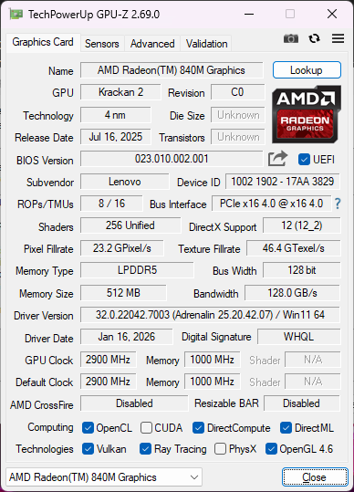 | Lenovo Yoga 7 2-in-1 16AGP11 AMD Ryzen AI 7 445 ⎘ AMD Radeon 840M ⎘ 24 GB Memória | Preço de tabela: 1250 USD | 1.8 kg | 15.85 mm | 16.00" 1920x1200 142 PPI OLED | |