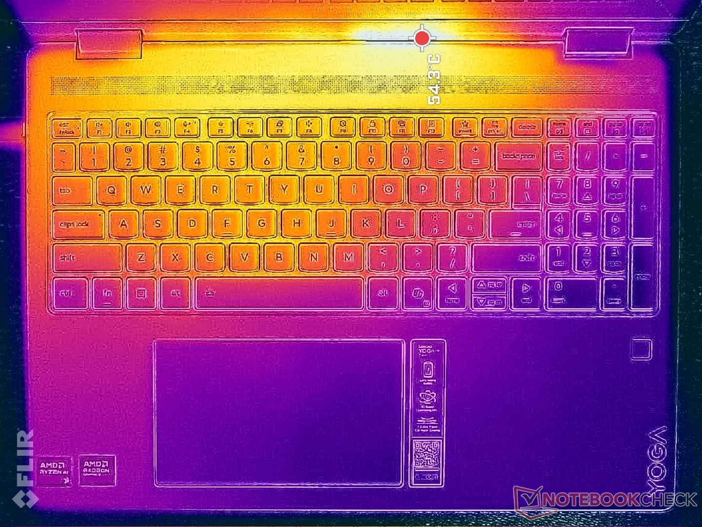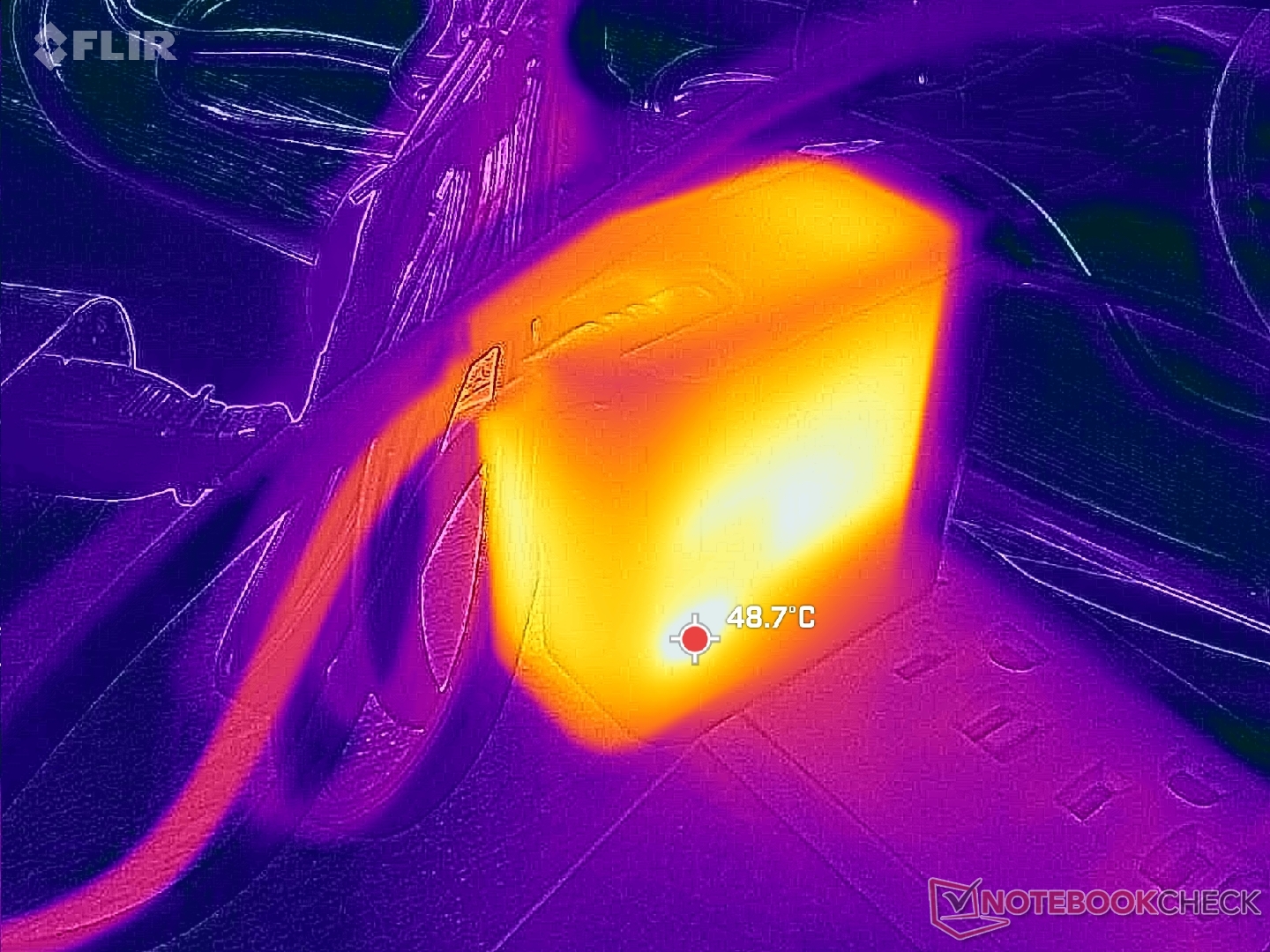As temperaturas da superfície podem ser mais quentes do que na configuração do Lunar Lake-V. Ao executar cargas exigentes, como jogos, por exemplo, os pontos quentes no deck do teclado e na tampa inferior podem chegar a mais de 48 °C e 45 °C, respectivamente, em comparação com 43 °C e 37 °C na opção Intel.