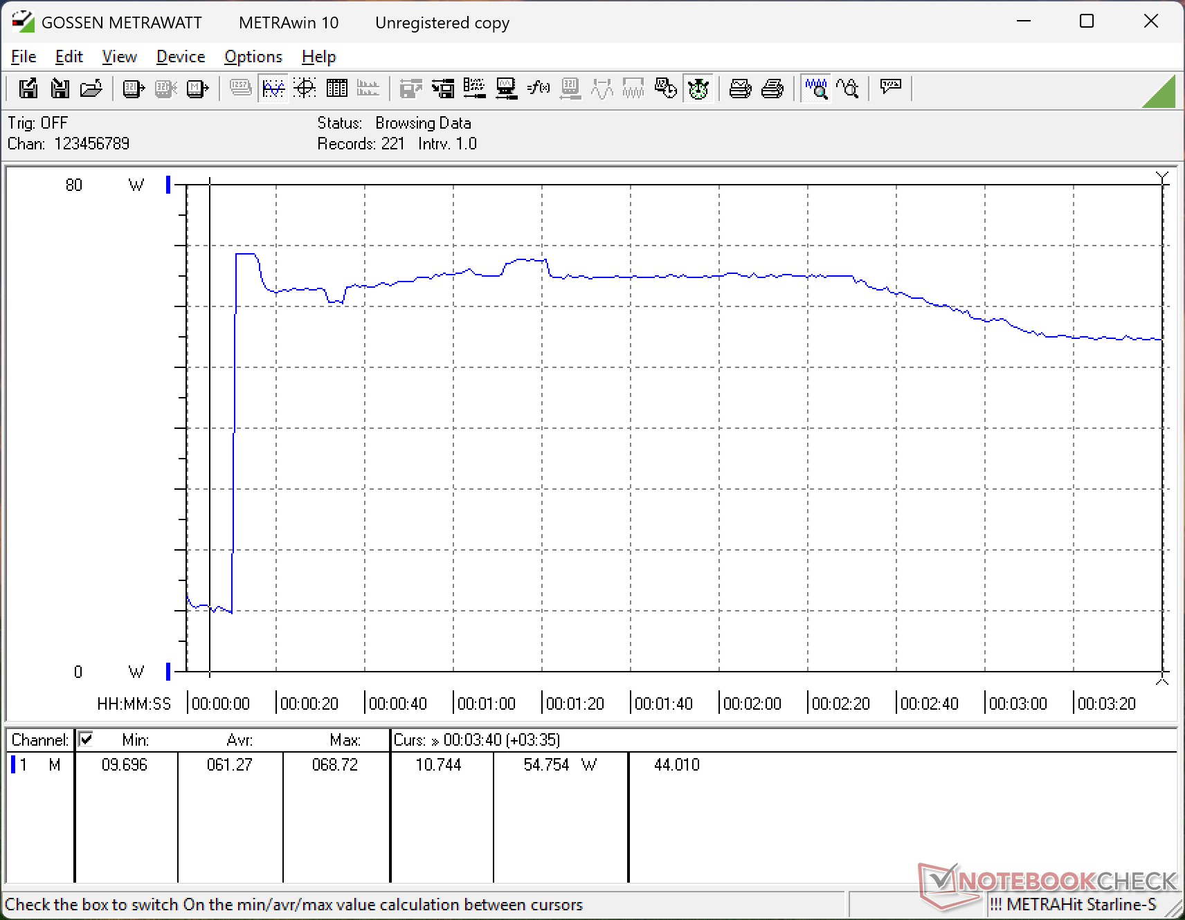 Conseguimos medir um consumo máximo temporário de 69 W do pequeno adaptador CA USB-C de 65 W (~5,5 x 5,5 x 2,9 cm) quando a CPU está totalmente estressada.