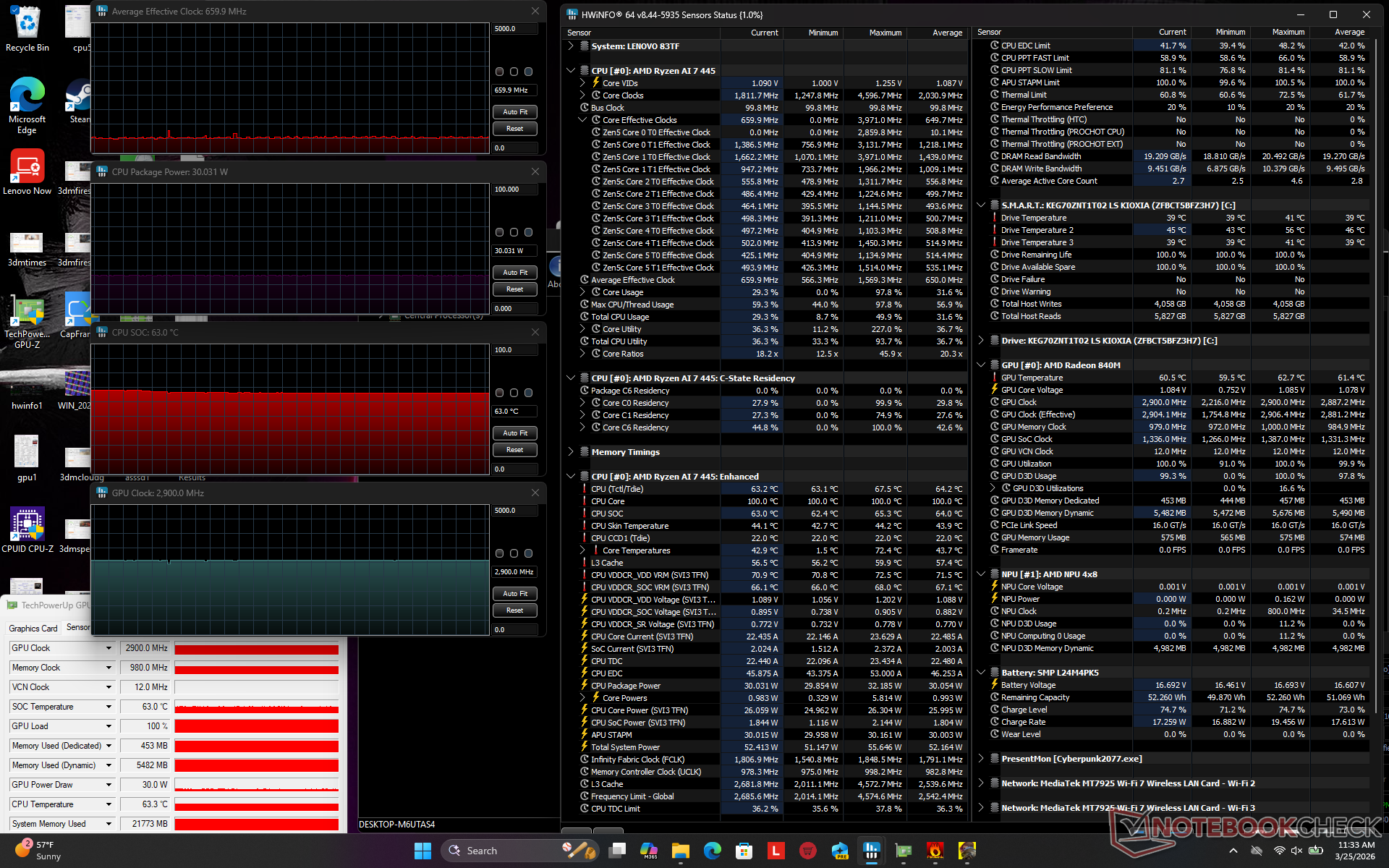A eficiência energética é nitidamente pior do que a do modelo Lunar Lake-V 2025, mesmo depois de considerar o desempenho multi-thread ligeiramente mais rápido do nosso modelo AMD. Ao executar o Prime95, por exemplo, nosso sistema AMD exigiria quase 40% mais energia para um aumento relativamente pequeno de 15% no desempenho. A vantagem é ainda maior a favor da Intel quando se compara o desempenho gráfico, pois nosso sistema AMD ainda consumiria mais energia ao executar o Cyberpunk 2077, apesar do fato de a iGPU do sistema Intel ser quase 2,5 vezes mais rápida.