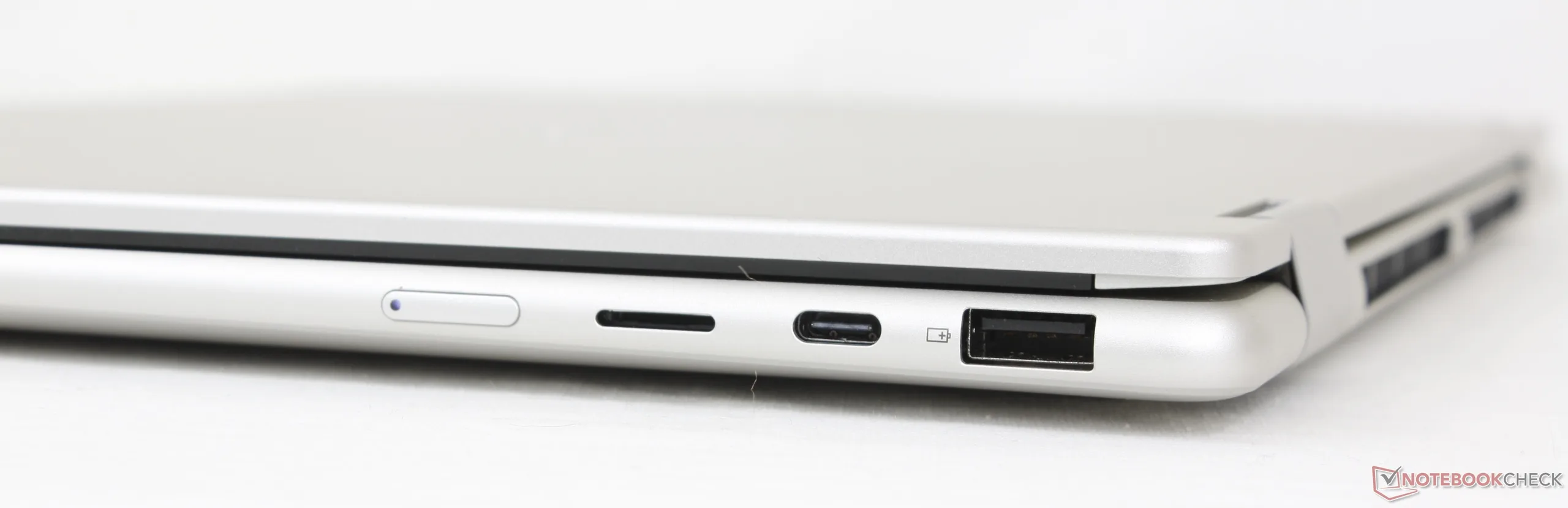 O Yoga 7 2 em 1 16 de 2026 adota o mesmo design externo do modelo 2025 e, portanto, todos os nossos comentários sobre o modelo do ano passado ainda se aplicam. Lembre-se de que, embora as opções de porta permaneçam as mesmas de antes, as portas USB-C do nosso modelo AMD não têm suporte para Thunderbolt e são limitadas a apenas 10 Gbps, enquanto as mesmas portas USB-C do modelo Intel 2025 são muito mais rápidas, com até 40 Gbps.