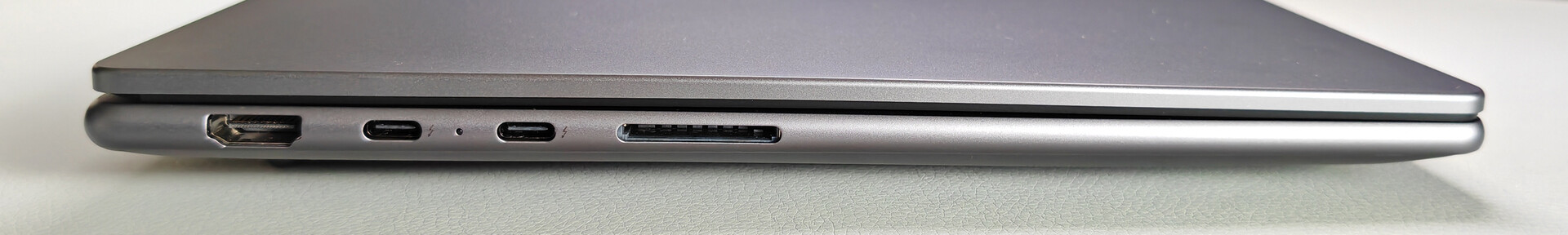 Nosso dispositivo de teste da Intel é cinza, mas, fora isso, o gabinete não é diferente da versão da AMD. Como esperado, o suporte Thunderbolt 4 é fornecido para as conexões, mas o leitor de cartão SD completo no lado esquerdo é um pouco mais surpreendente. As taxas de transferência são médias, de aproximadamente 80 MB/s, mas os cartões não podem ser inseridos muito longe e ficam muito soltos, o que faz com que os cartões de memória possam cair rapidamente.