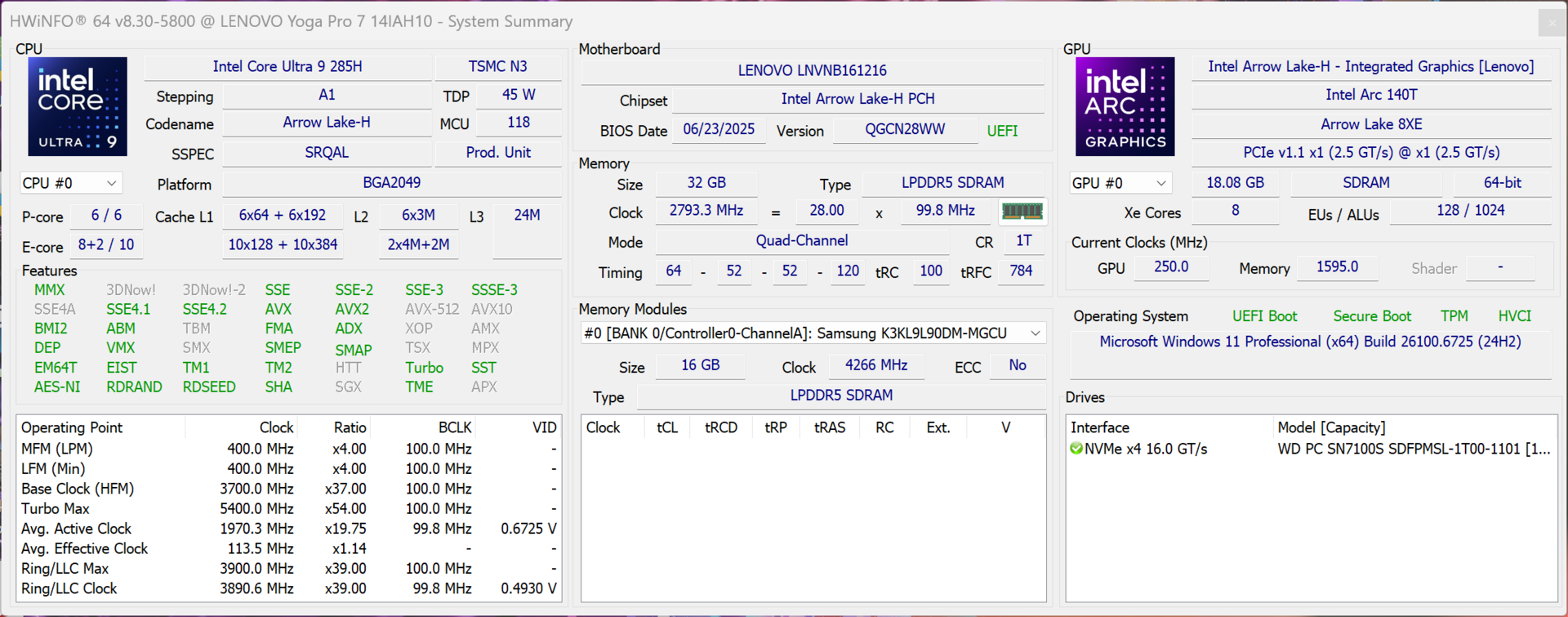 | Lenovo Yoga Pro 7 14IAH10 Ultra 9 285H, Arc 140T, WD PC SN7100S SDFPMSL-1T00-1101, OLED, 3000x1876, 14.5" | Samsung Galaxy Book5 Pro 14 940XHA Core Ultra 5 226V, Arc 130V, Samsung PM9C1 MZVL8512HELU, OLED, 2880x1800, 14" | Asus ZenBook 14 OLED UX3405CA, Ultra 7 255H Ultra 7 255H, Arc 140T, Samsung PM9C1 MZVL81T0HELB-00BTW, OLED, 1920x1200, 14" | Tuxedo Infinity Book Pro 14 Gen10 AMD Ryzen AI 9 HX 370, Radeon 890M, Crucial P3 Plus CT2000P3PSSD8 , IPS, 2880x1800, 14" | Dell 14 Premium Ultra 7 255H, Arc 140T, Kioxia BG6 KBG6AZNV1T02, OLED, 3200x2000, 14.5" | Lenovo Yoga Pro 7 14AKP G10 Ryzen AI 7 350, Radeon 860M, SK hynix PVC10 HFS001TEM4X182N, OLED, 2944x1840, 14.5" | Média Intel Arc Graphics 140T | Média da turma Office | |
