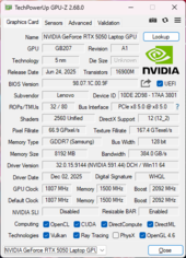Ao executar o Cyberpunk 2077, nossa RTX 5050 se estabilizaria em 82 W em comparação com 93 W e 98 W nas configurações RTX 5060 e 5070, respectivamente. Dessa forma, a temperatura média da GPU seria visivelmente mais baixa em cerca de 7 °C. Isso também explicaria as temperaturas mais baixas da superfície durante os jogos.