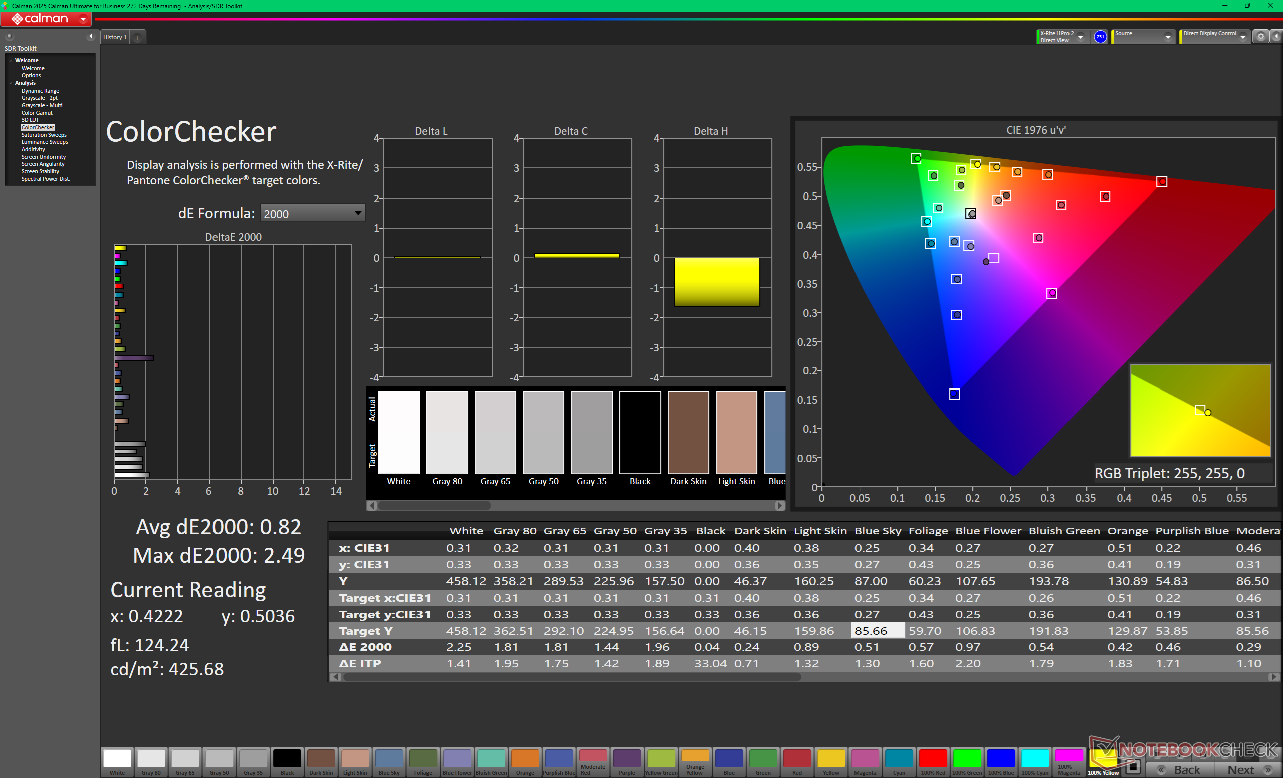 A tela vem bem calibrada em relação ao padrão P3 com valores médios de deltaE em escala de cinza e cor de apenas 0,6 e 2,21, respectivamente.