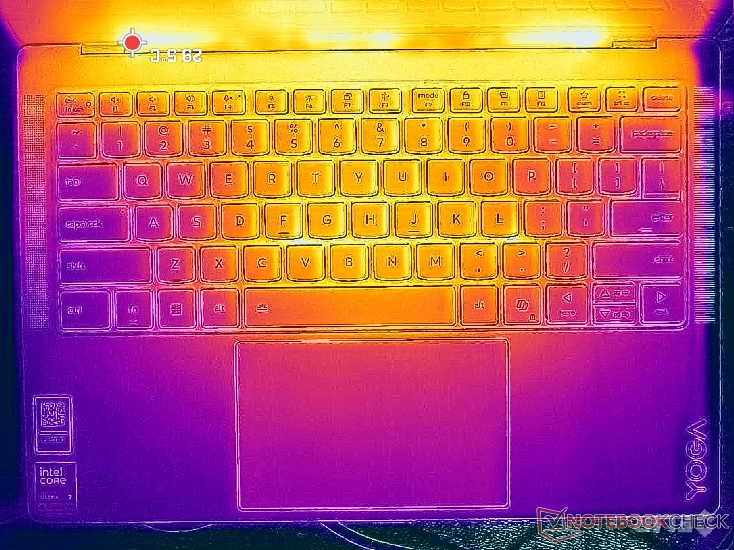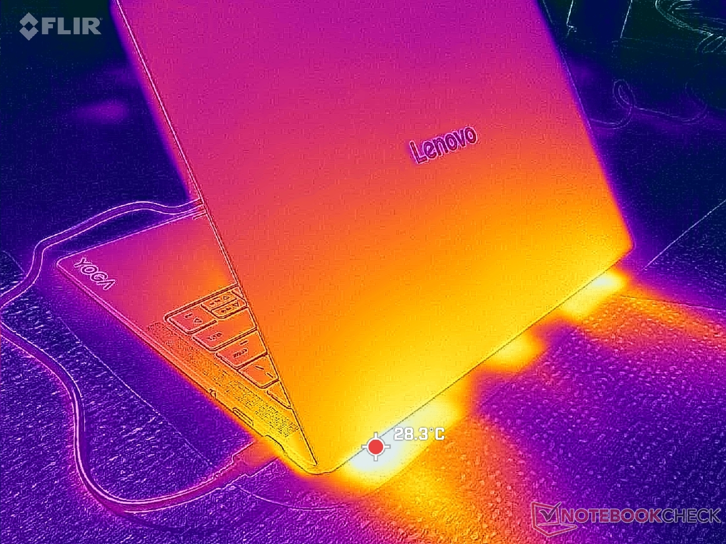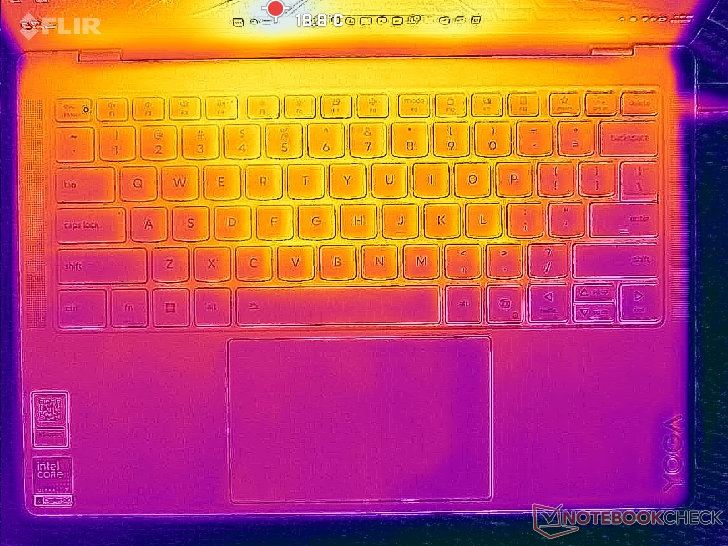 As temperaturas da superfície são relativamente baixas, mesmo com cargas exigentes. Os pontos quentes atingem apenas 34 °C, em comparação com mais de 43 °C no HP OmniBook Ultra 14.