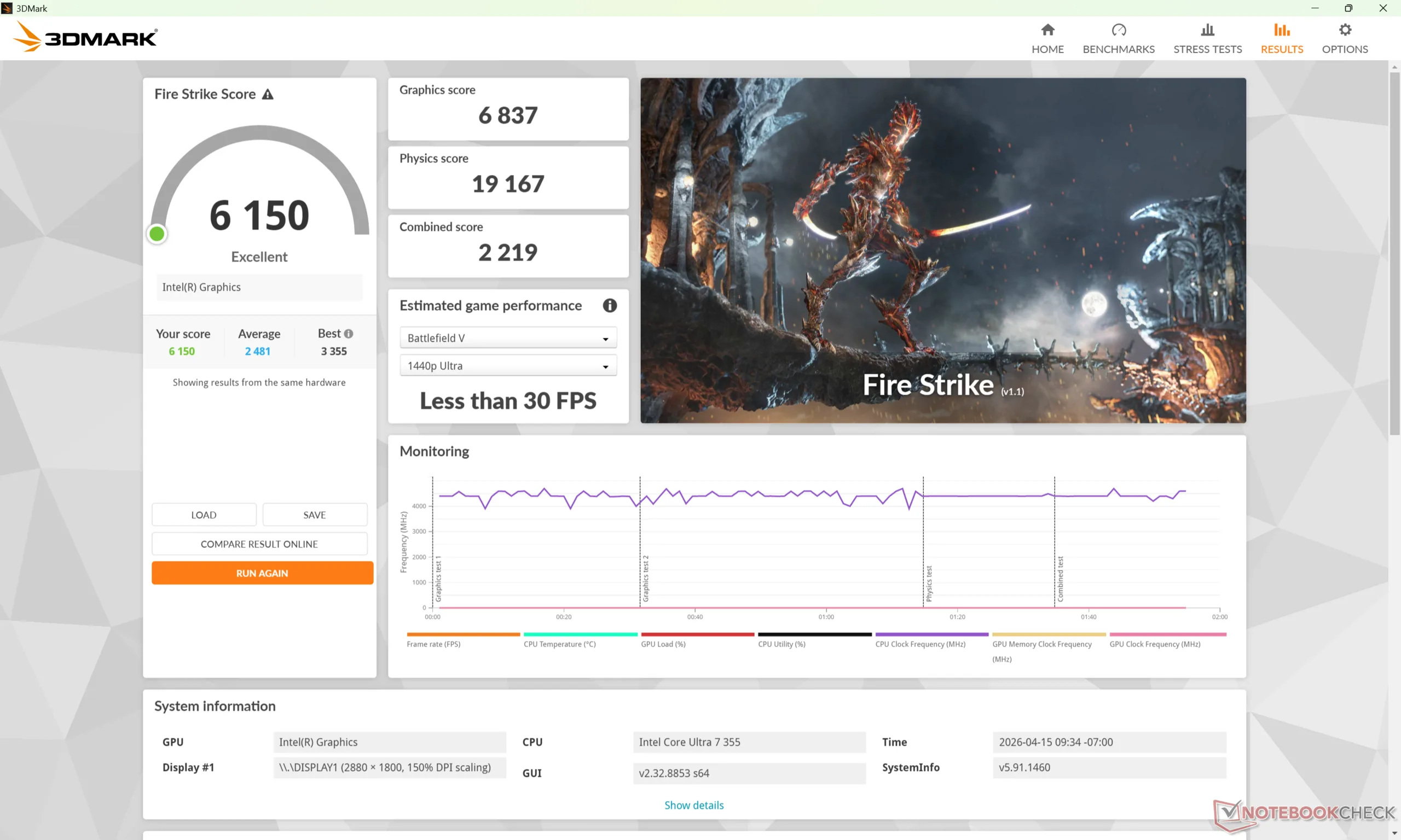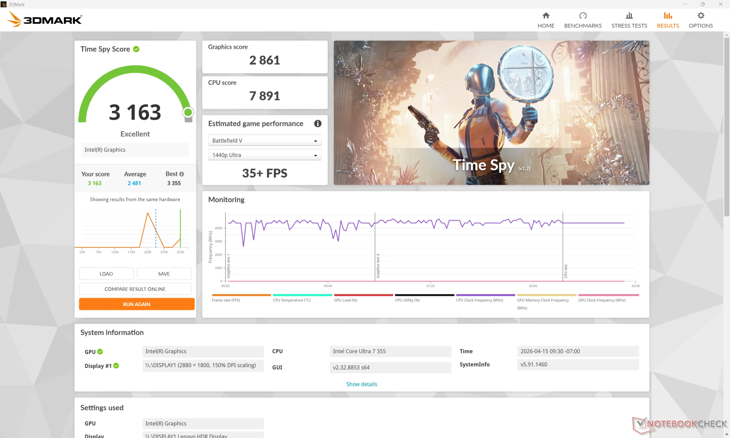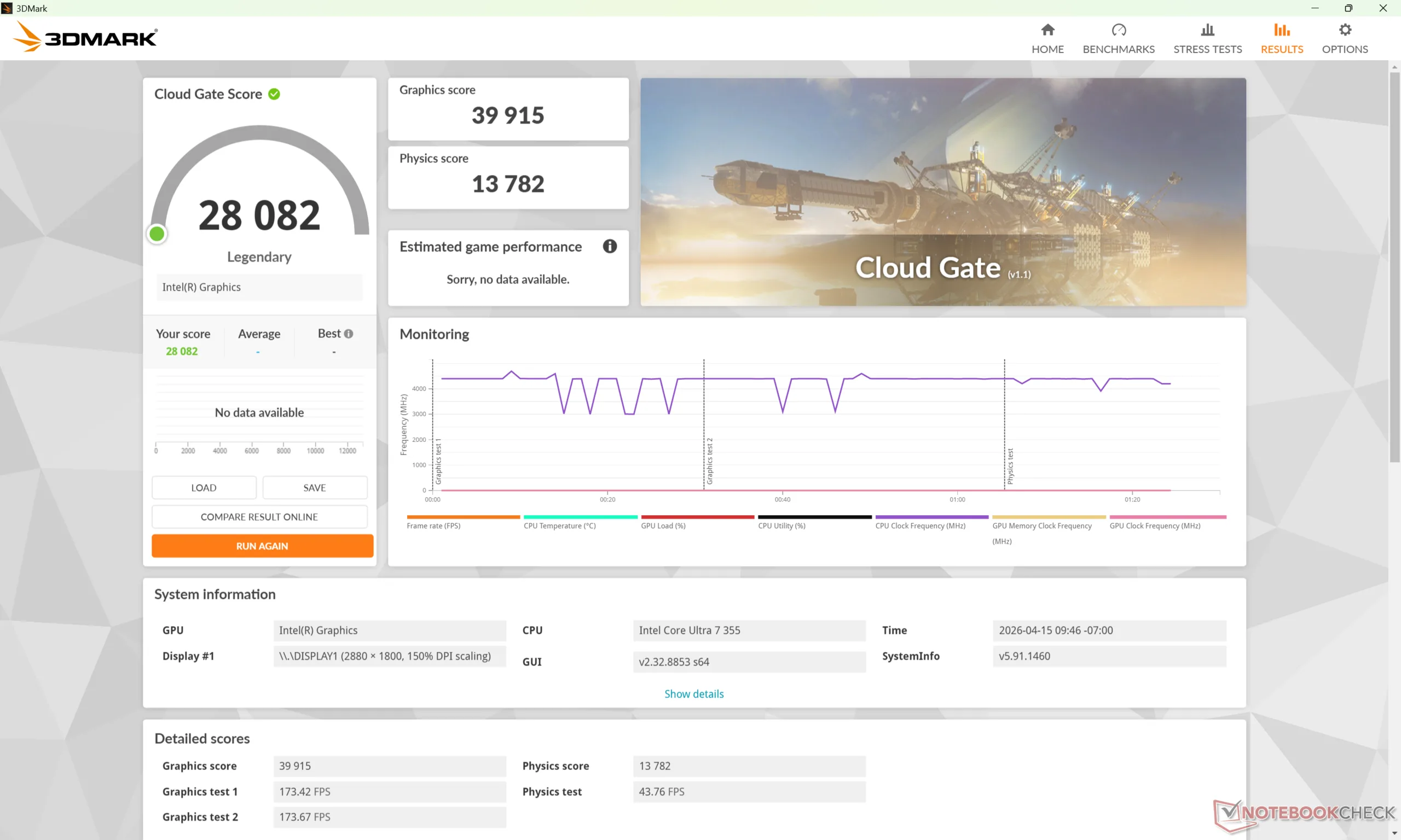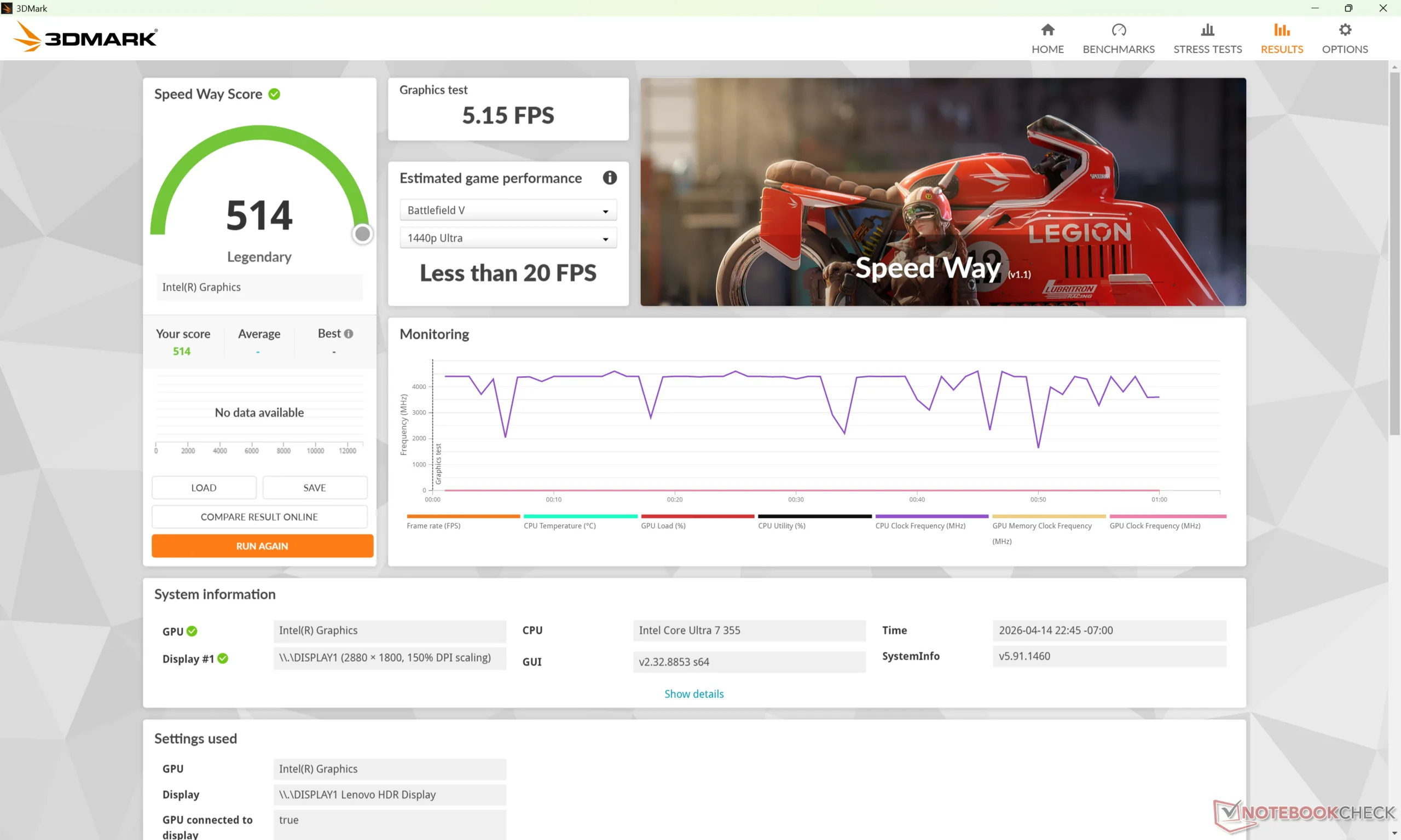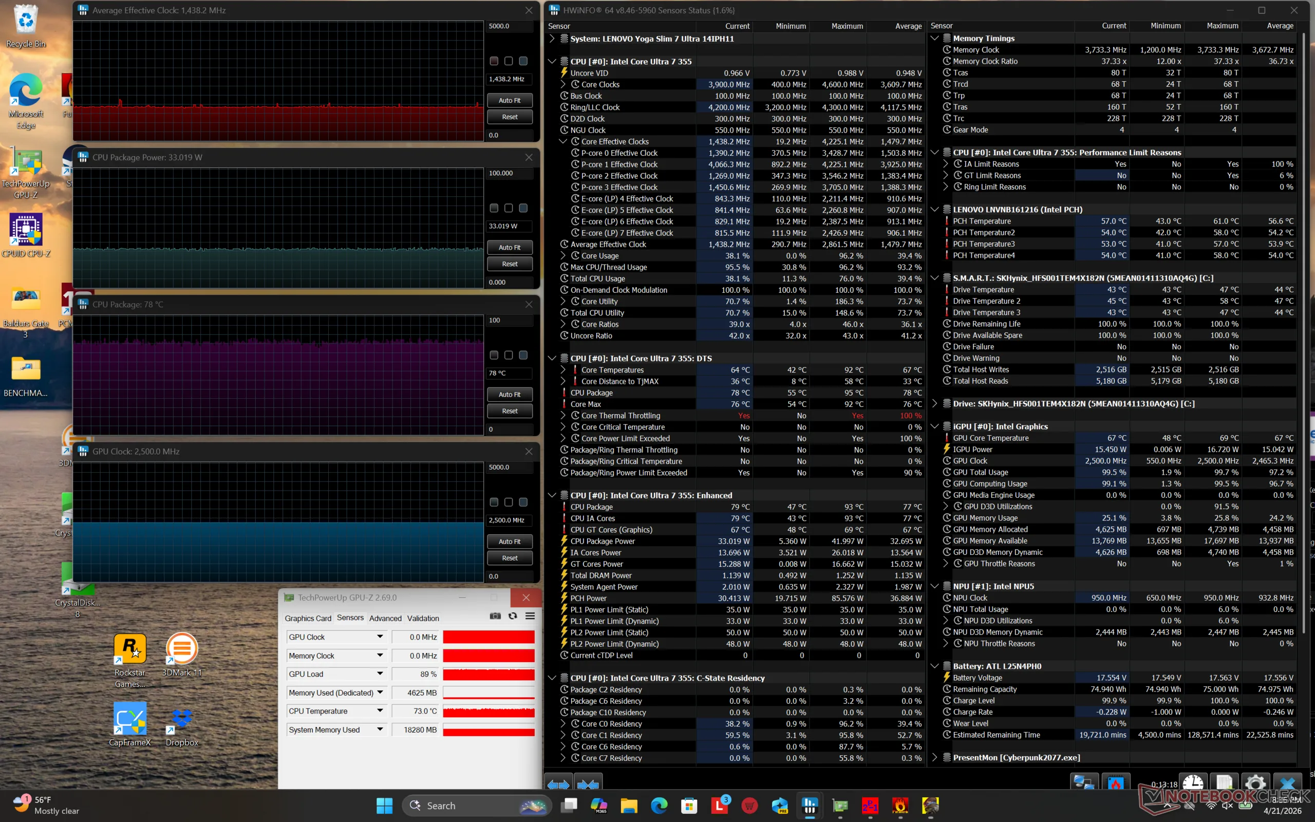 A taxa de clock e a temperatura da GPU ao executar o Cyberpunk 2077 se estabilizariam em 2500 MHz e 78 °C, respectivamente, que é quase exatamente o que registramos no concorrente XPS 14 em condições semelhantes.