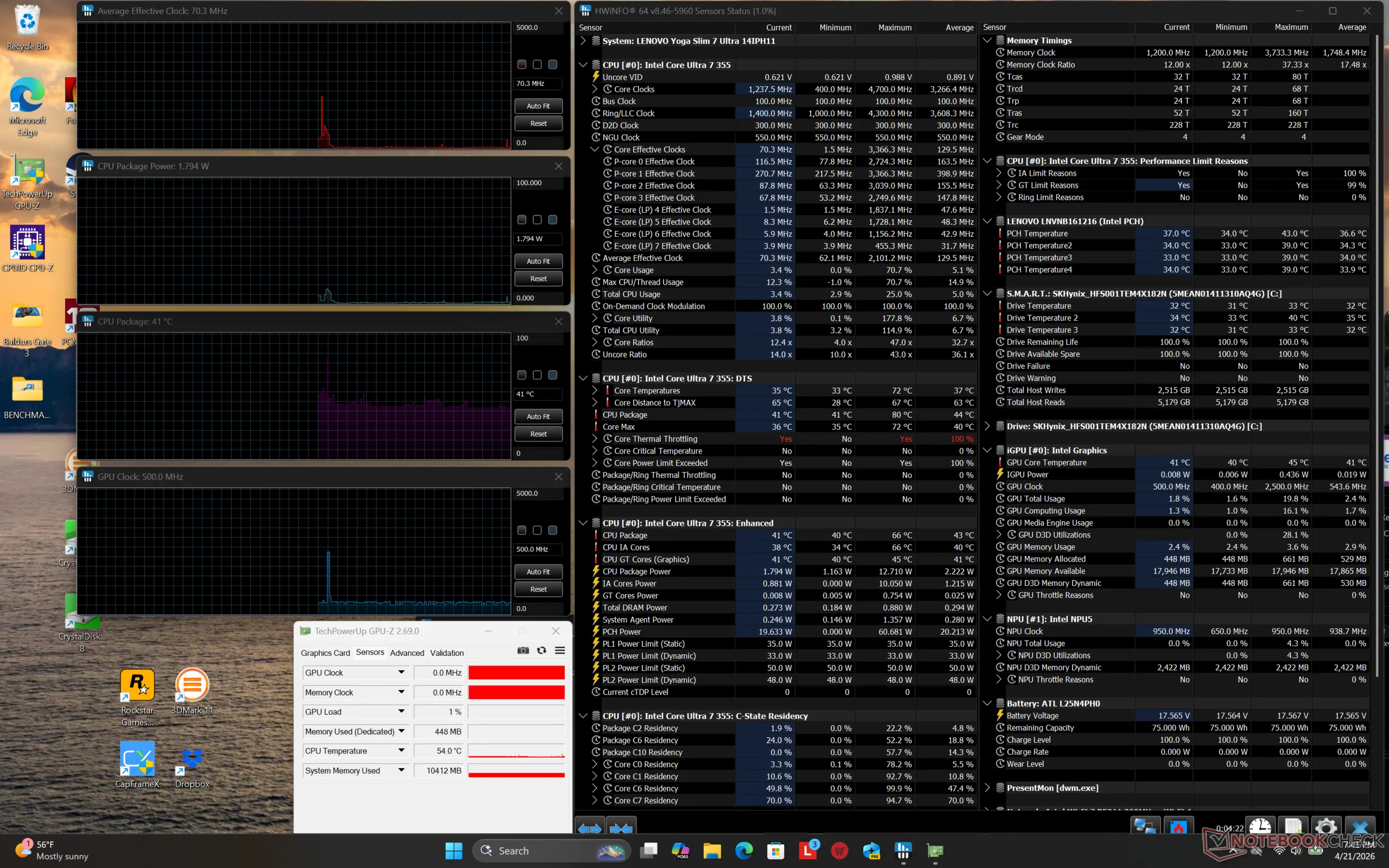 | Clock médio da CPU (GHz) | Clock da GPU (MHz) | Temperatura média da CPU (°C) | |