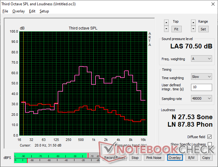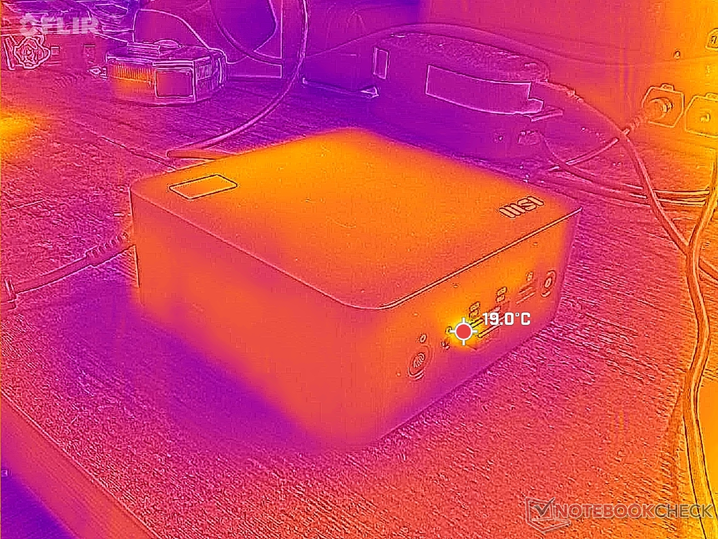 O ruído do ventilador fica em torno de 25 dB(A) no modo Silent ou 36 dB(A) relativamente alto no modo Performance. Em geral, o sistema é mais barulhento do que o observado no antigo Cubi 1M.