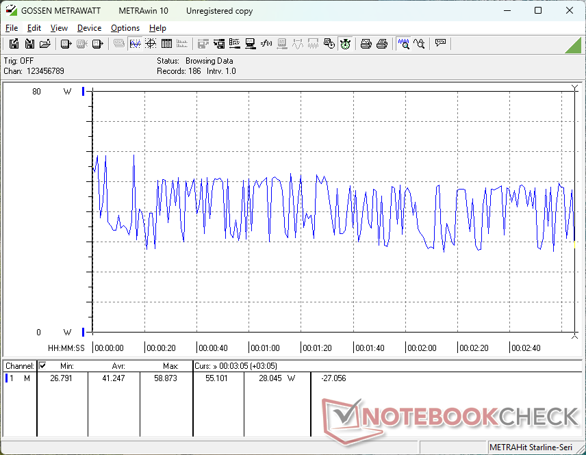 O consumo durante a execução do Cyberpunk 2077 oscilava entre 28 W e 49 W, aparentemente sem motivo, o que se alinha com nossas taxas de quadros instáveis e taxas de clock da GPU mencionadas acima.